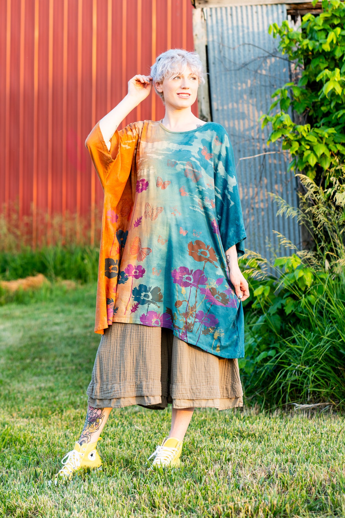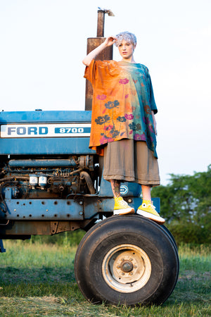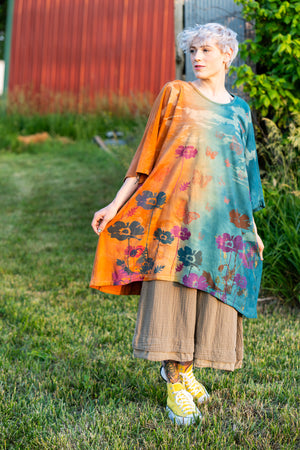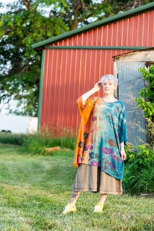 Artisan processes; all Blue Fish is made in the USA...this one has been double dyed then hand printed in layers of color. The square shape is soft, flowy, & flattering on many body types. This tunic can be anything you want it to be. Let your imagination out to play!