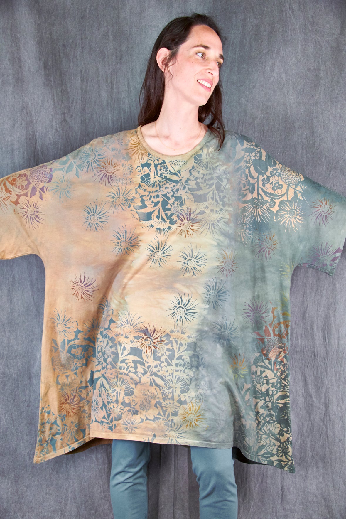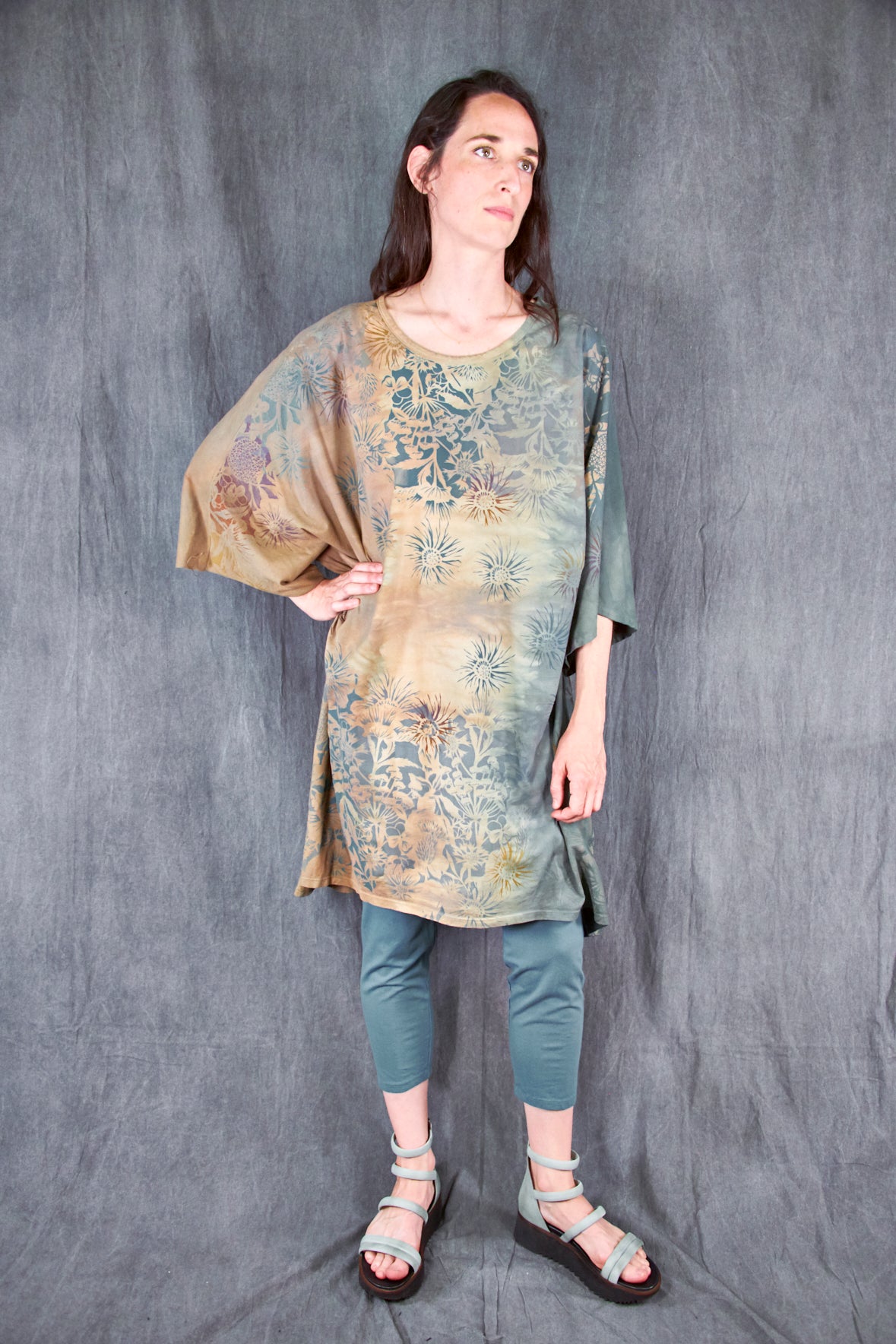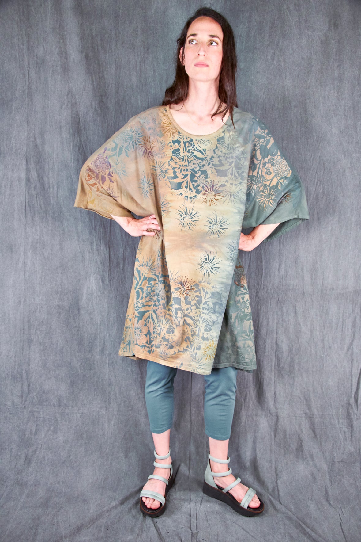 The colors are richer and more vibrant than the photo shows. The square shape is soft, flowy, & flattering on many body types. Wear yours like a tee with pants--like a tunic with leggings--dress it up with a necklace, skirt, & cool shoes. This tunic can be anything you want it to be. Let your imagination out to play!