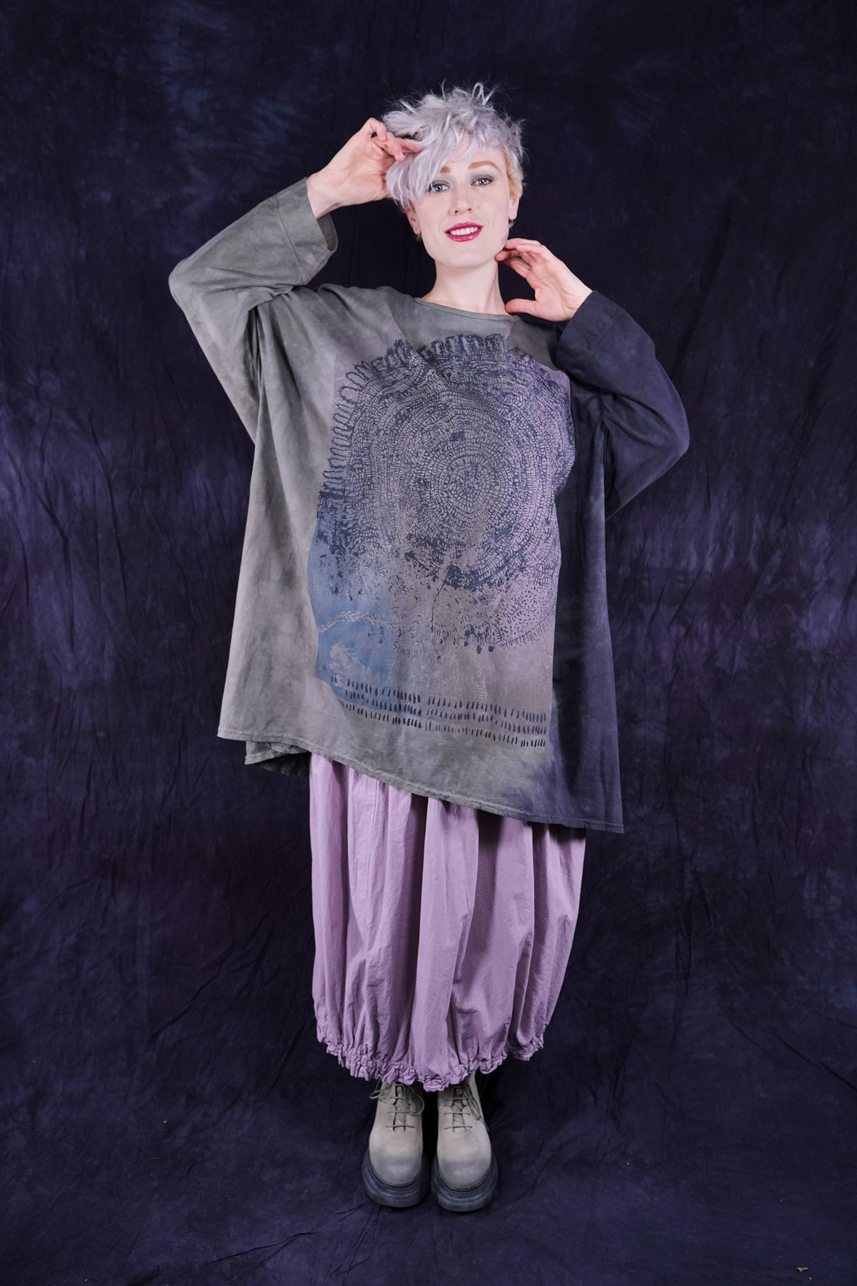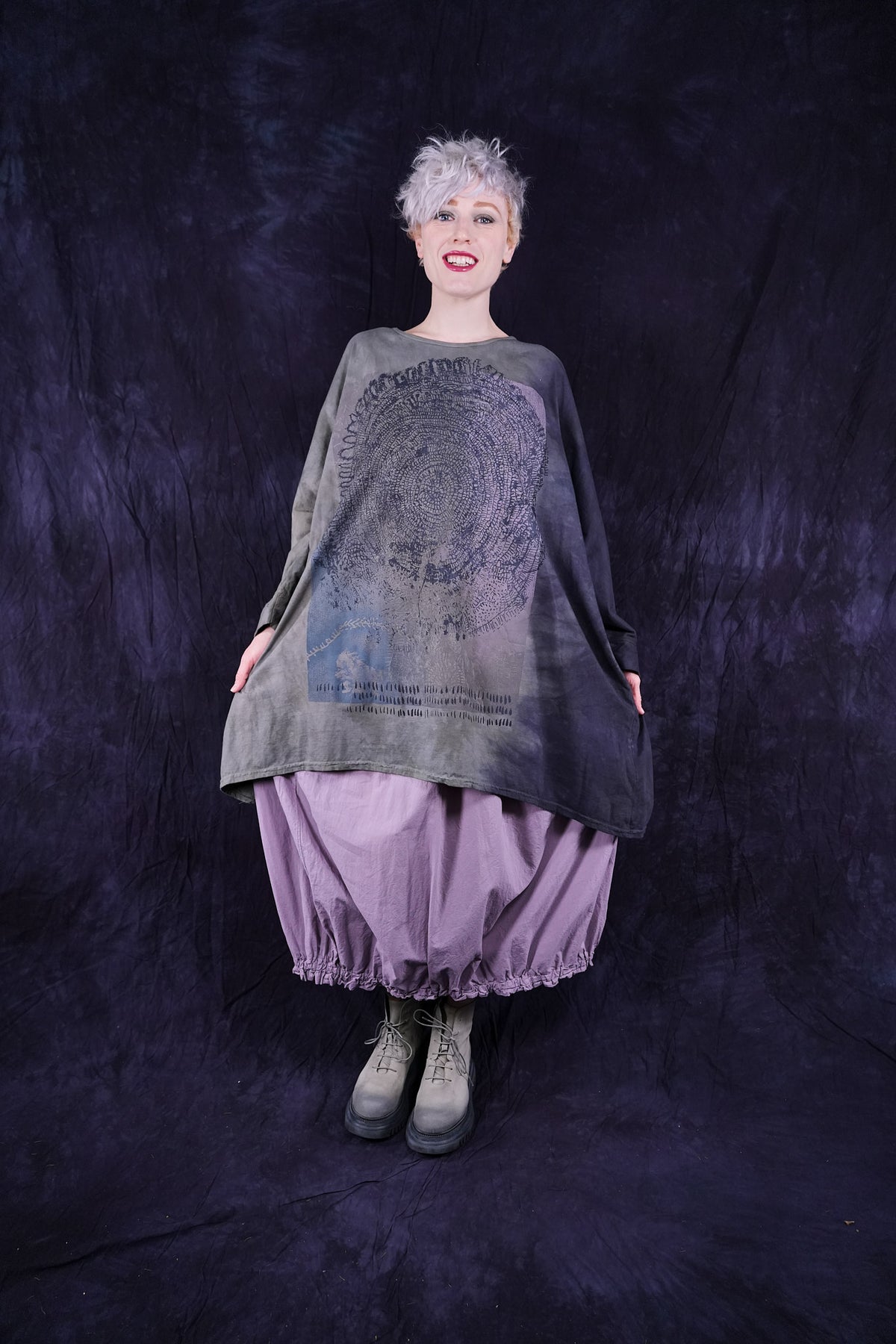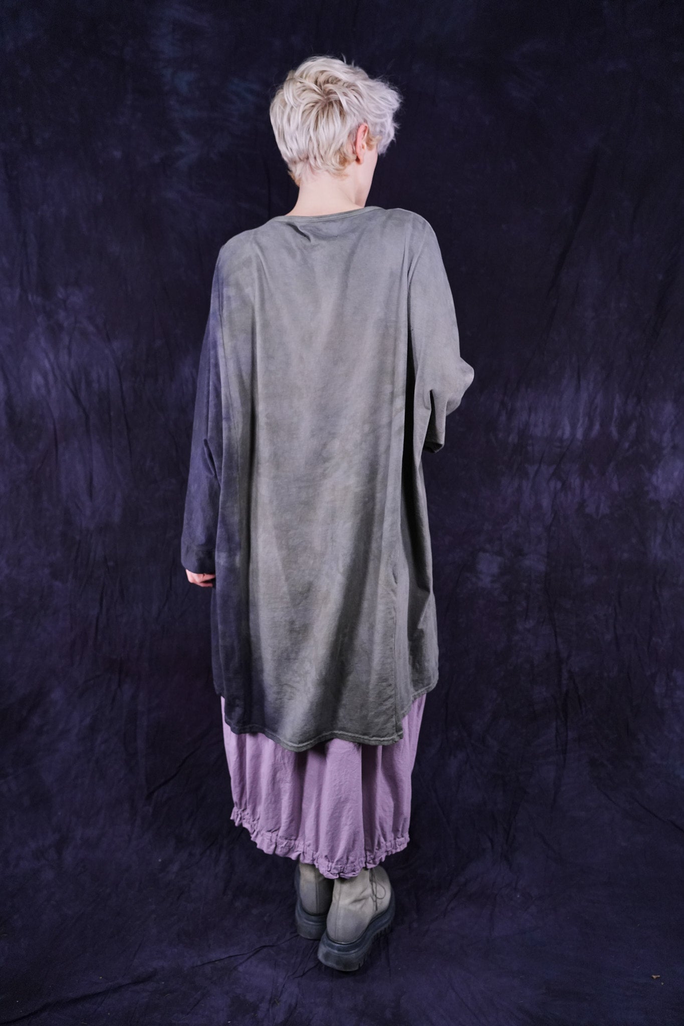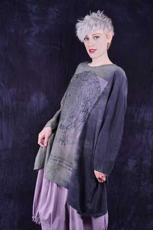 This ONE-SIZE oversized loose organic cotton tee/tunic is a new style we think you'll love. It is a canvas for out limited edition artful prints. It is 3 inches longer in the back at the hem, sleeves come past the elbow. Long...hits approximately a few inches above the knee.