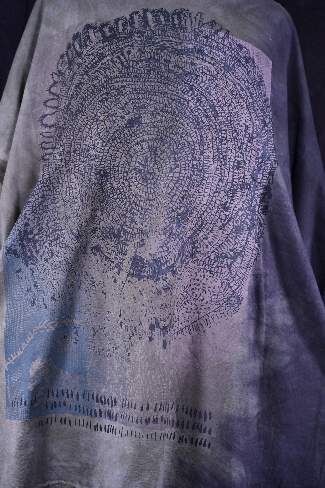 Layered prints created by hand, cover the front from seam to seam and neck to hem