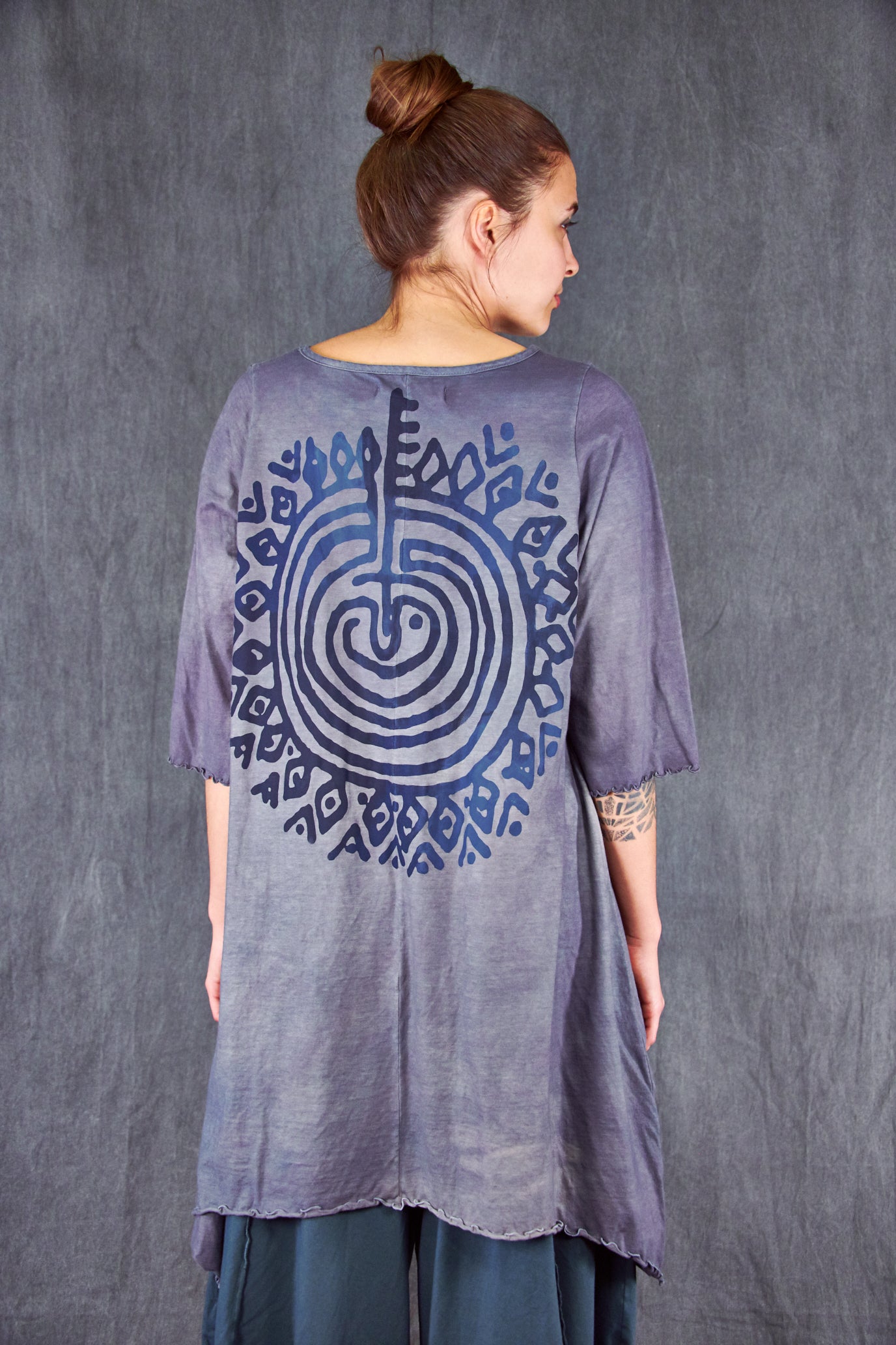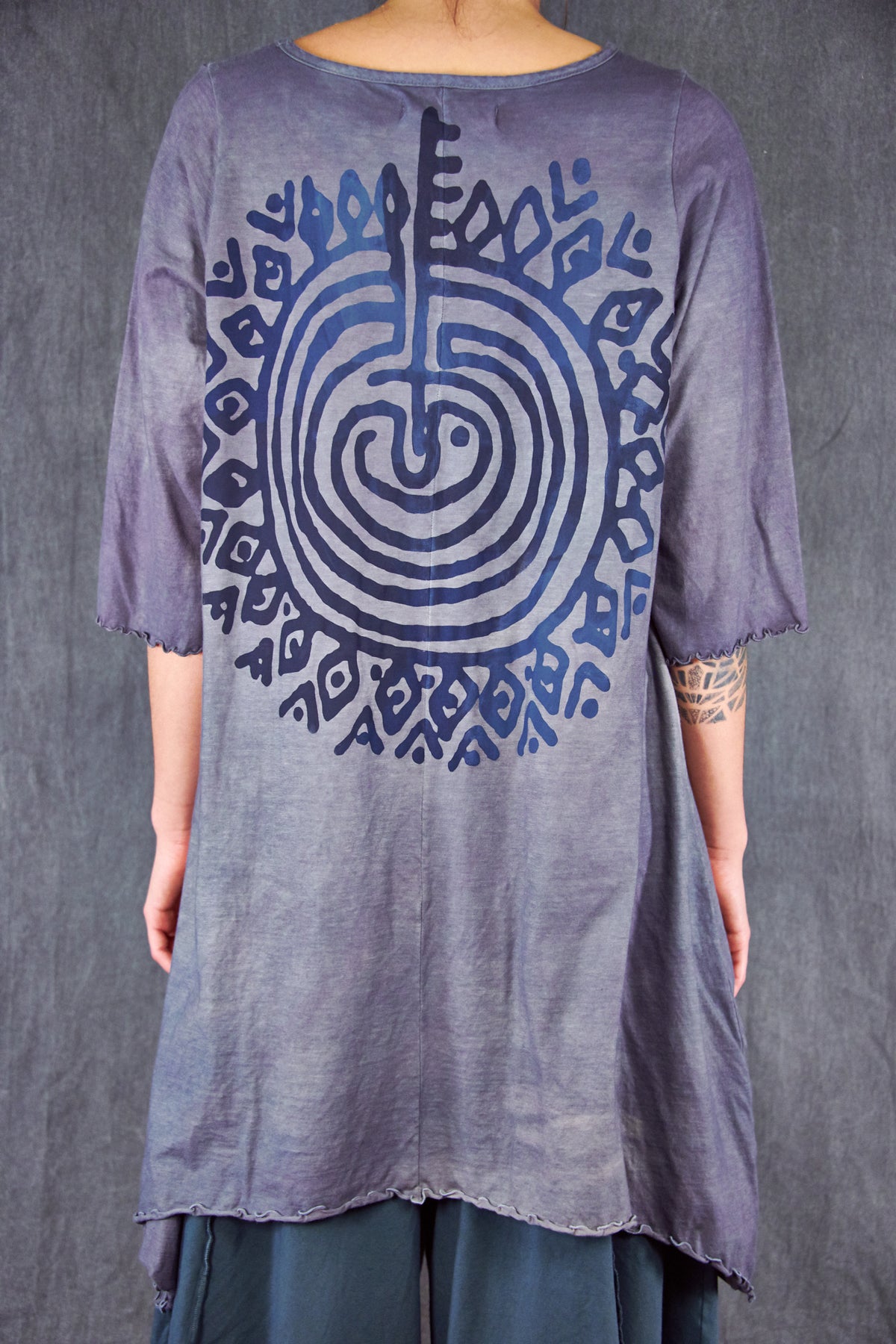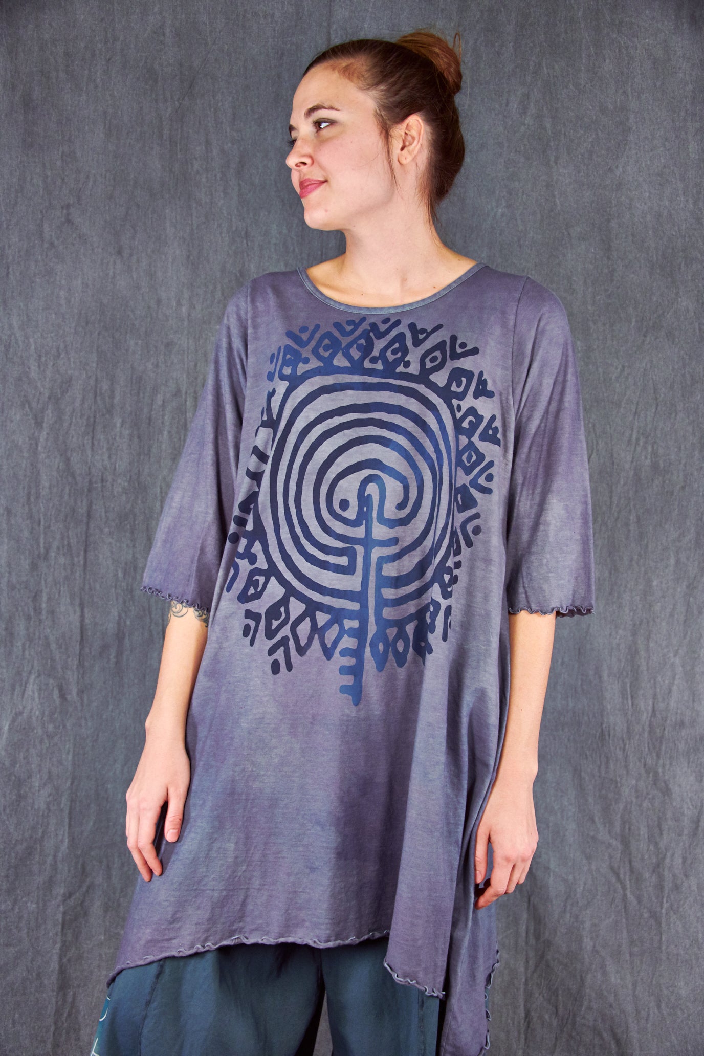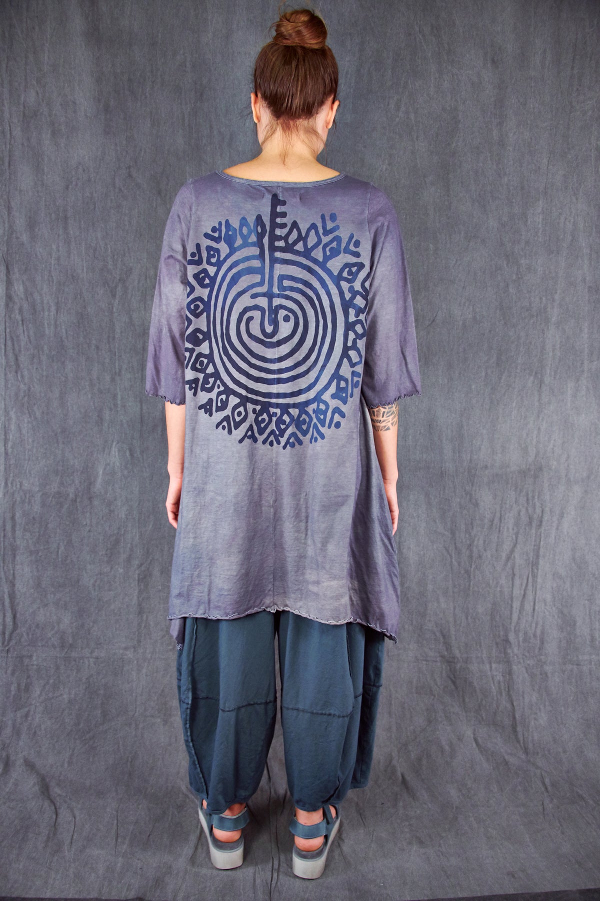 This hand-dyed Summer Swing Tunic is a new style that's an easy flattering style for anyone who loves the fit of our cafe tee. We love the color; hand dyed grey with undertones of purples and blues has a subtle texture... and the print design cannot be beat, a perfect labyrinth carefully gradated on the front and the back.