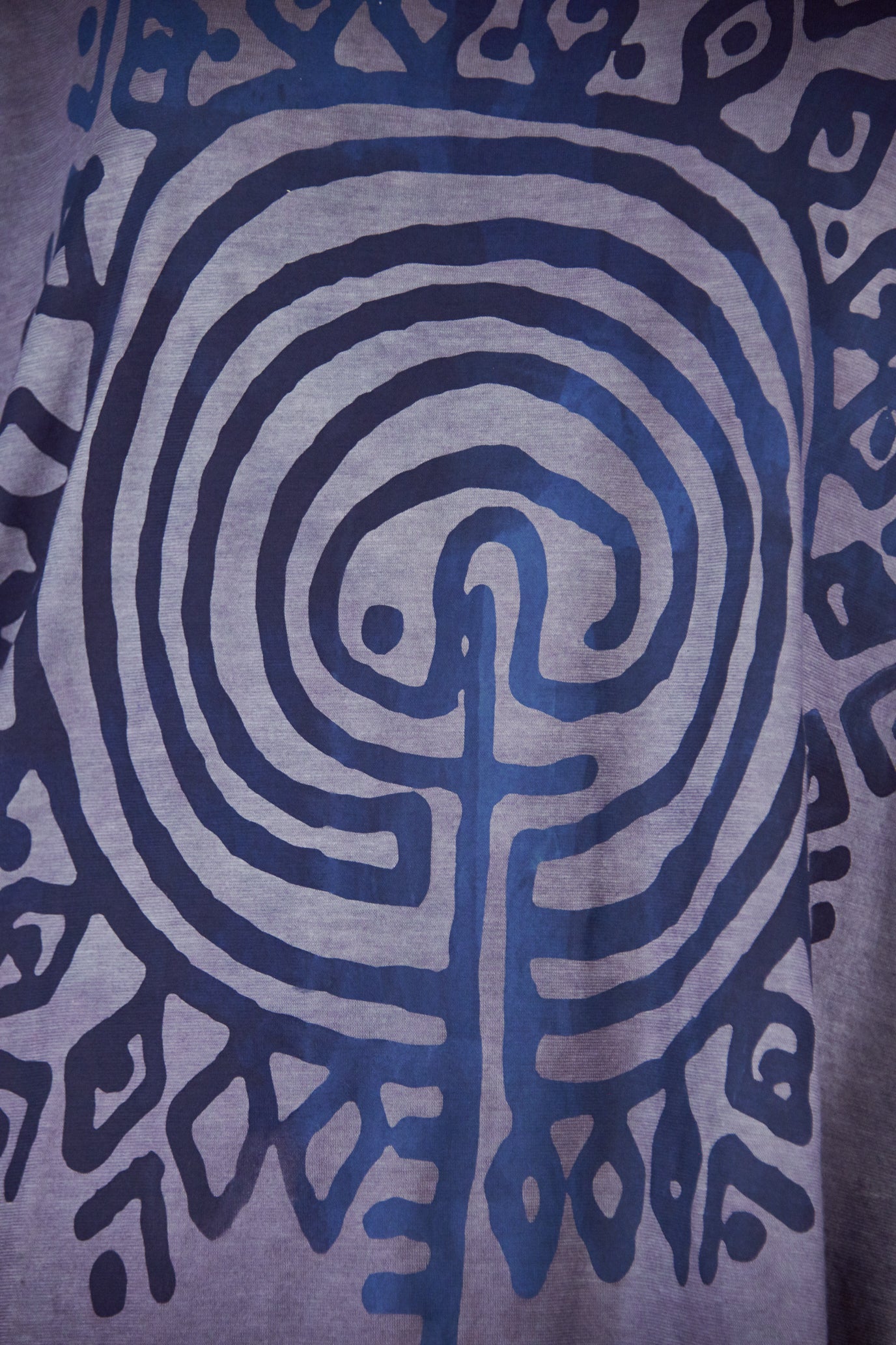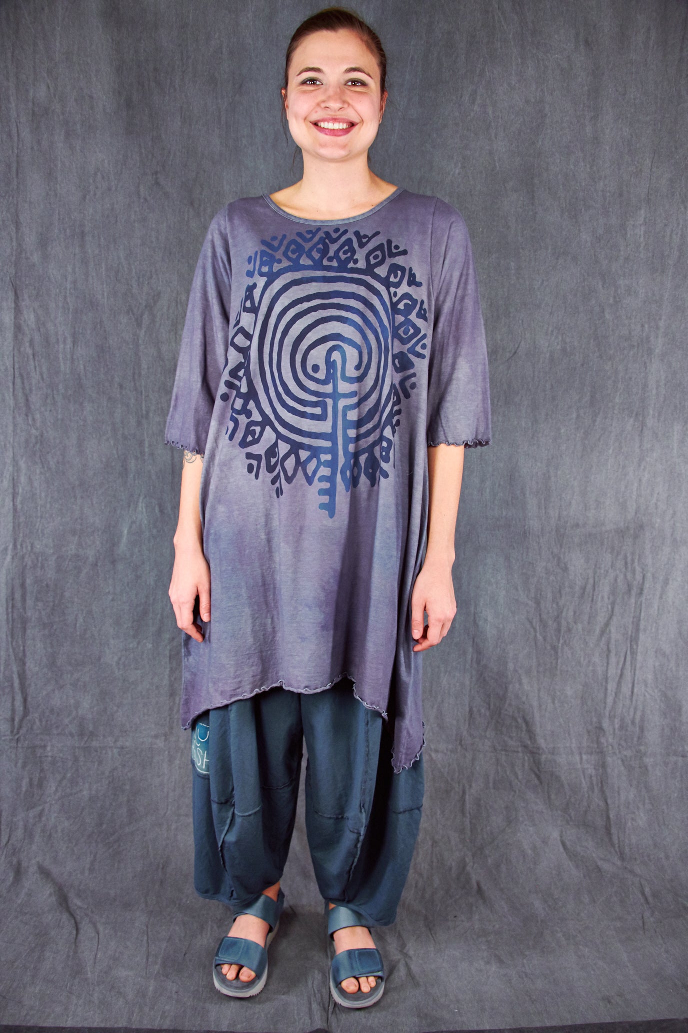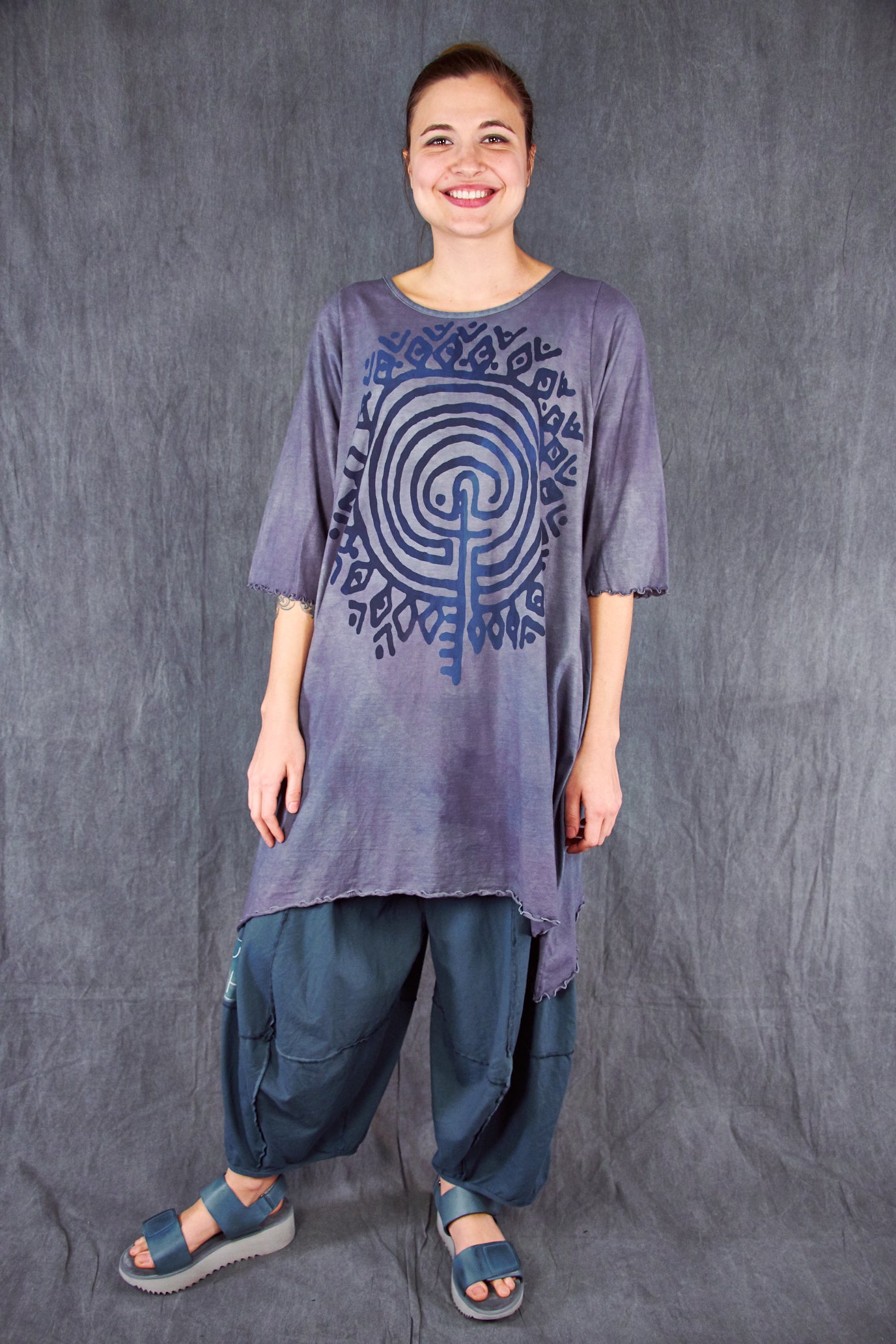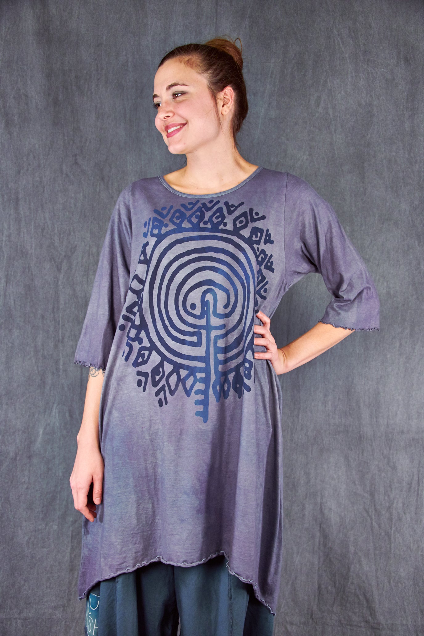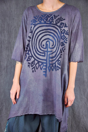 This hand-dyed Summer Swing Tunic is a new style that's an easy flattering style for anyone who loves the fit of our cafe tee. We love the color; hand dyed grey with undertones of purples and blues has a subtle texture... and the print design cannot be beat, a perfect labyrinth carefully gradated on the front and the back.