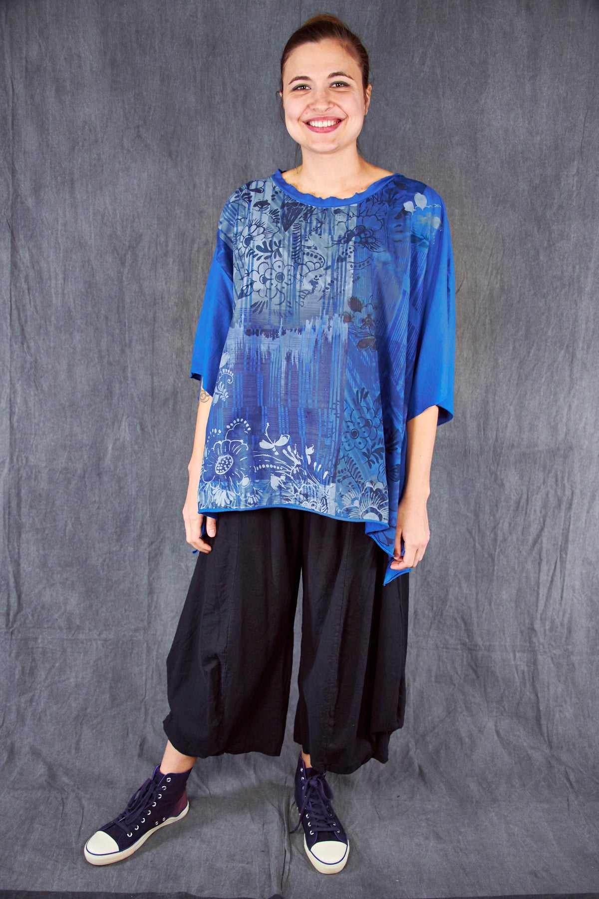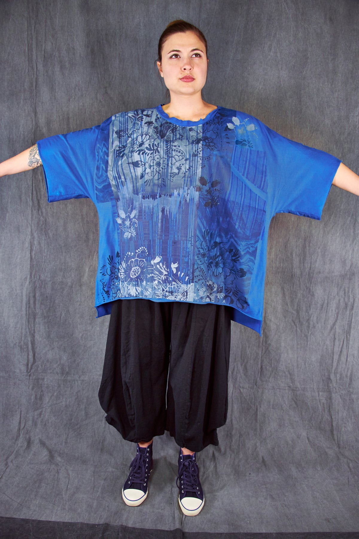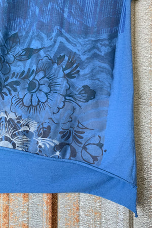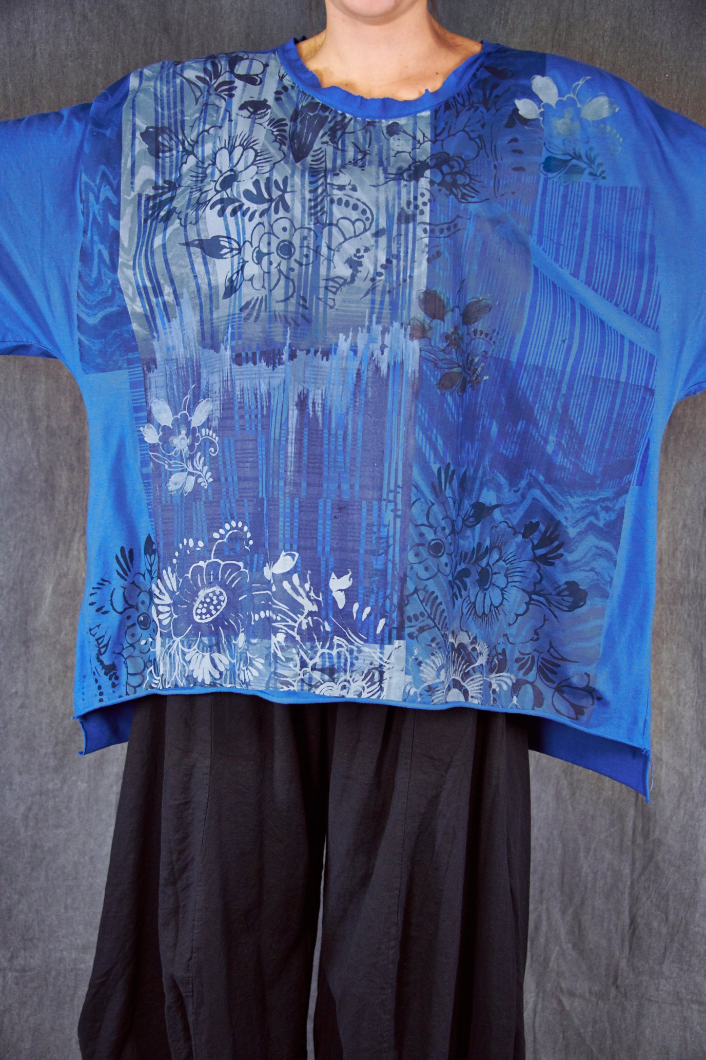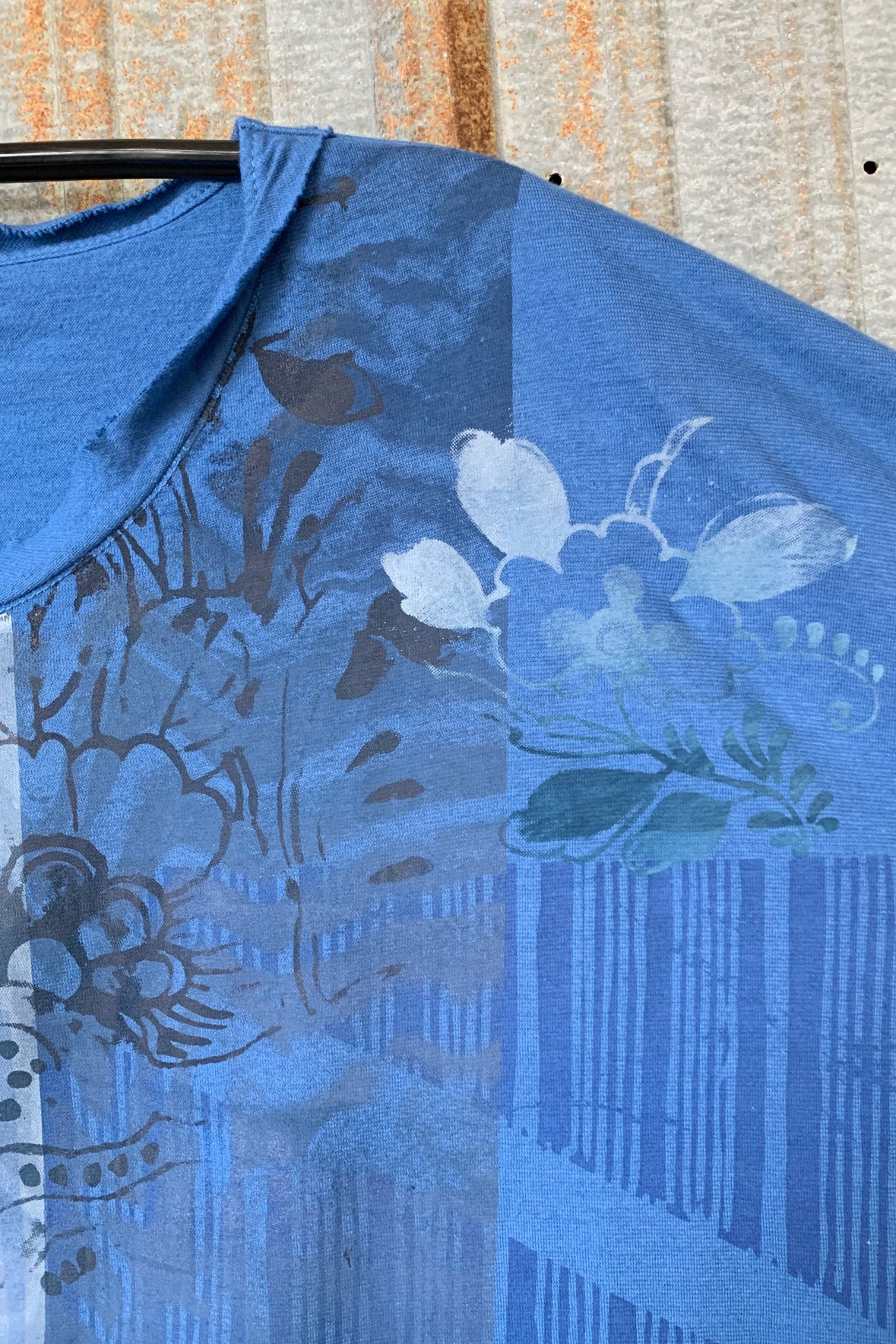 Hand printed/painted designs inspired by digs where multi- shades of blue painted pottery have been unearthed- buried treasure! A light and airy slight hi/lo with a soft double raw edge color, a wide one size essential summer tee.