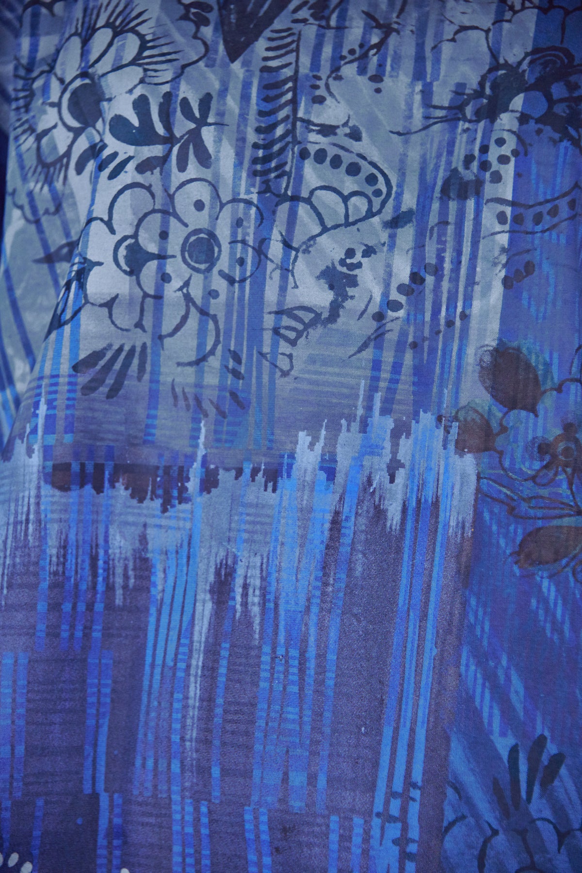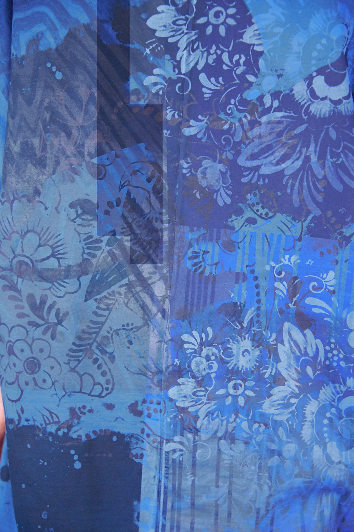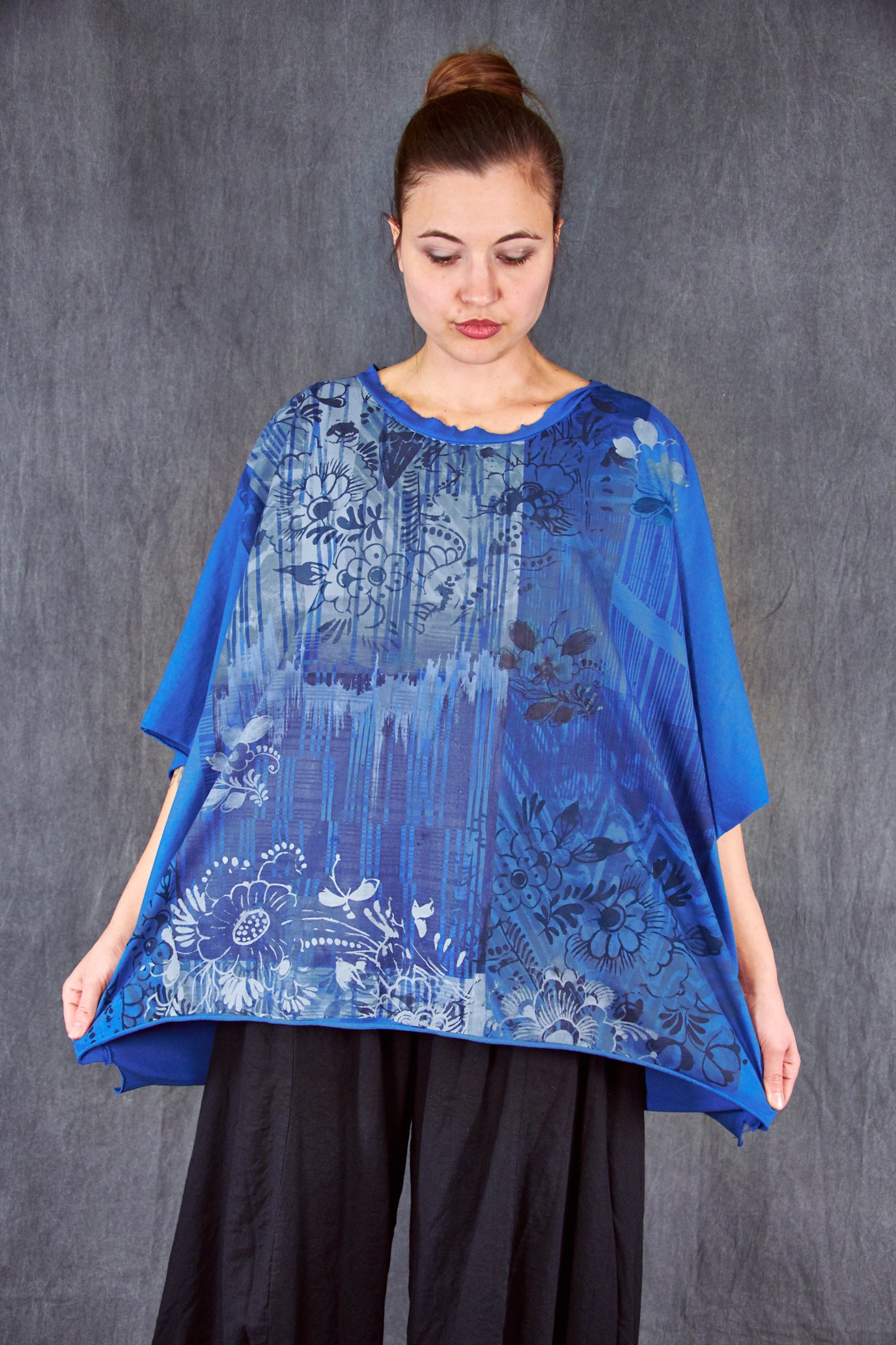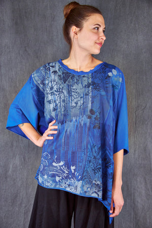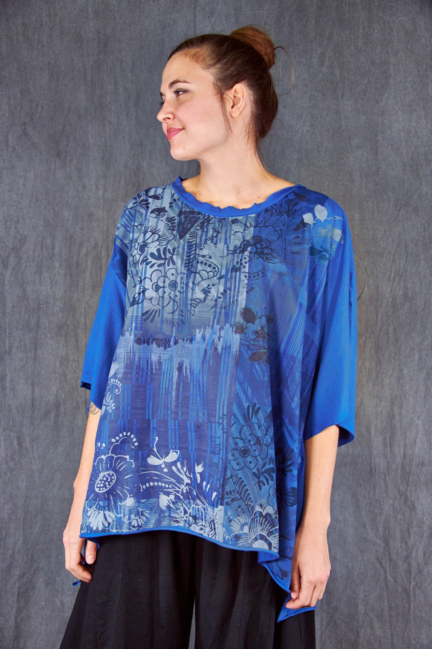 Hand printed/painted designs inspired by digs where multi- shades of blue painted pottery have been unearthed- buried treasure! A light and airy slight hi/lo with a soft double raw edge color, a wide one size essential summer tee.