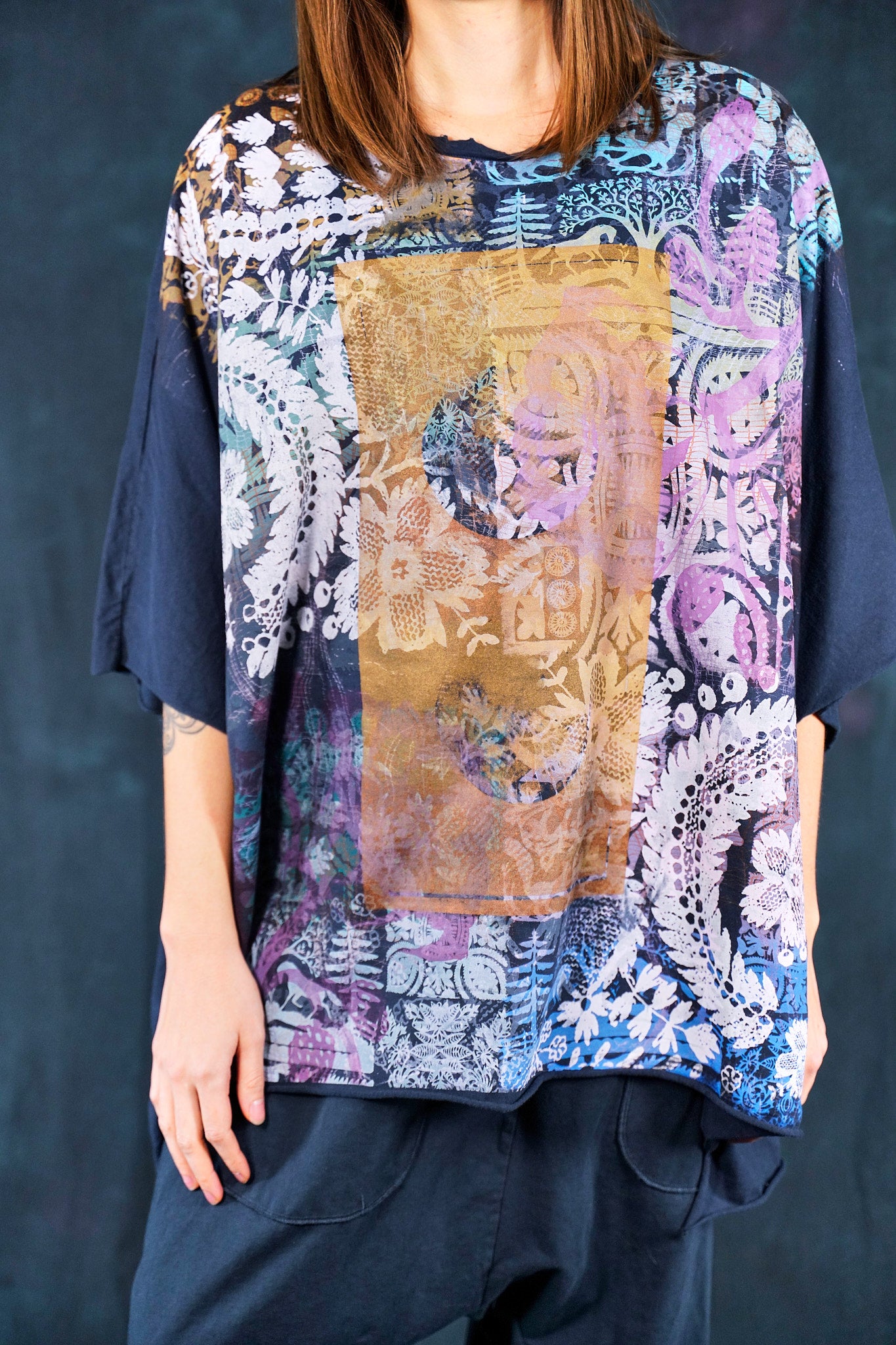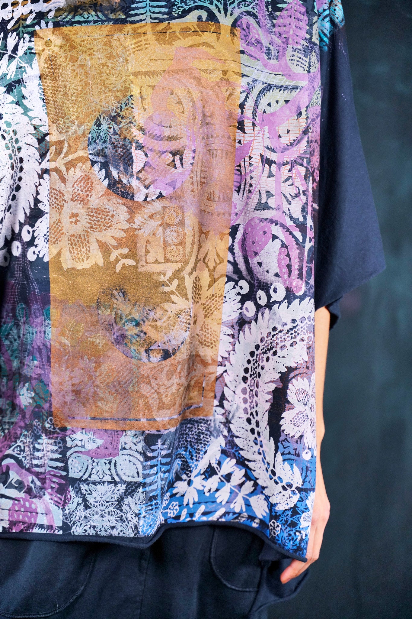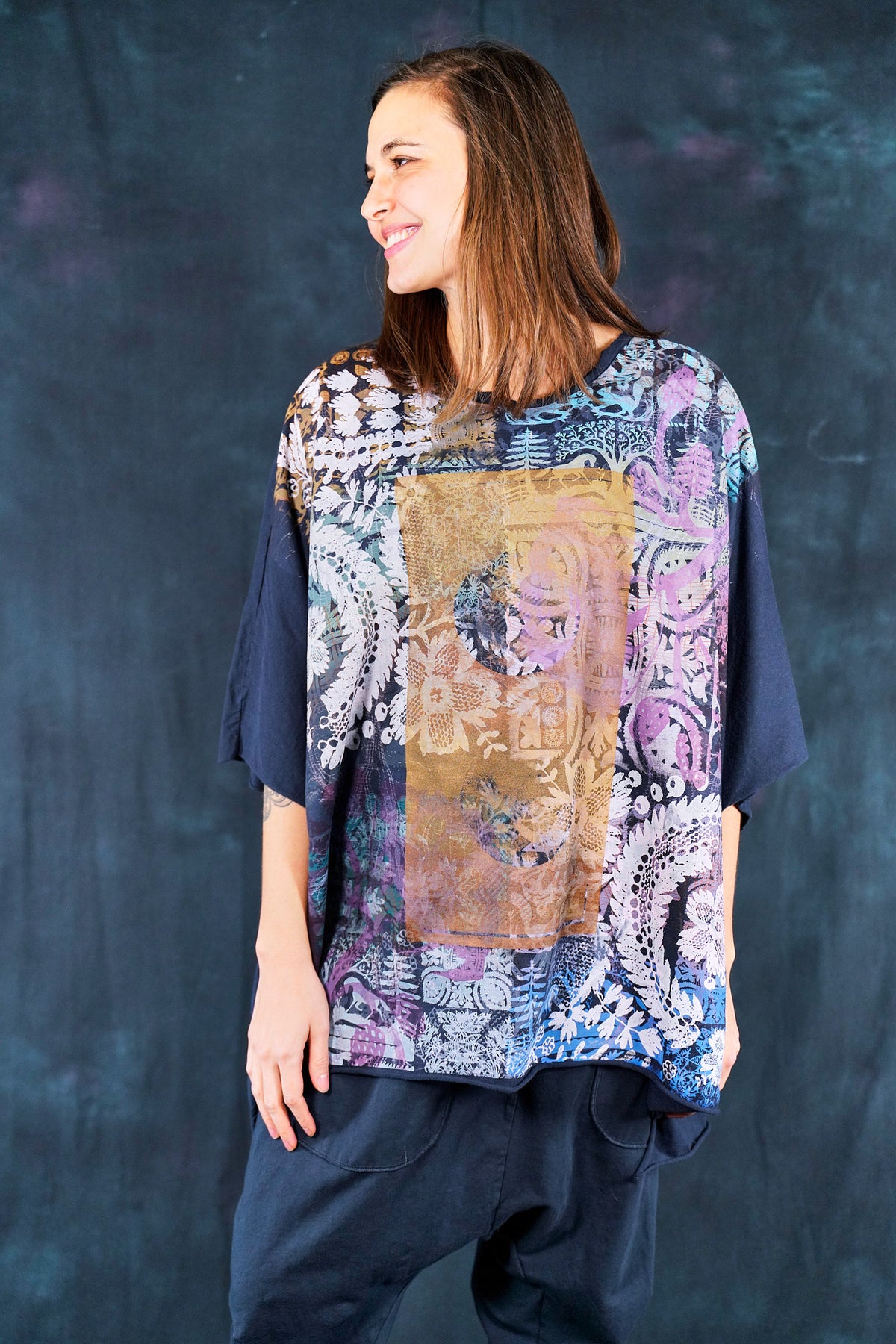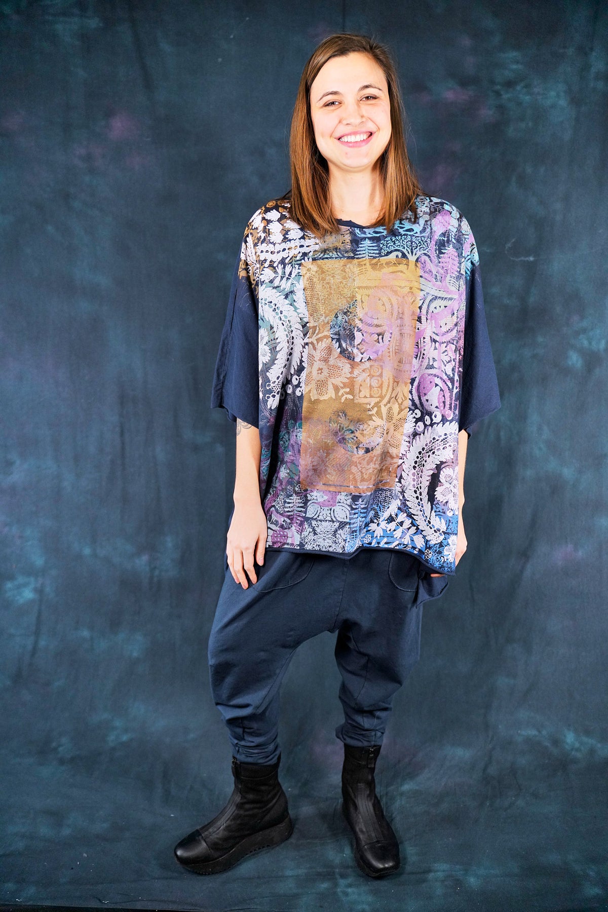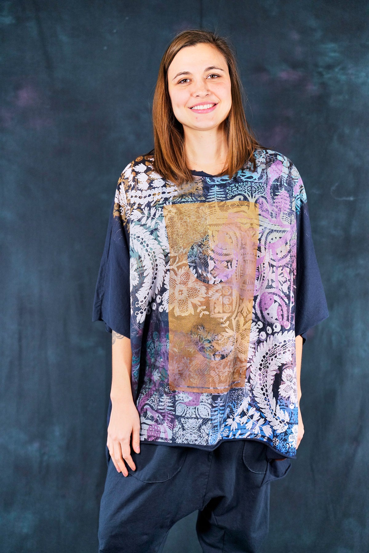An organic cotton top, light and airy slight hi/lo with a soft double raw edge,