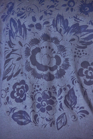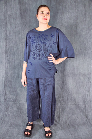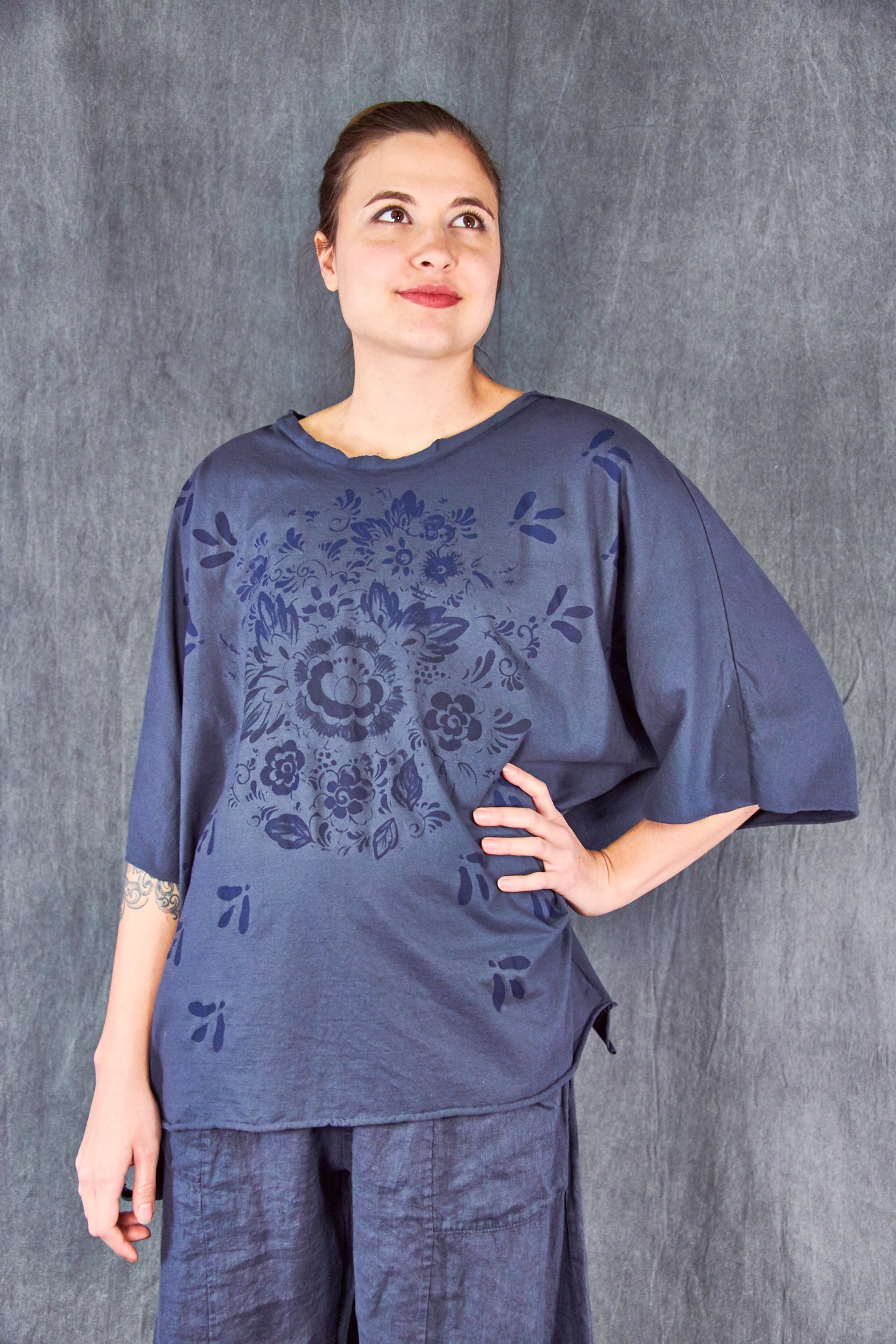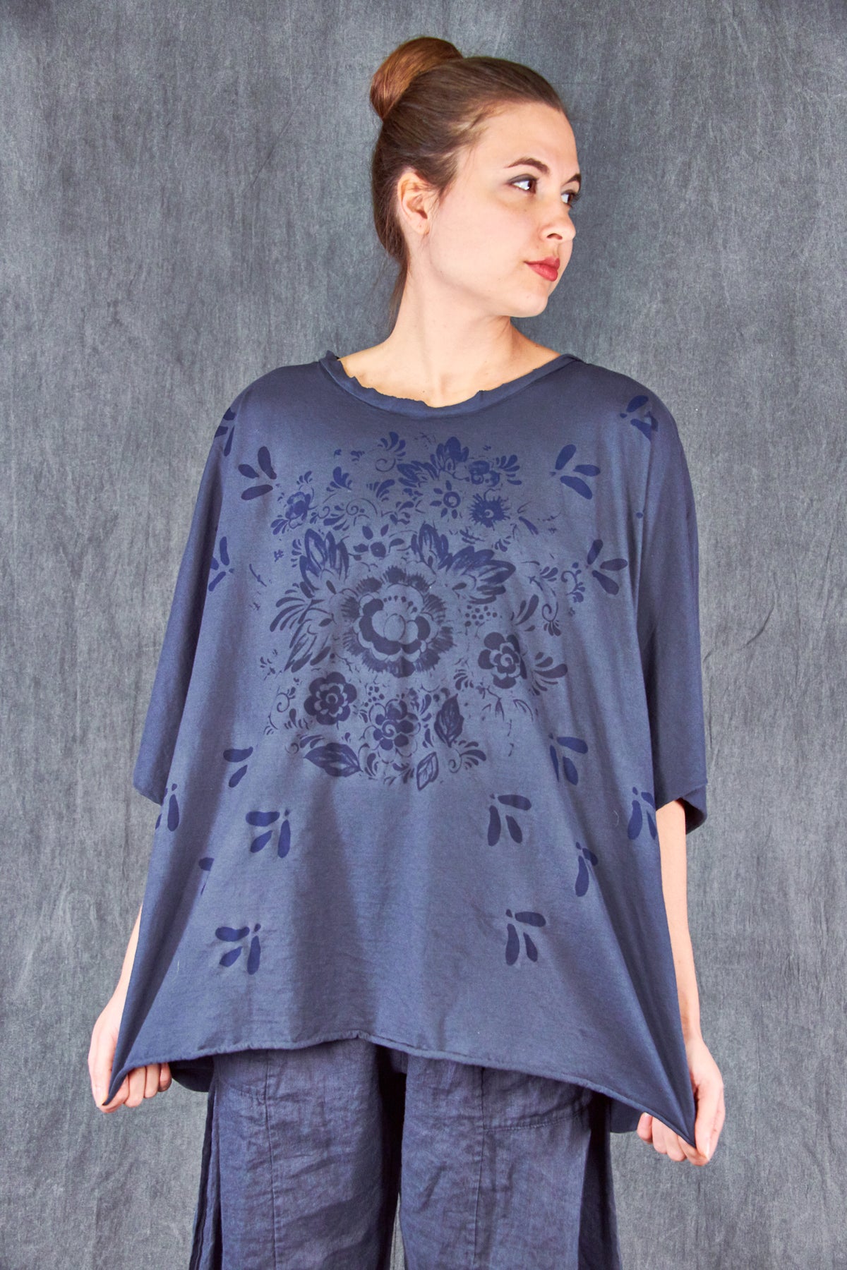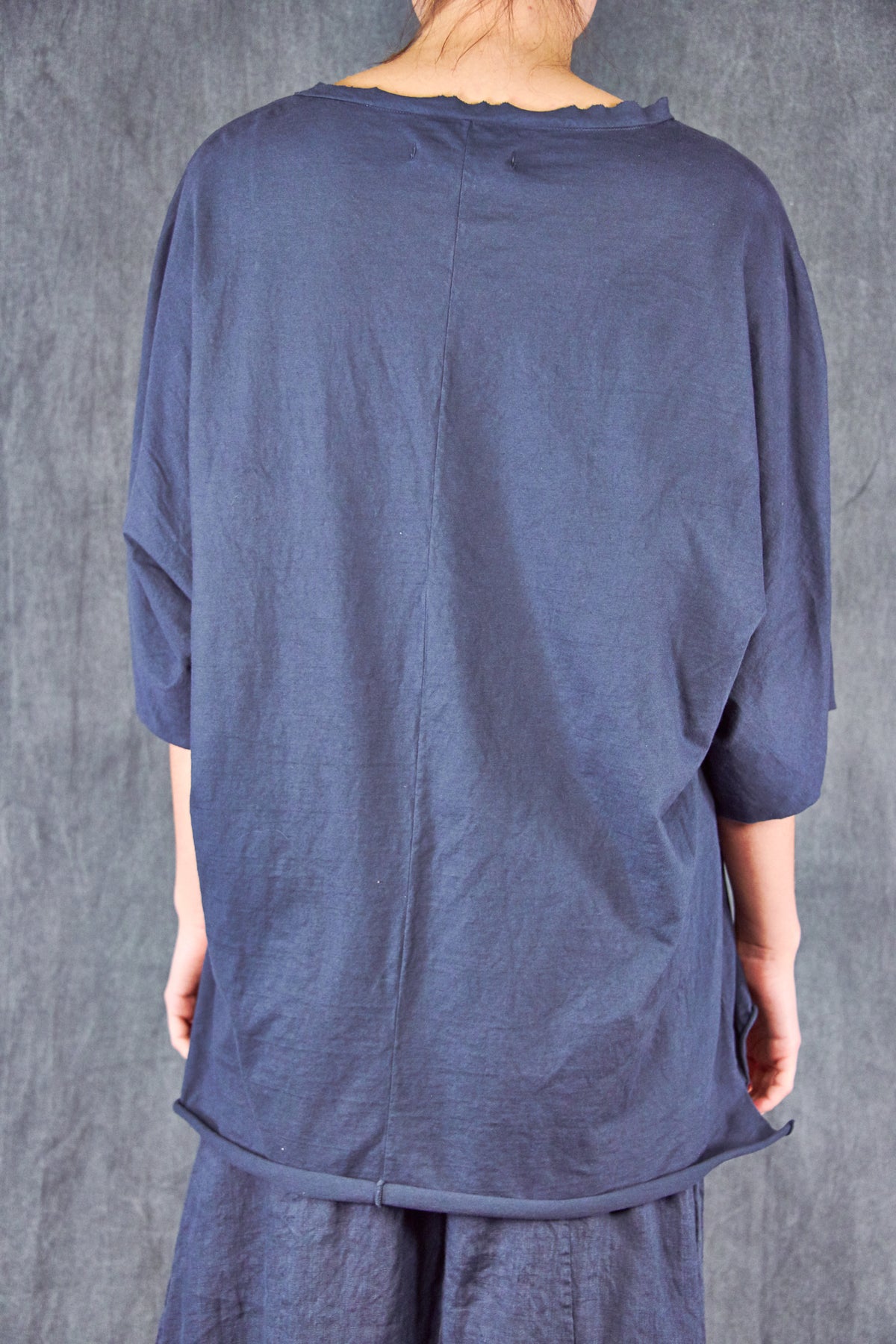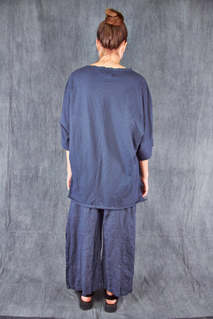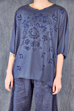 A light and airy, wider cut tee with a slight hi/lo with a soft double raw-edge neckline, slightly longer in the back- a wide, easy essential summer tee made for you from our own organic cotton jersey- this seasonless delft-inspired print makes getting dressed so simple. Color is a rich dark blue as shown on the model.
