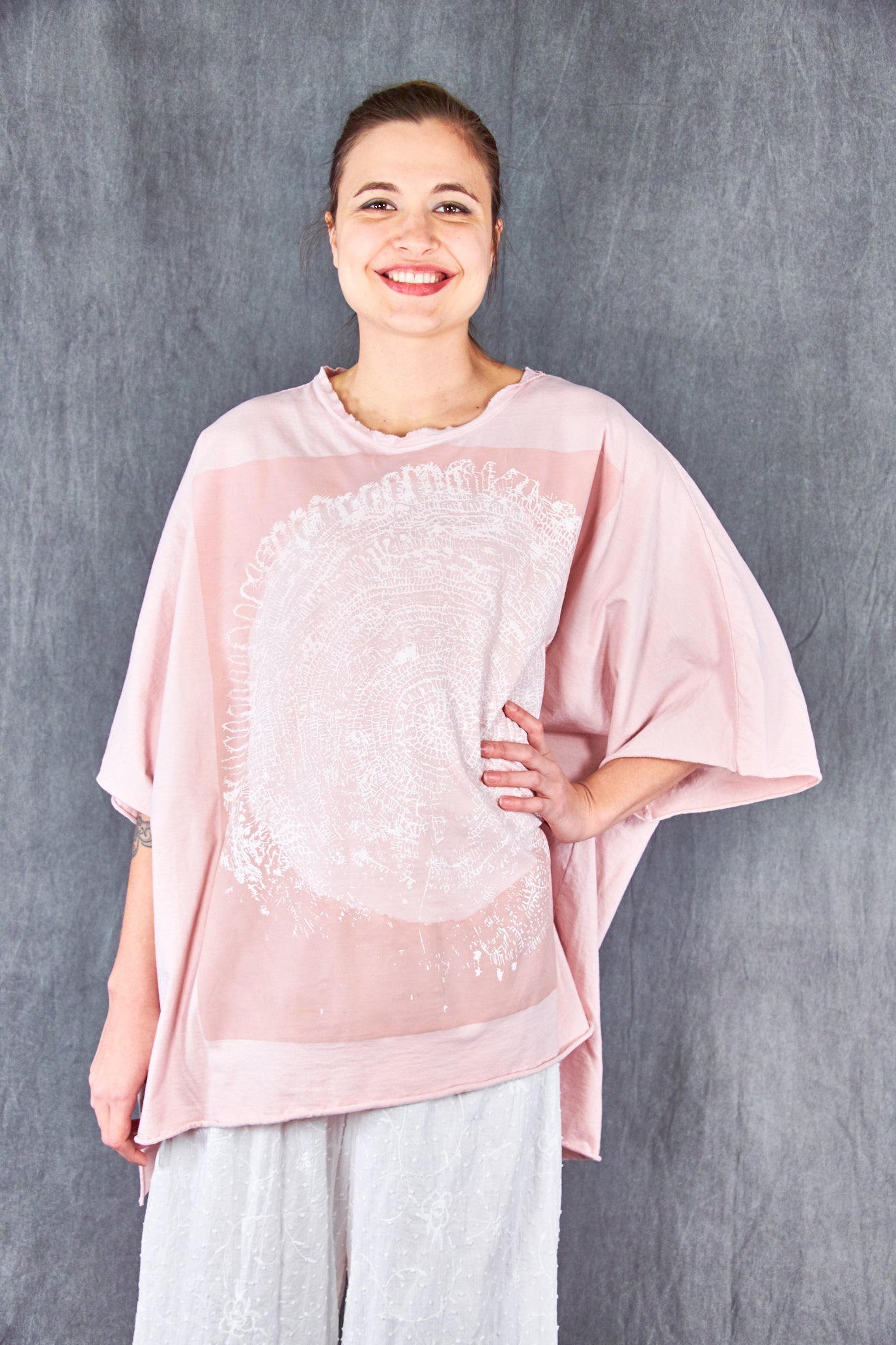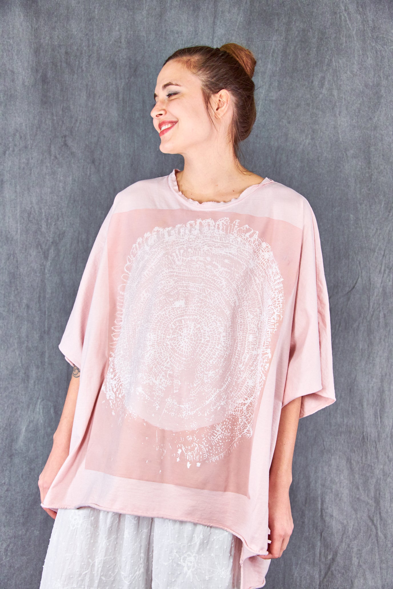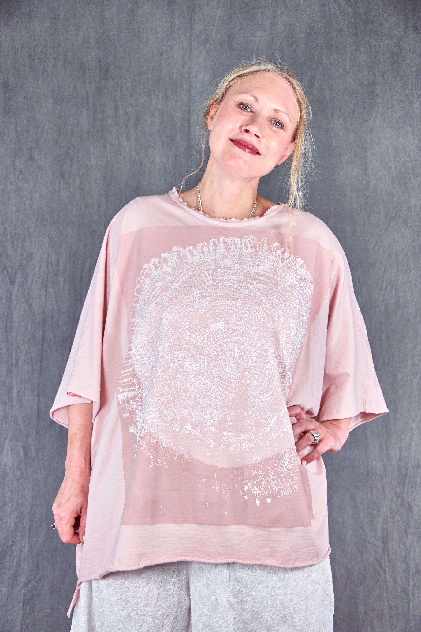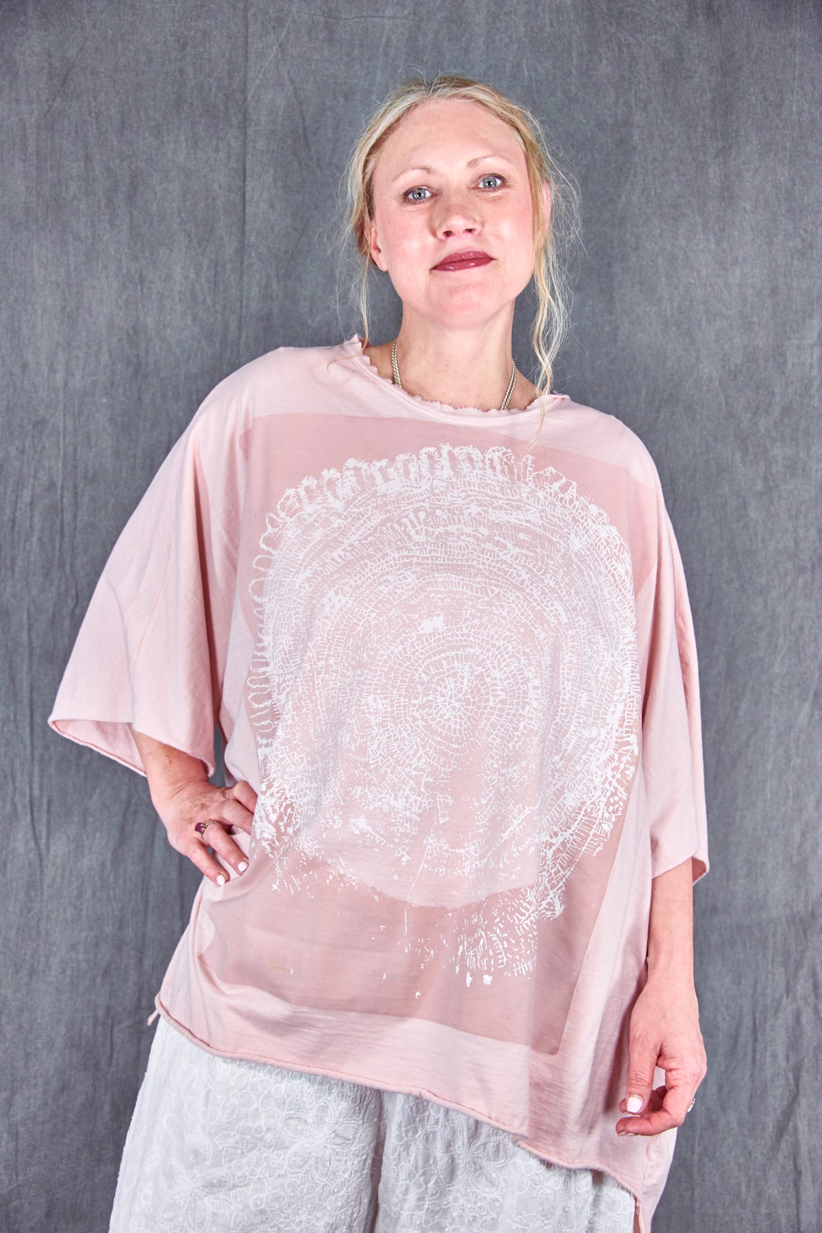 An organic cotton top, light and airy slight hi/lo with a soft double raw edge, essential for warmer days- hand printed with a subtle, lacy stitch mandala print.