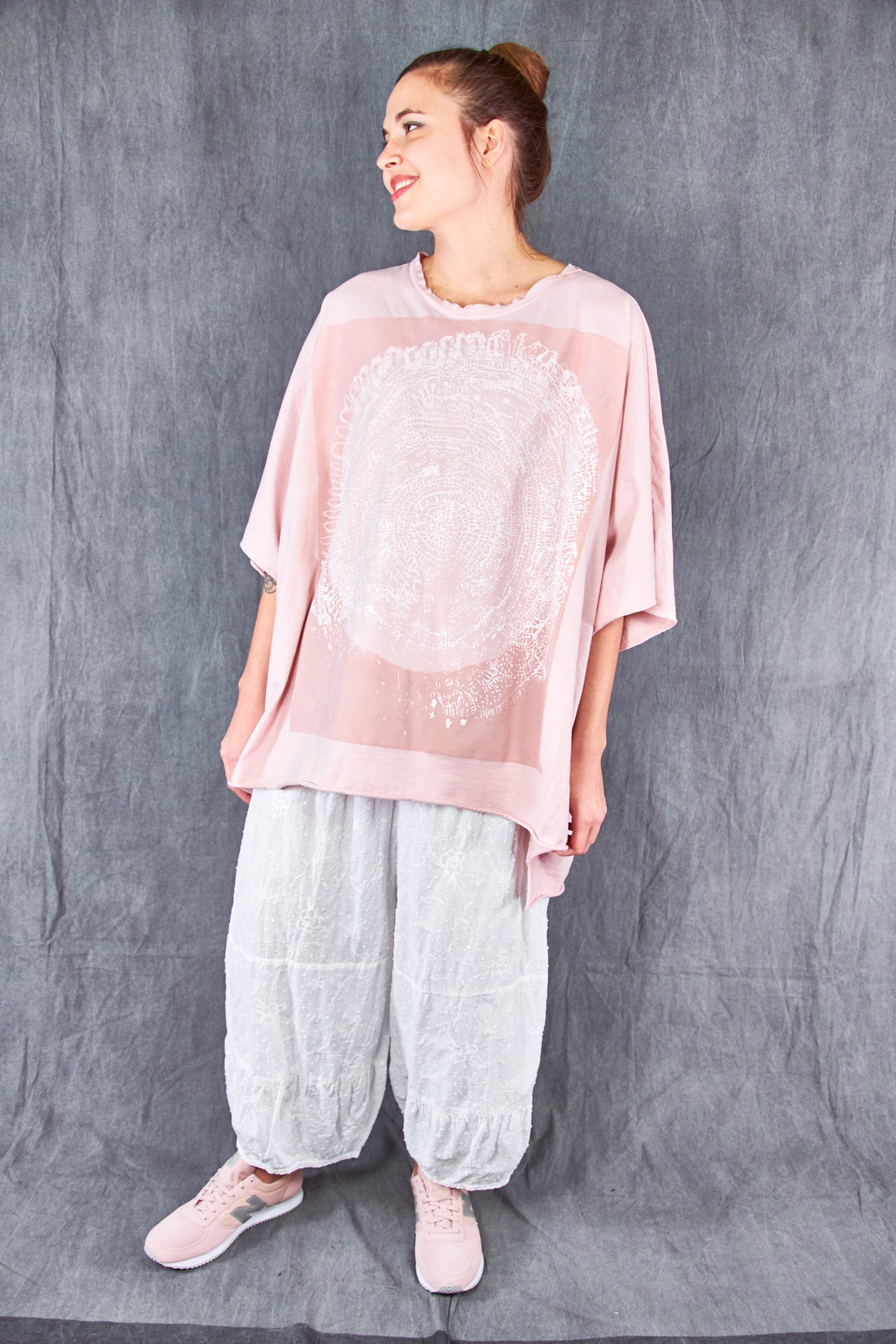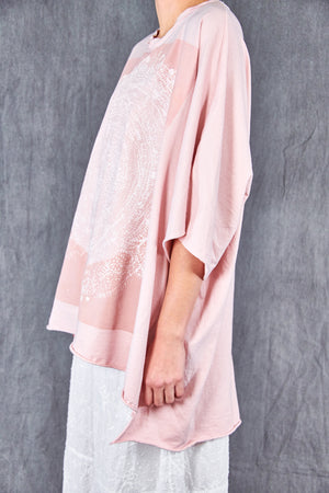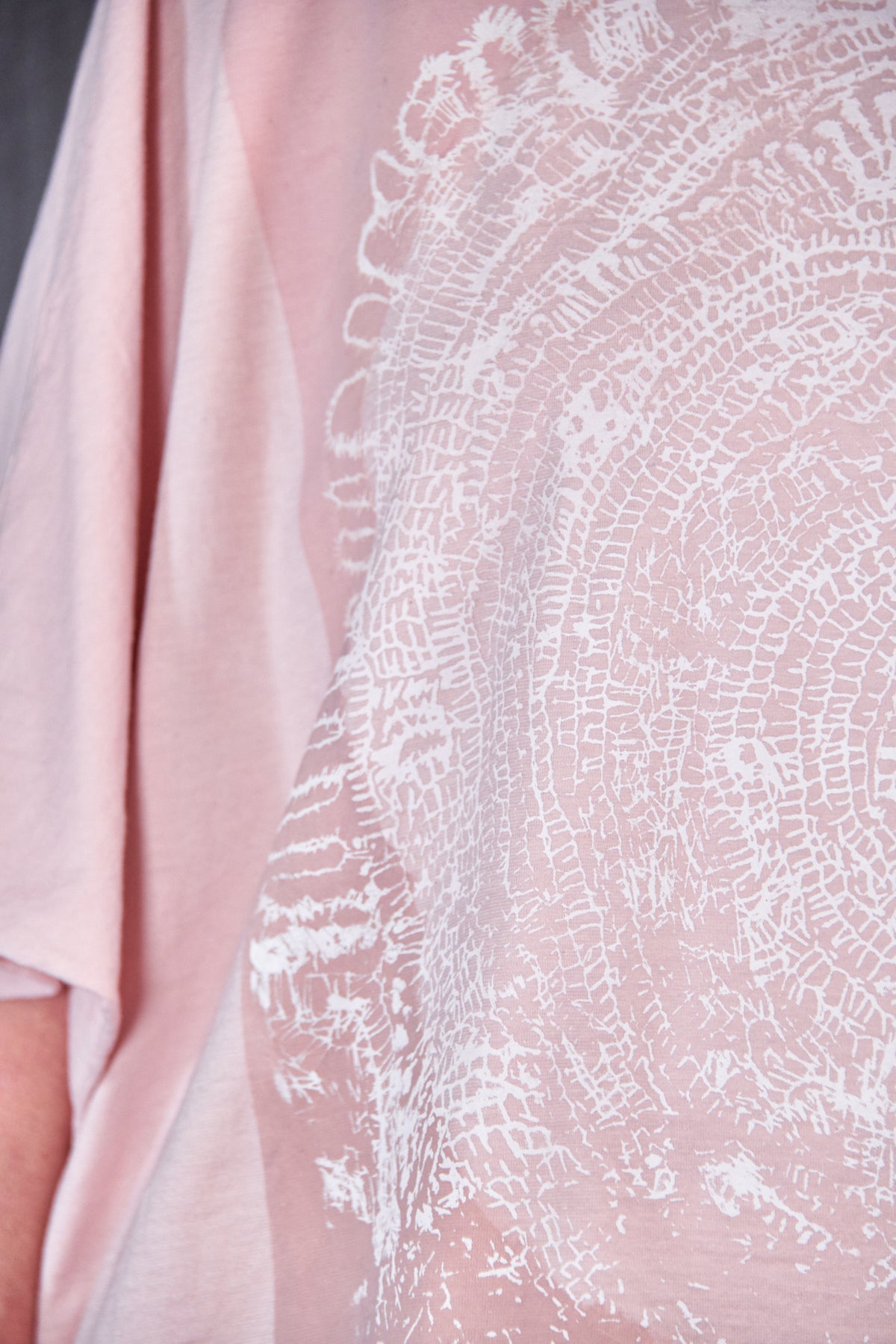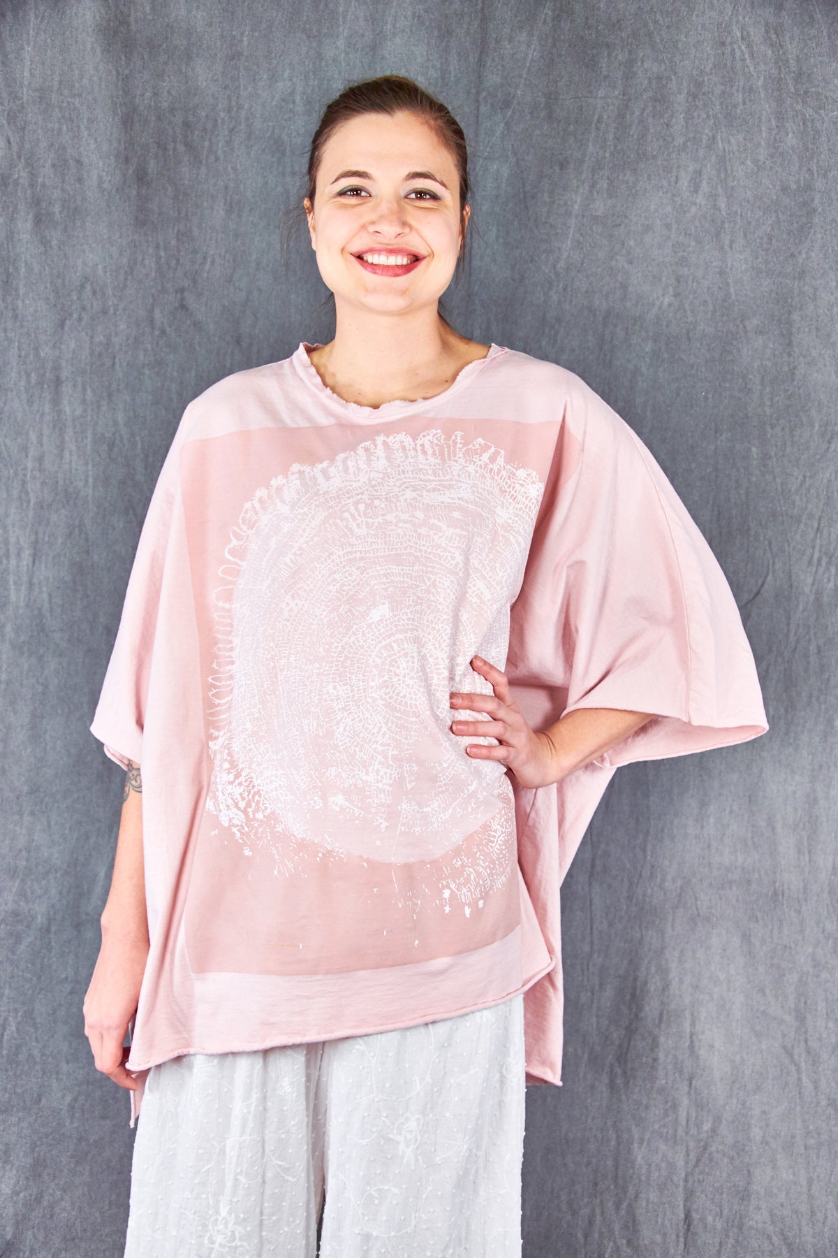 An organic cotton top, light and airy slight hi/lo with a soft double raw edge, essential for warmer days- hand printed with a subtle, lacy stitch mandala print.
