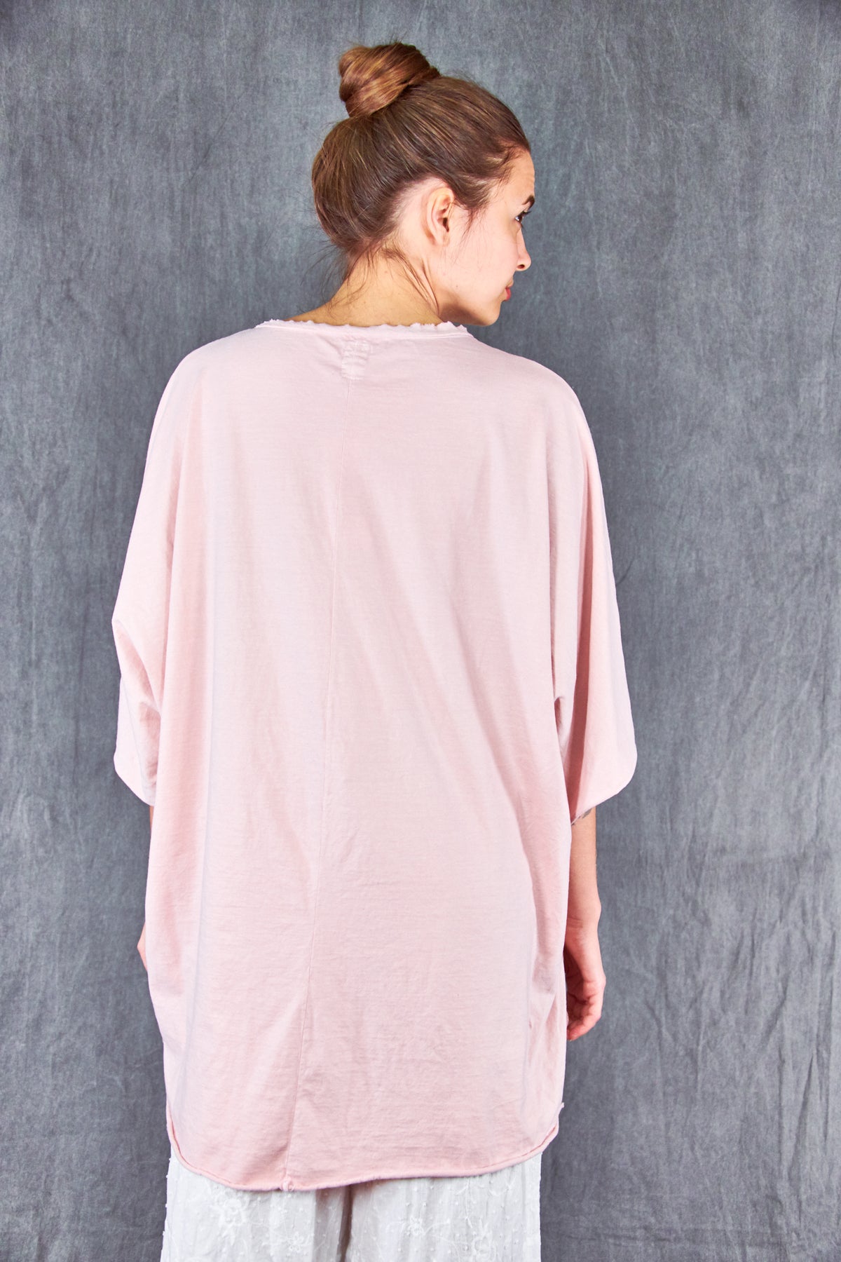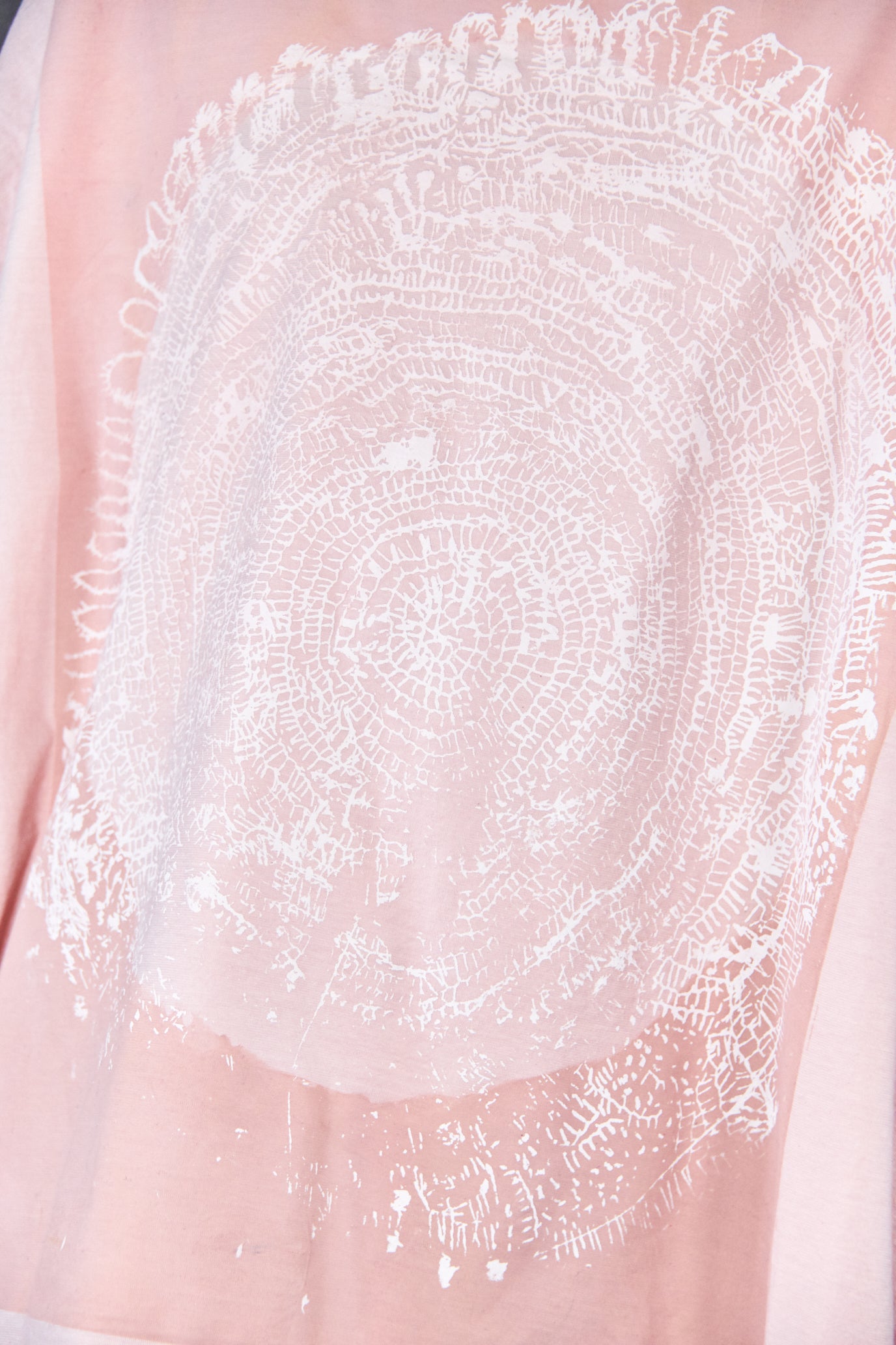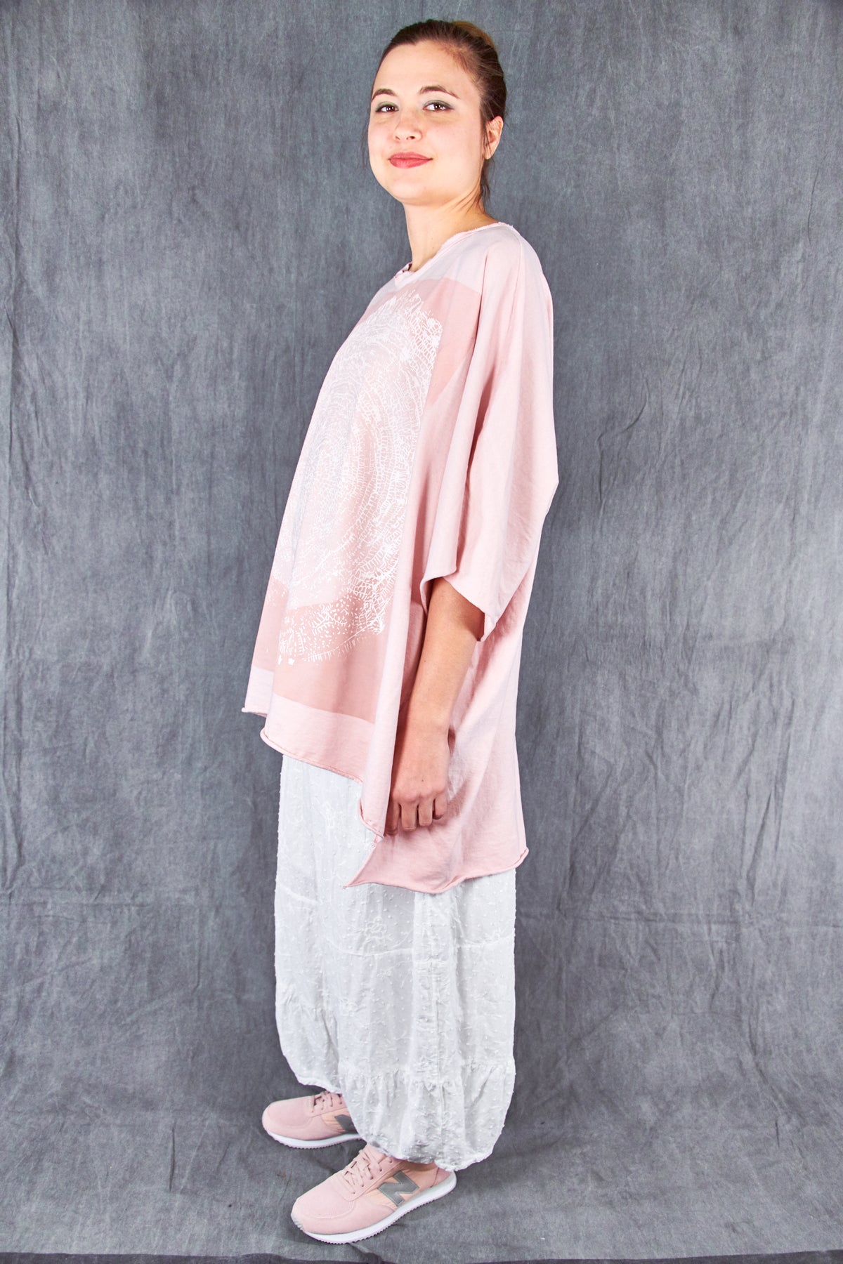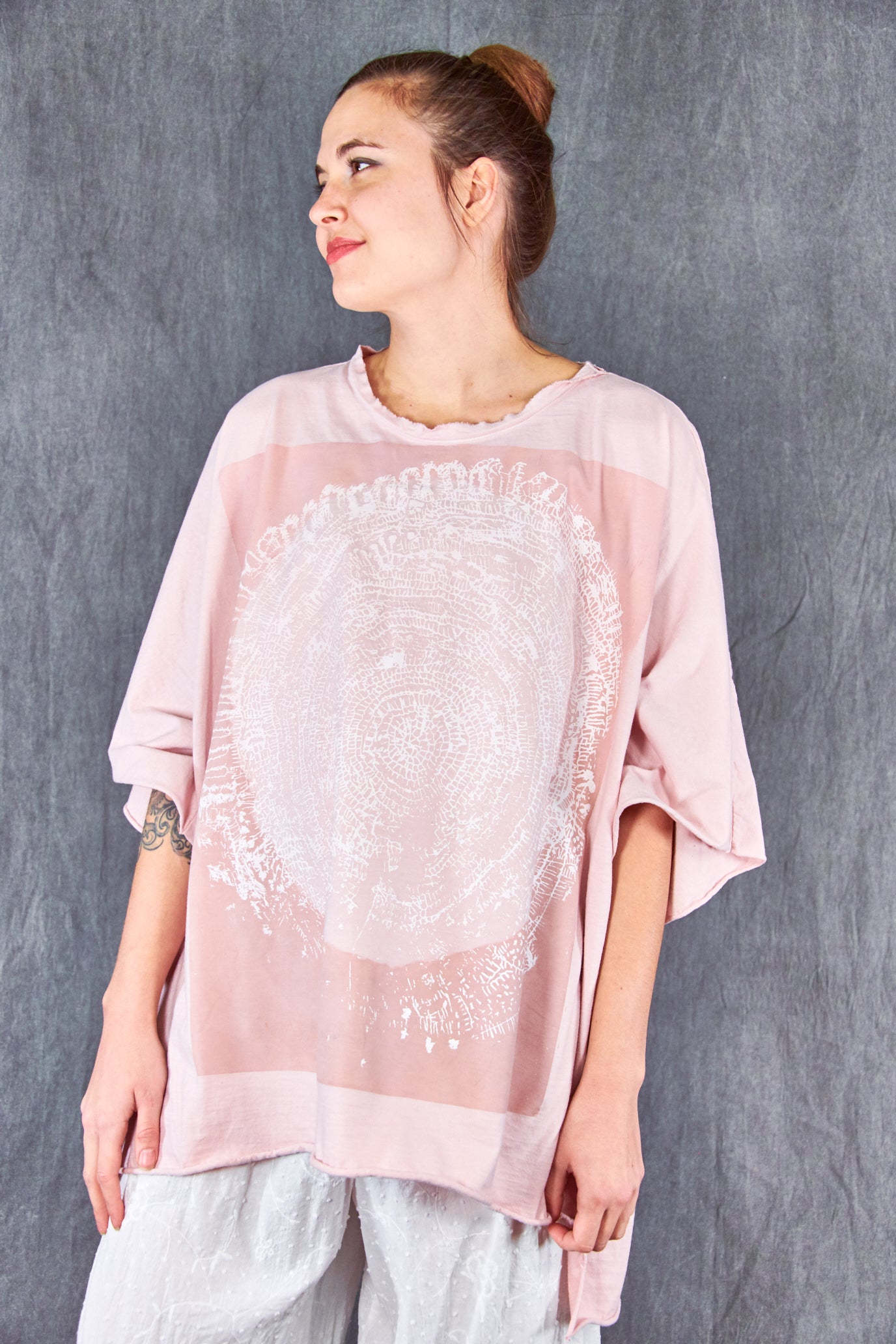 An organic cotton top, light and airy slight hi/lo with a soft double raw edge, essential for warmer days- hand printed with a subtle, lacy stitch mandala print.