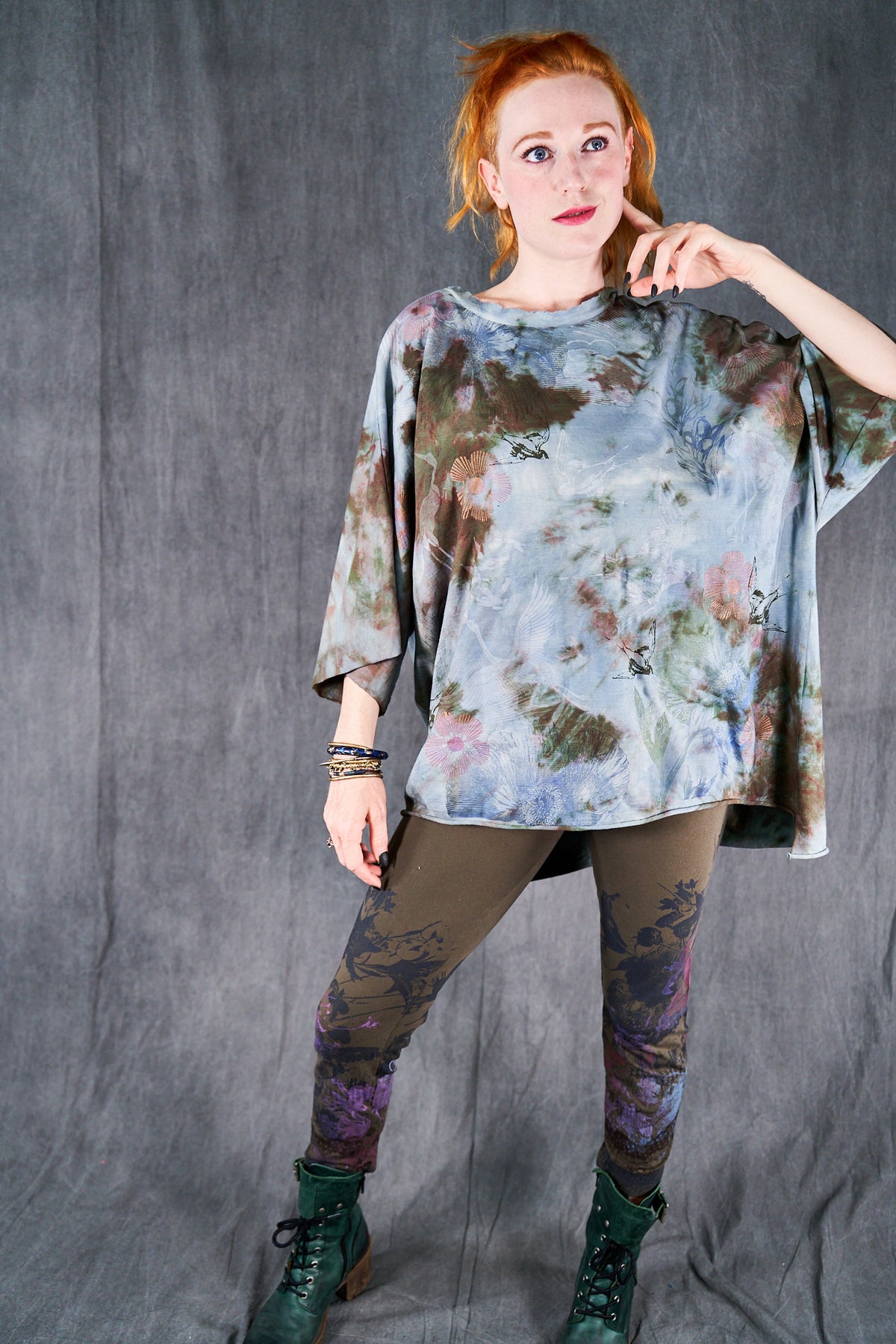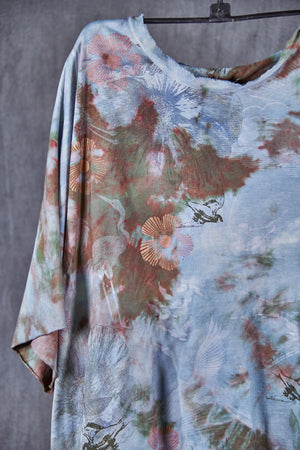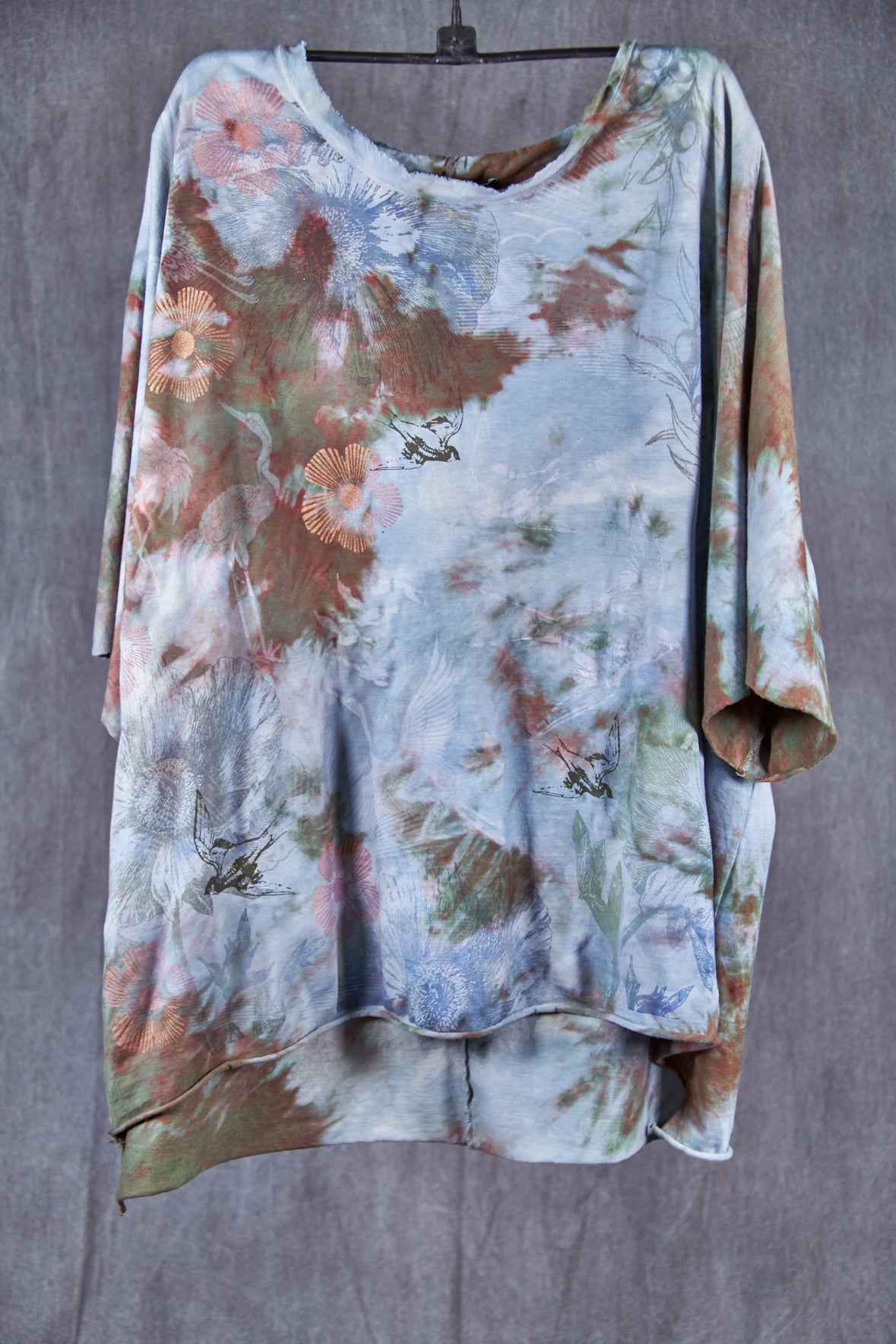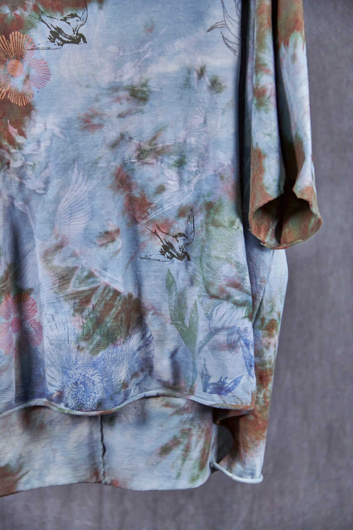 Layers and layers of hand-printed design motifs dance across this whimsical earthy organic square cut tee. We have hand dyed this piece first, then printed it with flying birds and summer flowers in a gorgeous palette of river rock and mountain stream inspired color. Special summer ltd. edition.