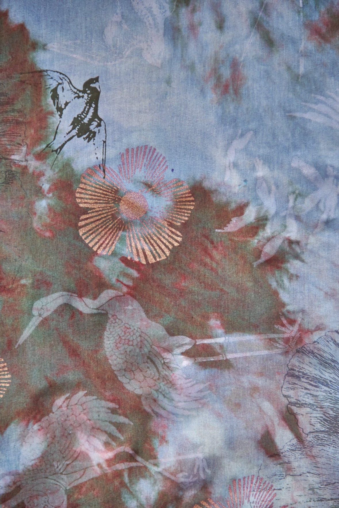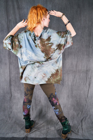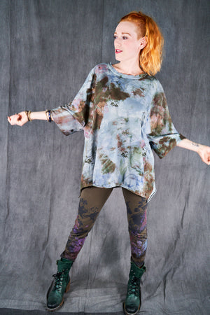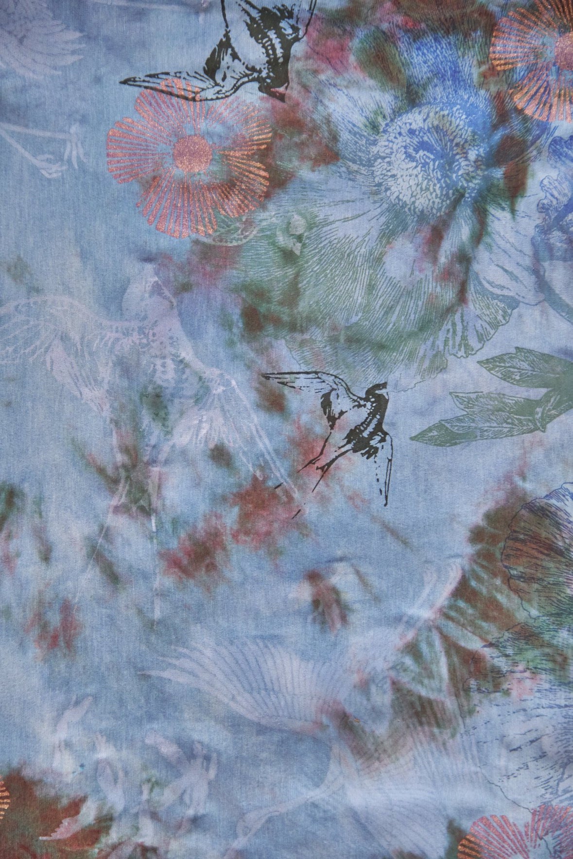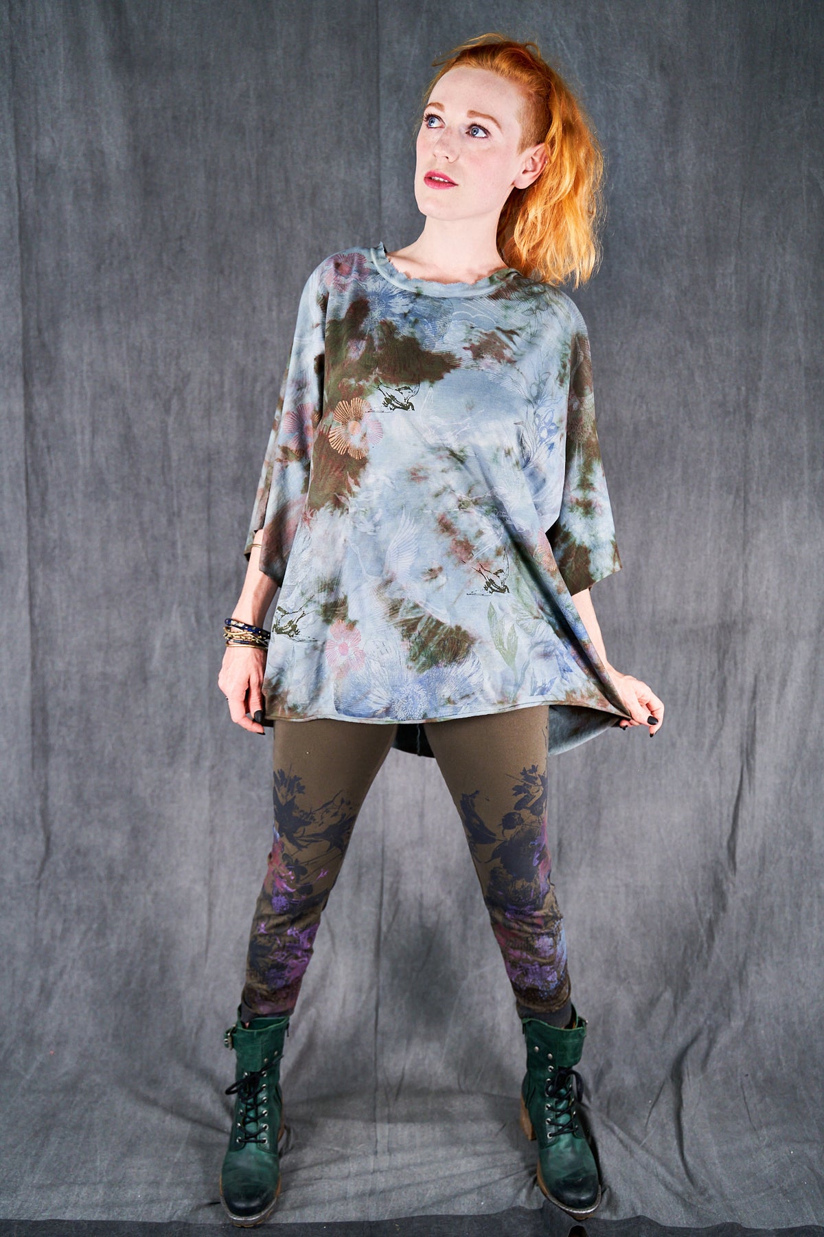Layers and layers of hand-printed design motifs dance across this whimsical earthy organic square cut tee. We have hand dyed this piece first, then printed it with flying birds and summer flowers in a gorgeous palette of river rock and mountain stream inspired color. Special summer ltd. edition.