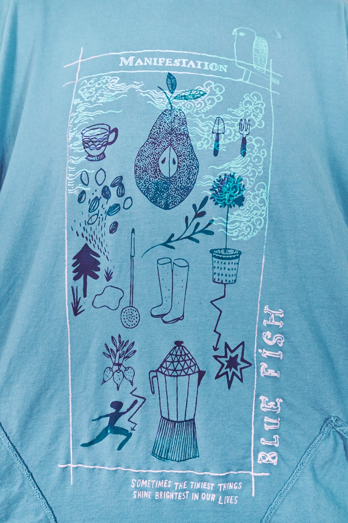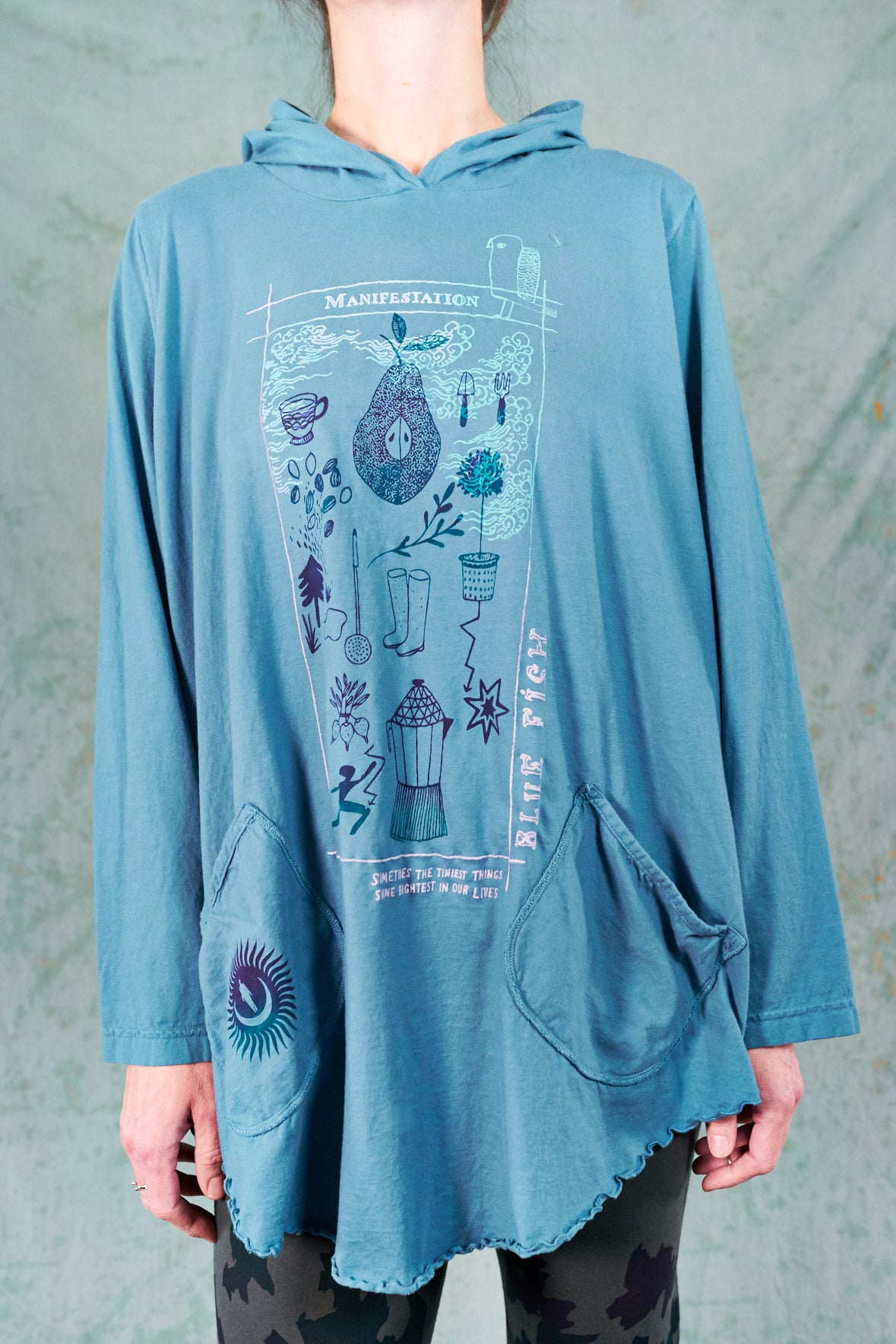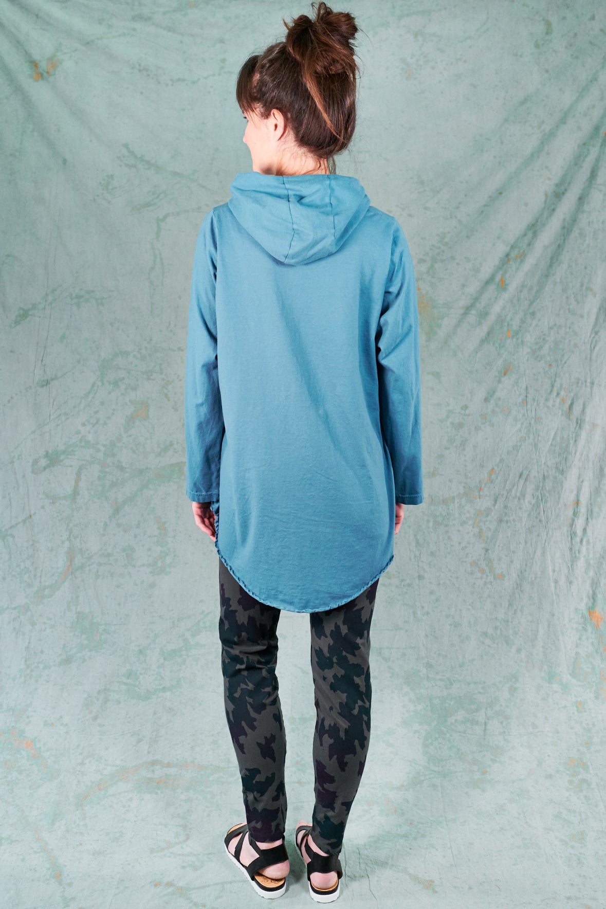 Hooded wedge top with 2 bound front patch pockets. Lettuce edge detail on shirt hem. Hits mid thigh for a relaxed fitted look. Crafted from our super soft organically grown cotton jersey. Great for layering or on its own.