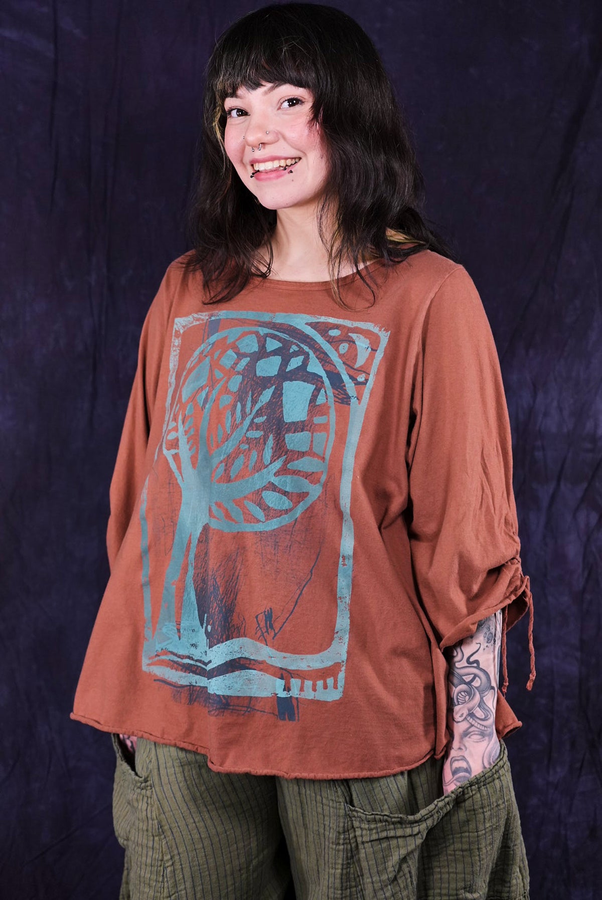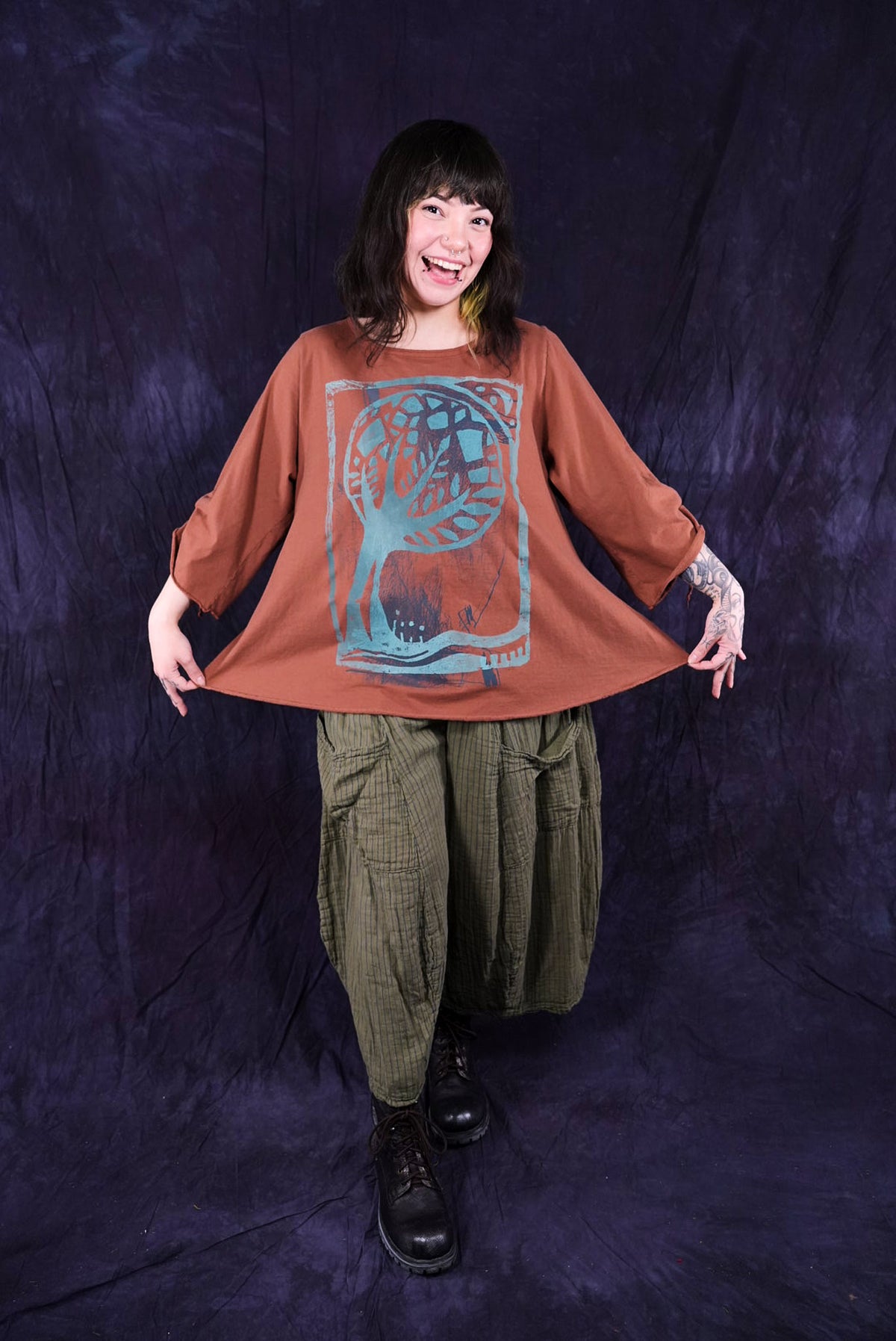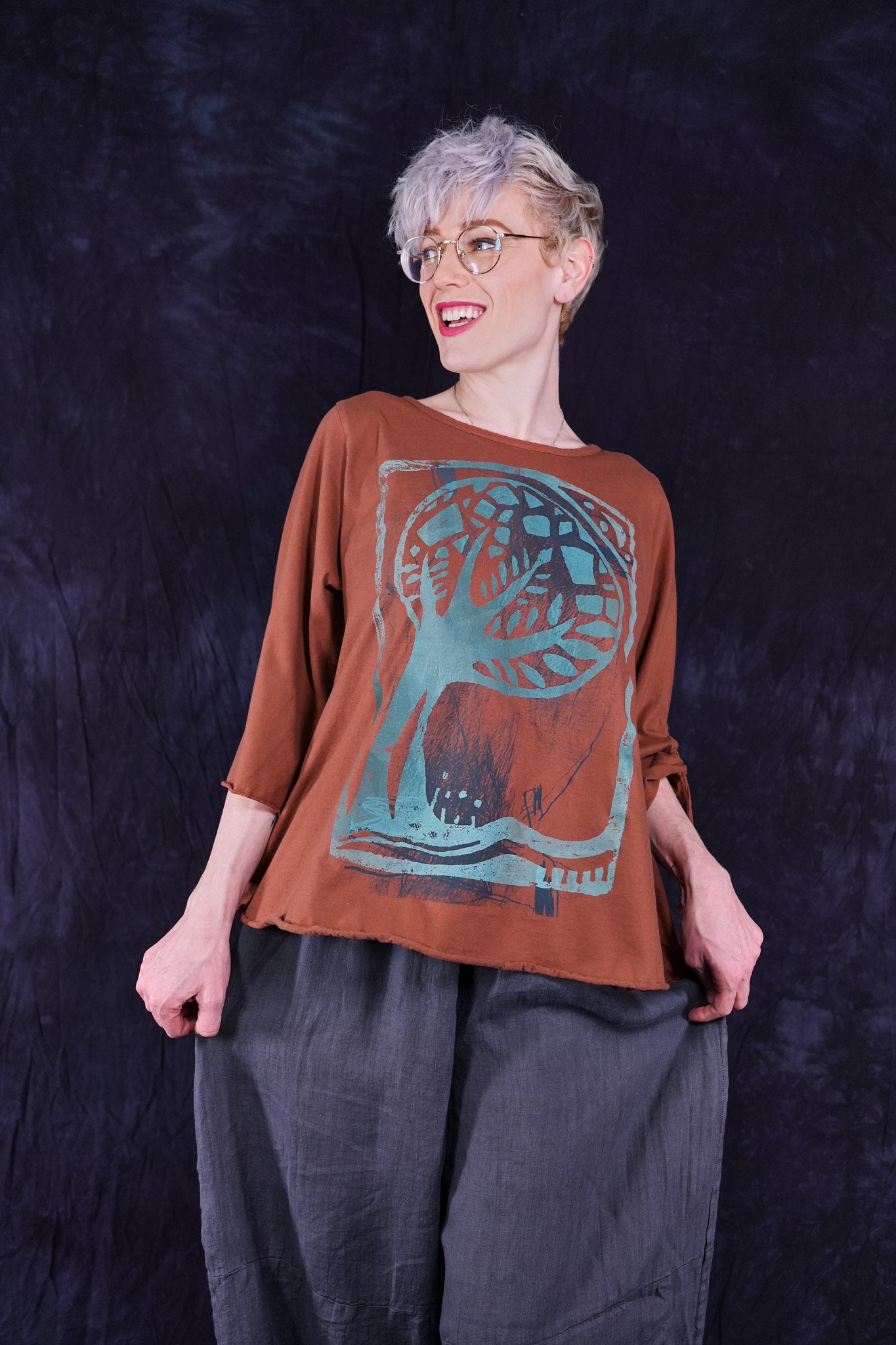Our favorite A-line top now with wide, drawcord sleeves to add a sweet feminine touch. This print features an iconic blue fish block print design of a rounded tree, gradated in turquoise tones with a crayon drawing in teal underneath- perfect to wear with your chunky turquoise jewelry- a cool desert inspired look.