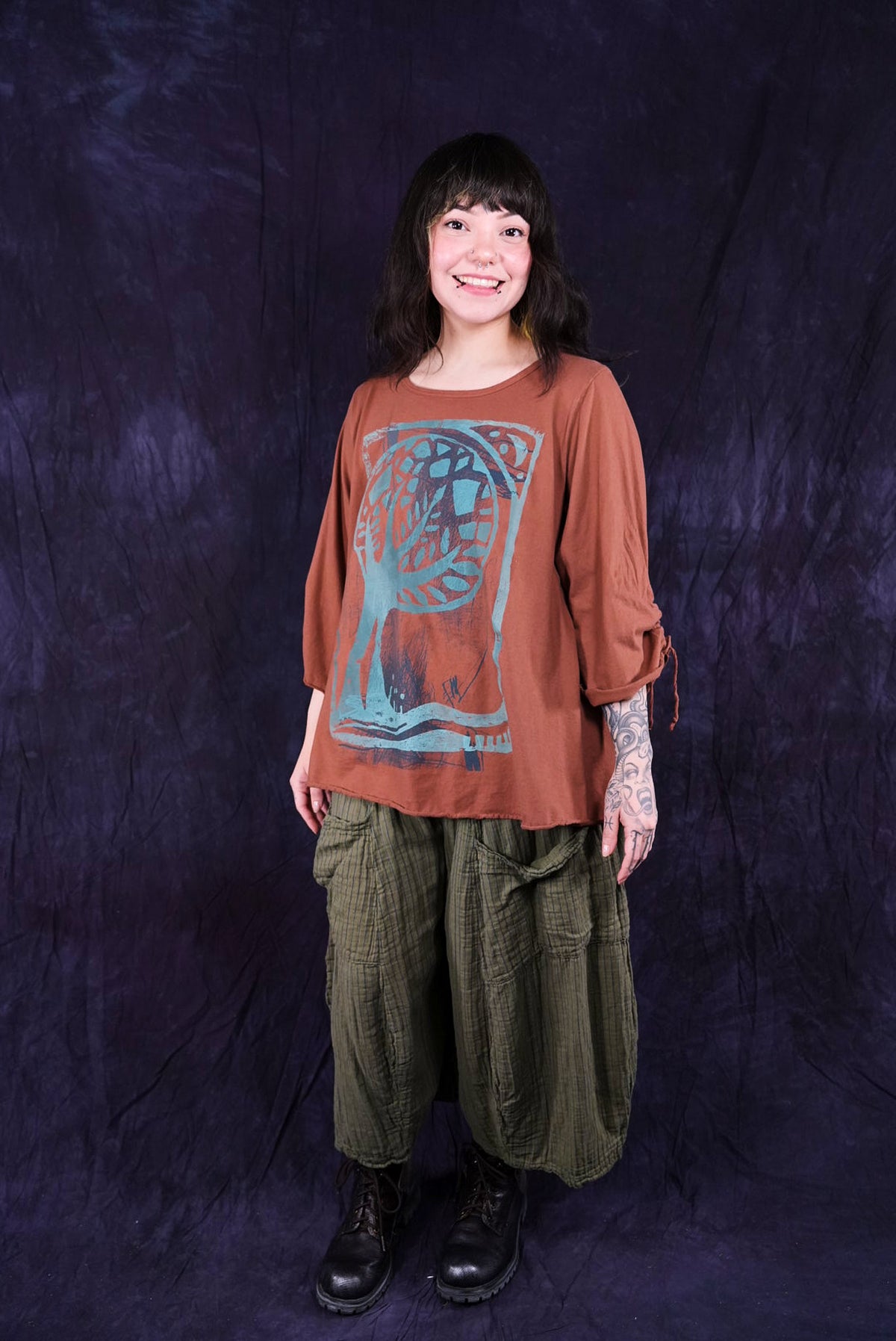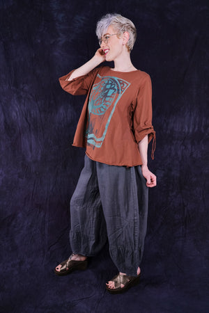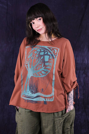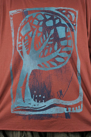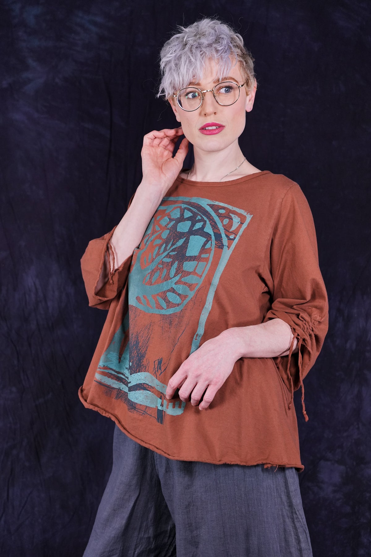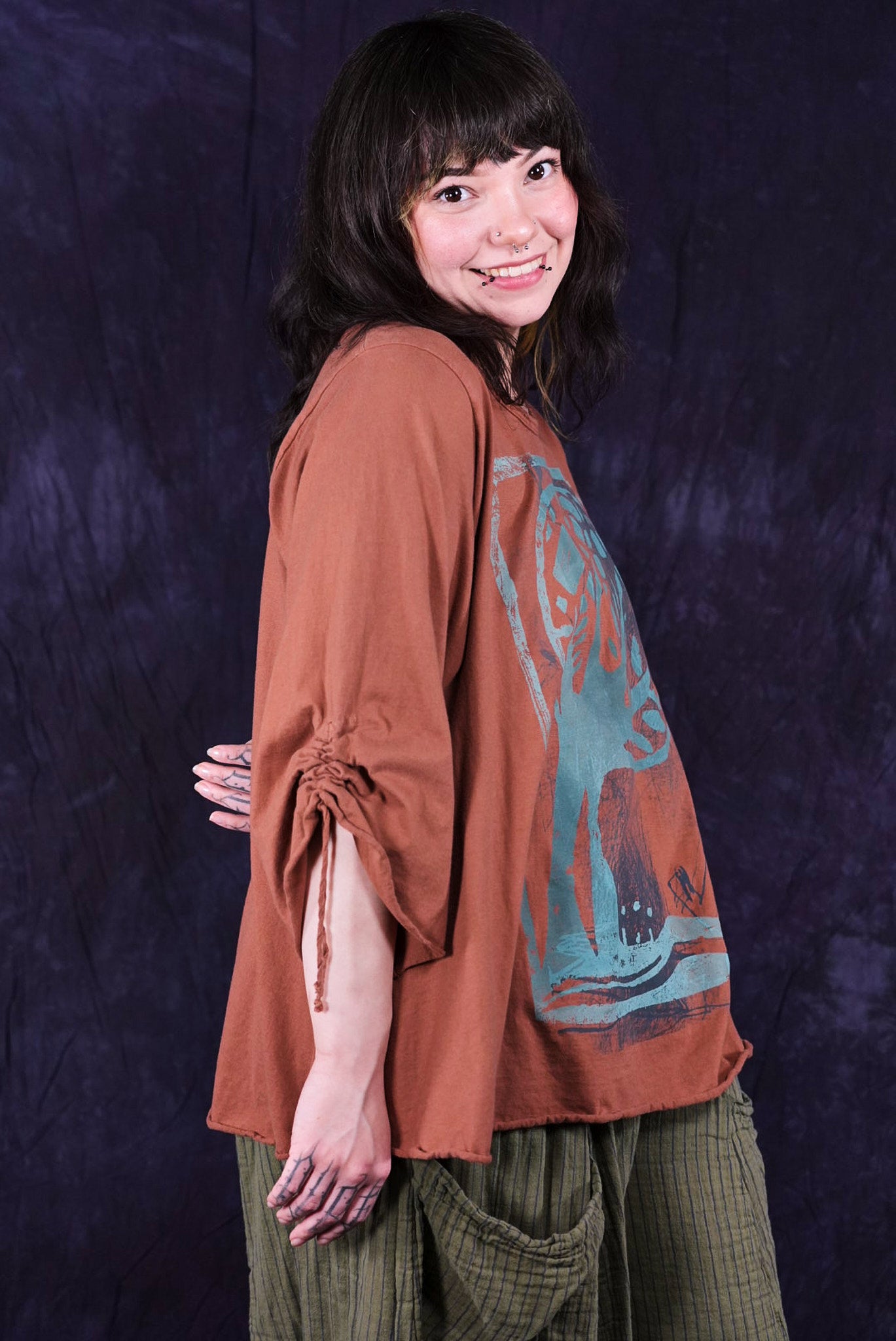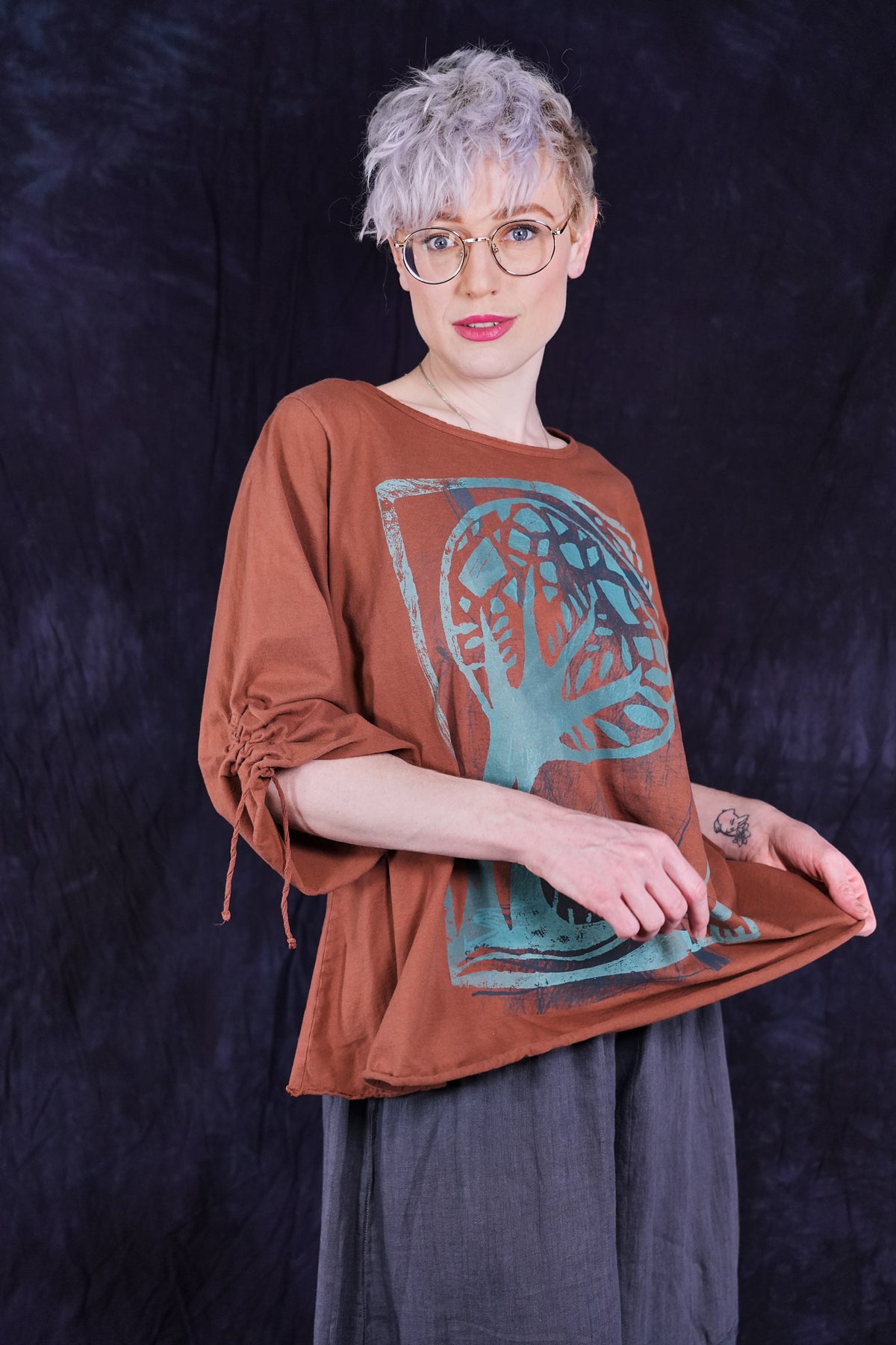 Our favorite A-line top now with wide, drawcord sleeves to add a sweet feminine touch. This print features an iconic blue fish block print design of a rounded tree, gradated in turquoise tones with a crayon drawing in teal underneath- perfect to wear with your chunky turquoise jewelry- a cool desert inspired look.
