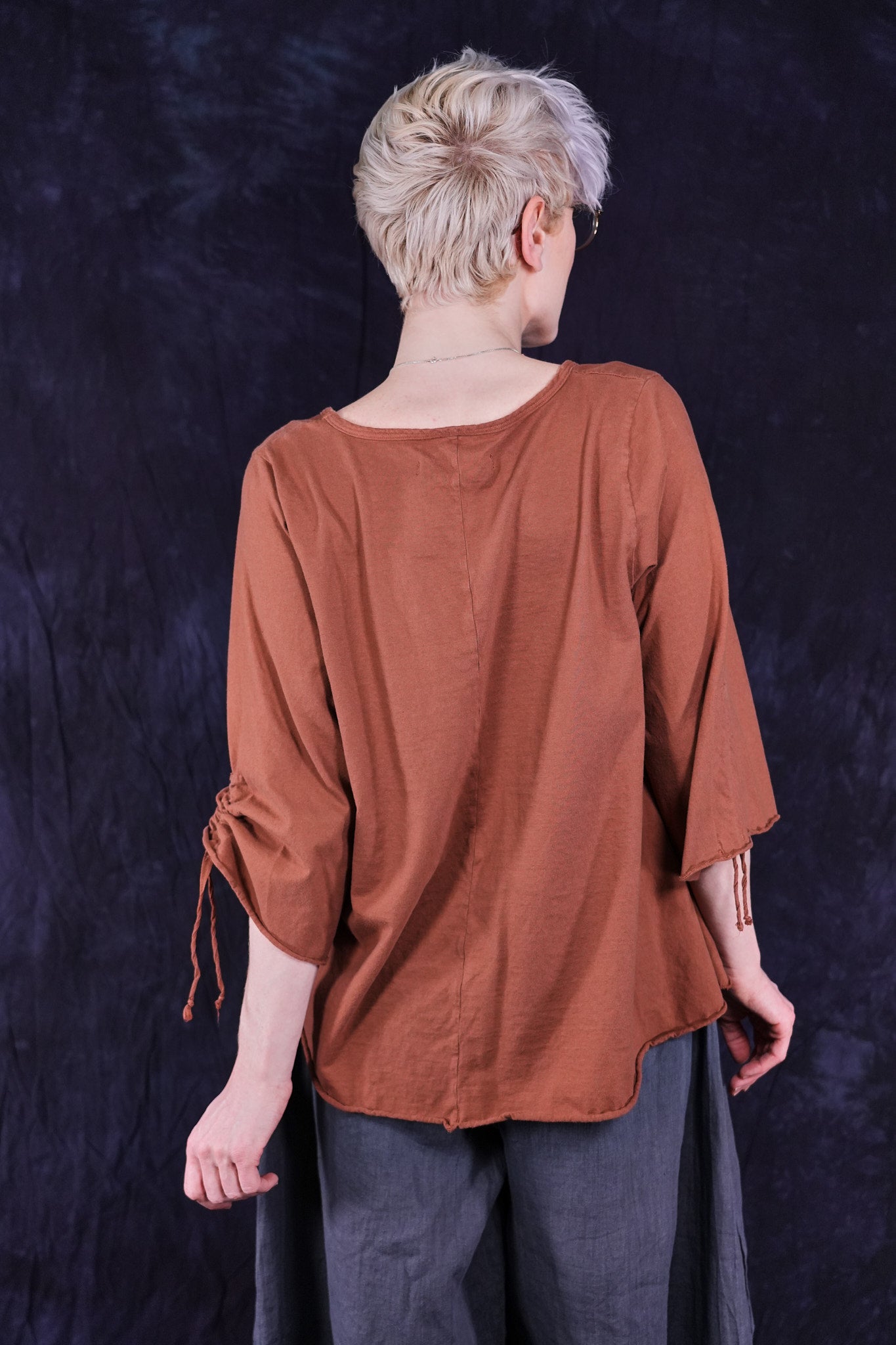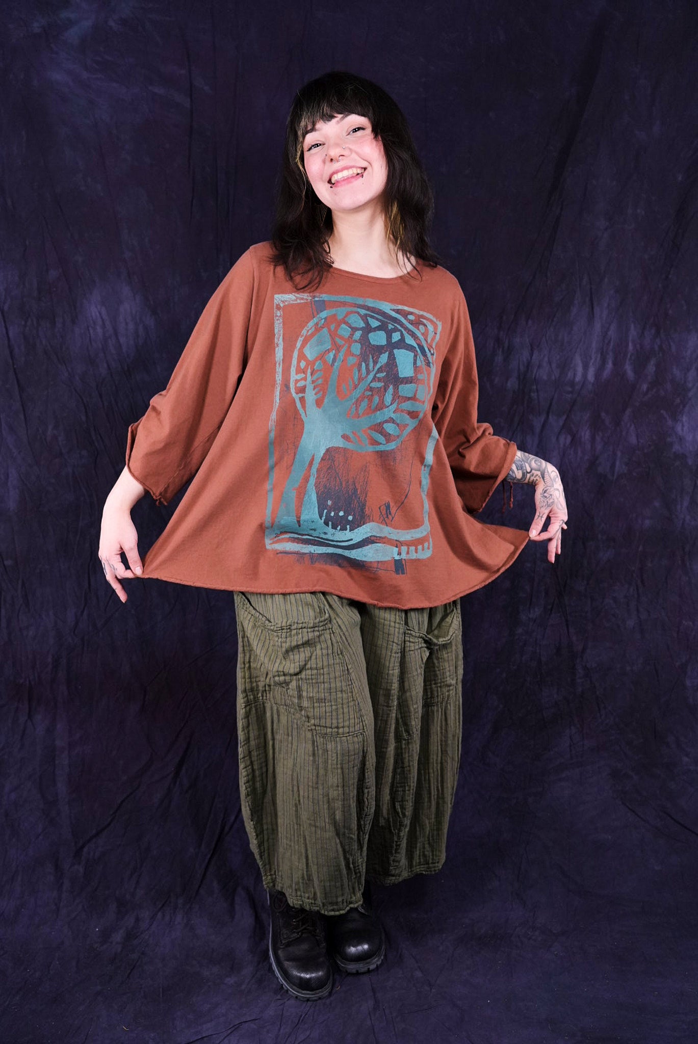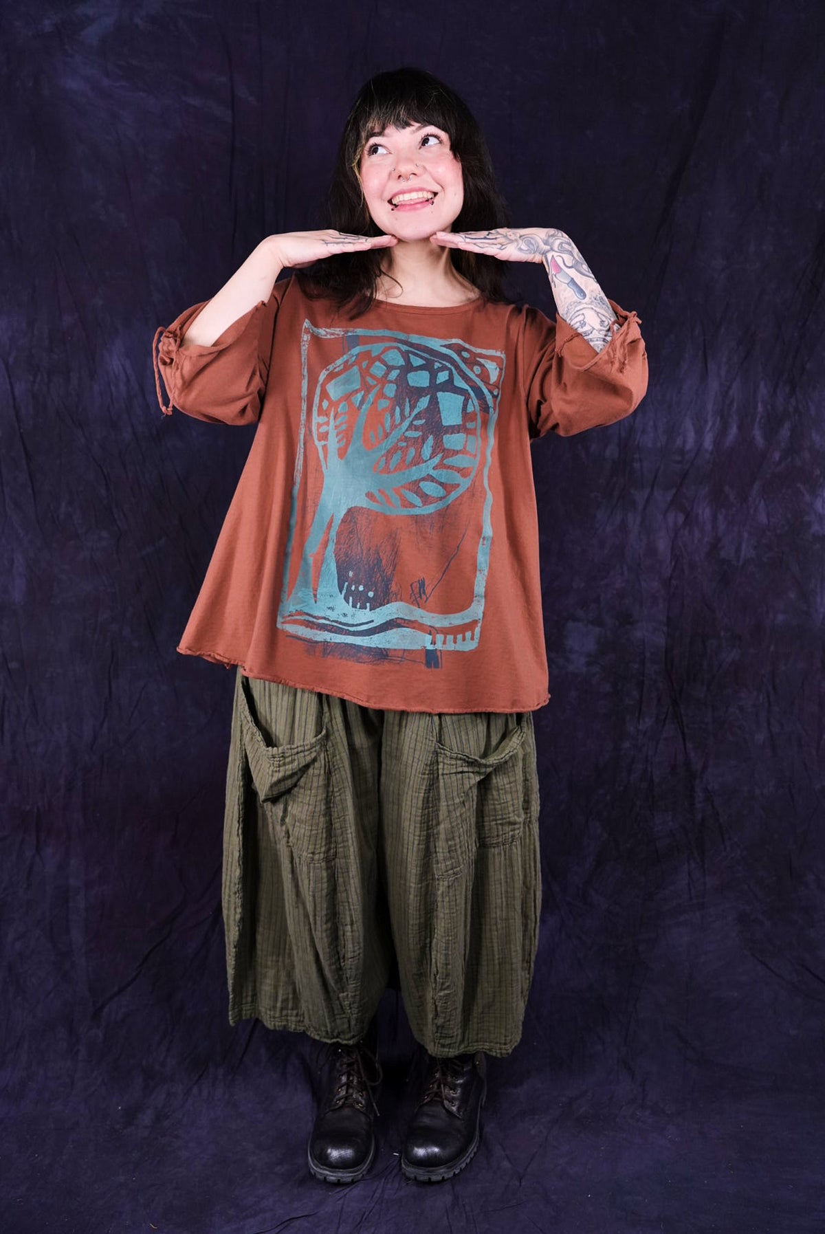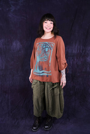 Our favorite A-line top now with wide, drawcord sleeves to add a sweet feminine touch. This print features an iconic blue fish block print design of a rounded tree, gradated in turquoise tones with a crayon drawing in teal underneath- perfect to wear with your chunky turquoise jewelry- a cool desert inspired look.