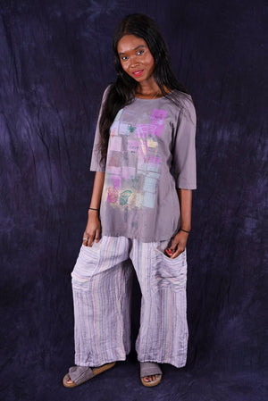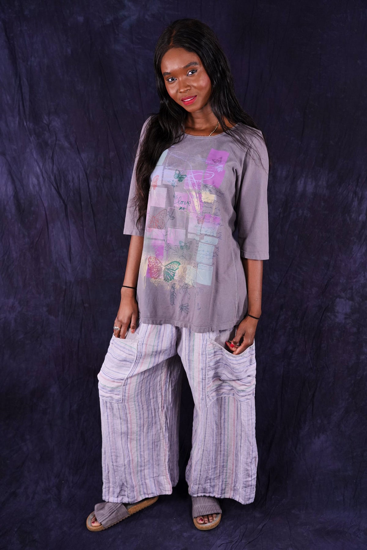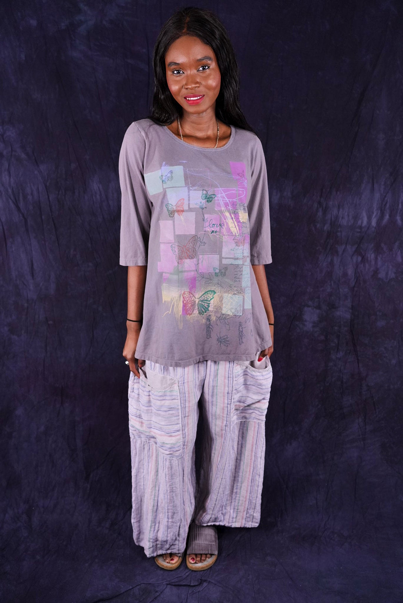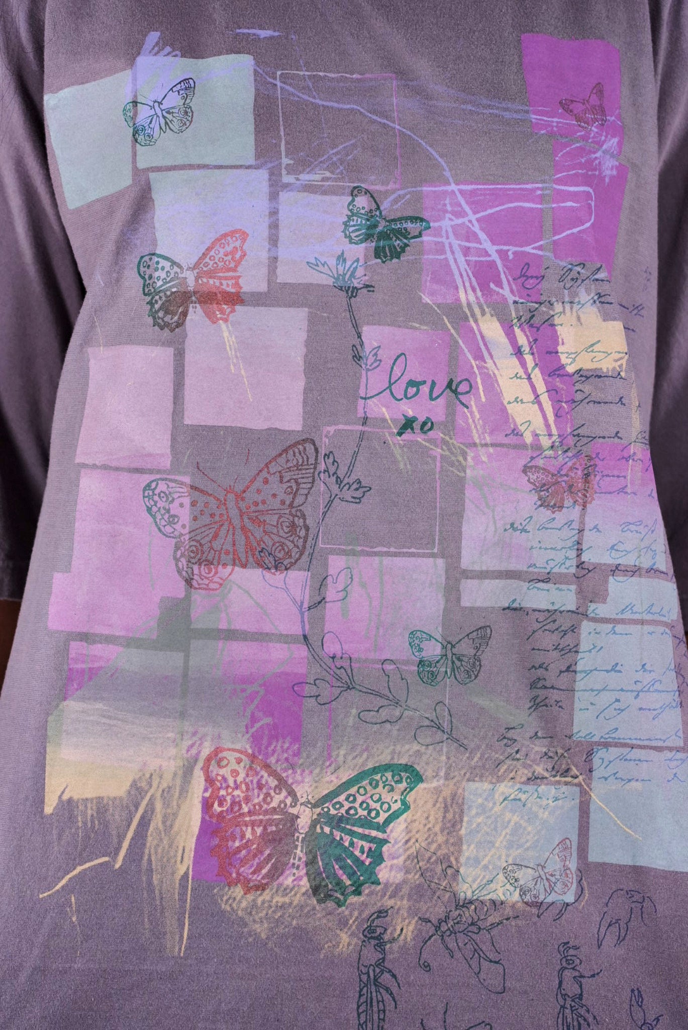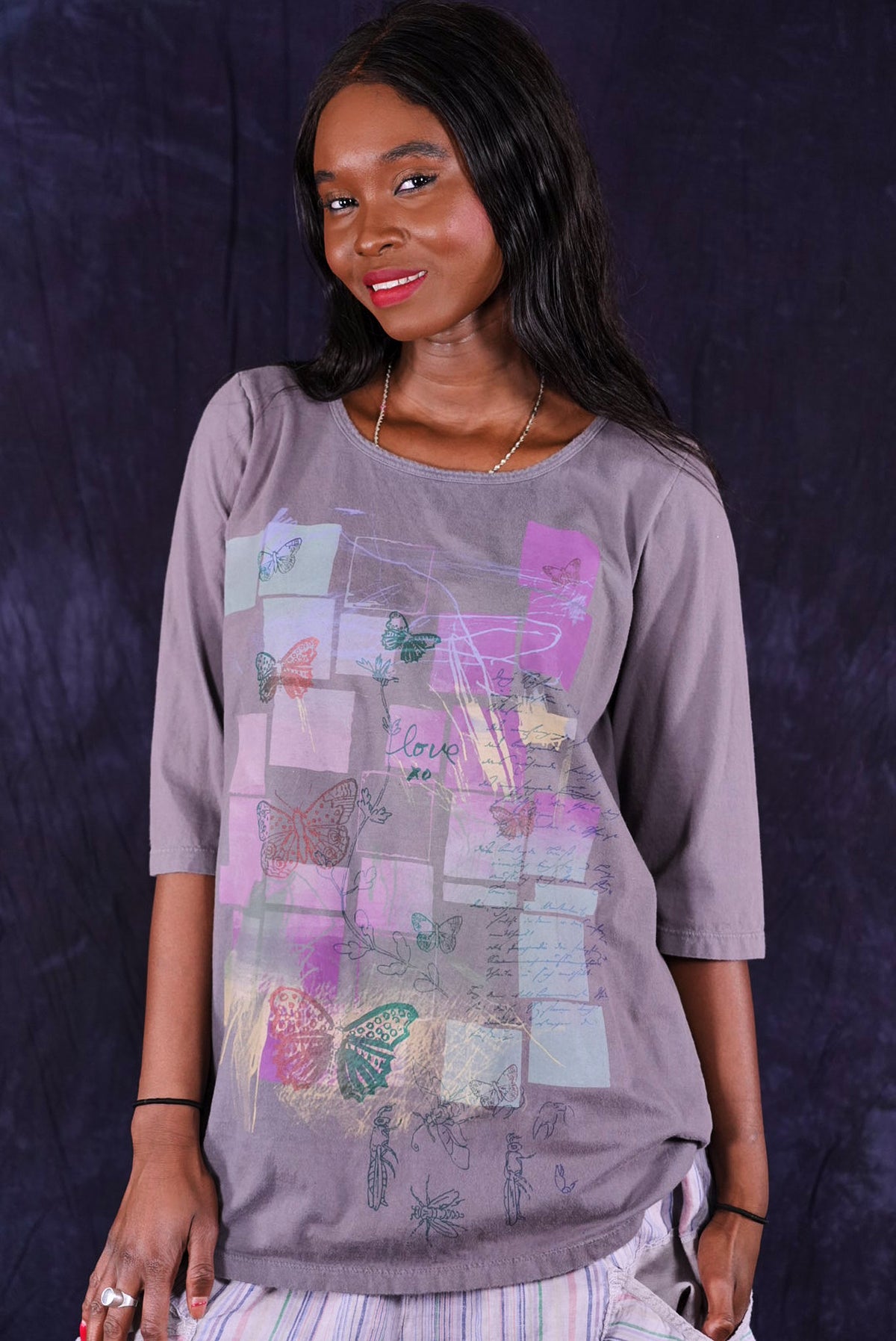 LOVE & JOY butterflies... People are happy to unbox our pieces as there is so much more to them than is visible from website photos.  These simple tees are lovely. A more slim cut, not so much extra fabric, great for layering under- or over! aprons or other midlayers, wonderful layered artful prints and colors.