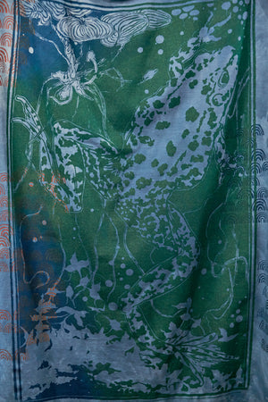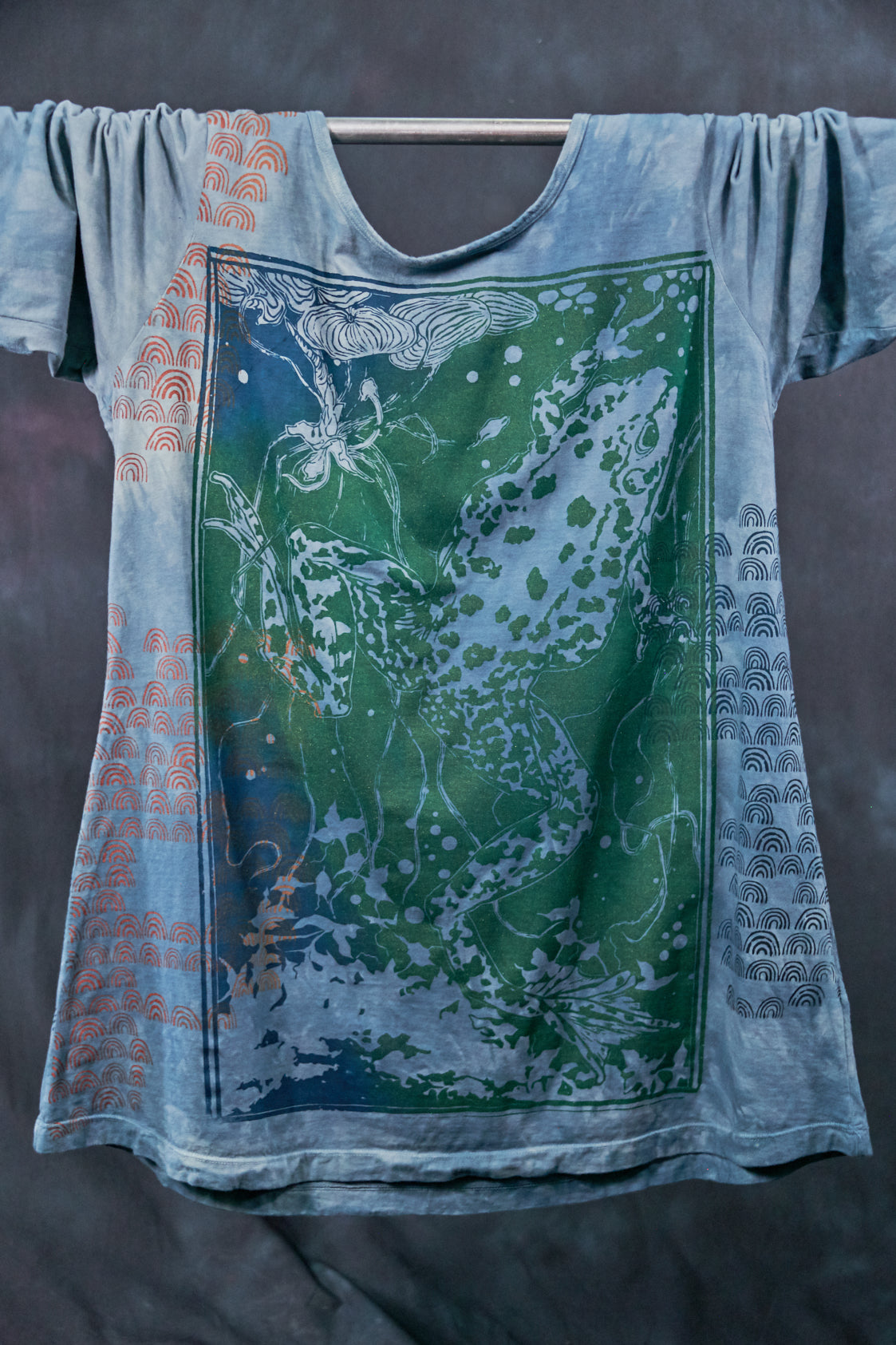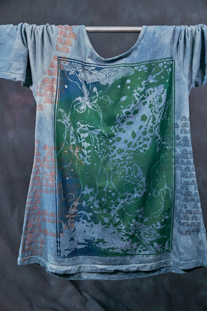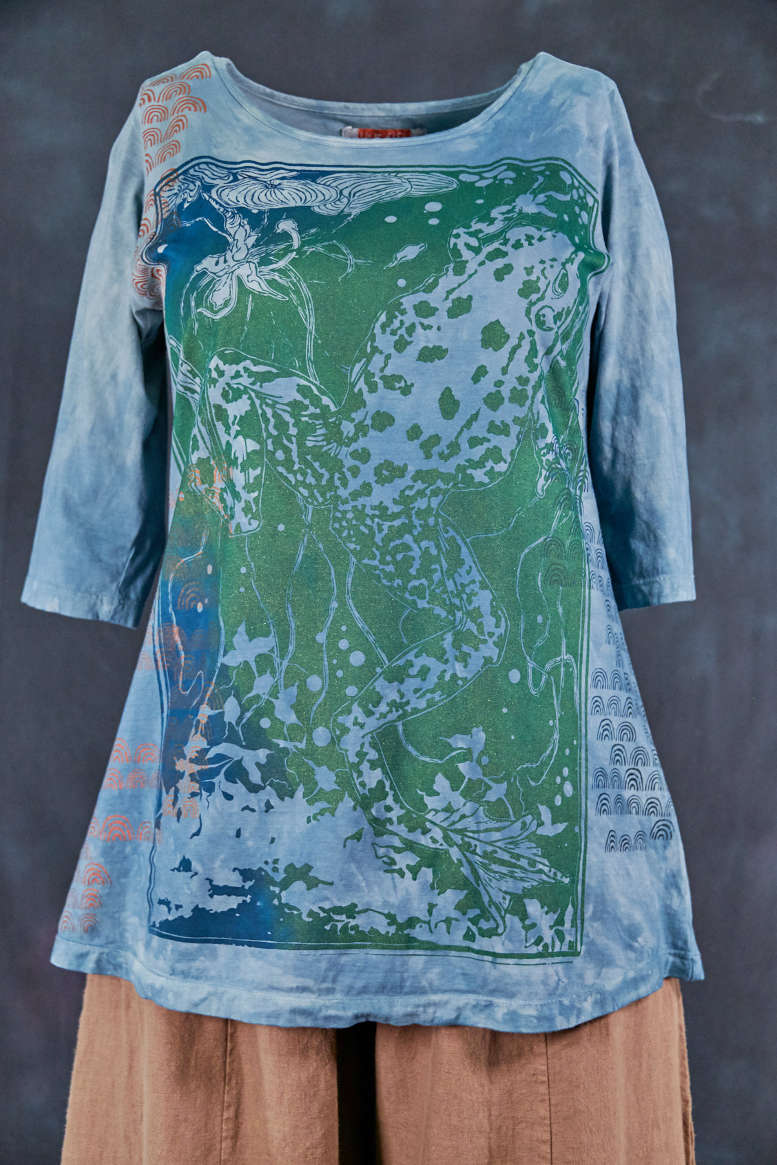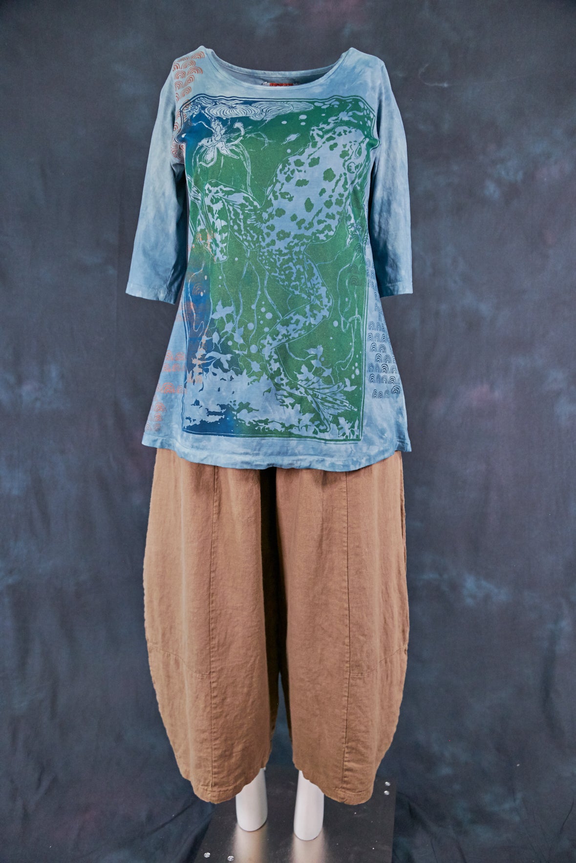 This lovely and varied tonal hand dyed tee is printed with a subtle frog design; if you look carefully, you will see it within the gradations of greens and teal. There is also textural accenting running down the edges of the print, in complementary shades of cinnamon and teal. For those of you who have requested a lass voluminous fit, this new tee is a slightly slimmer fit, A-line tee. Please see the measurements below to choose your proper fit. This tee has been hand dyed in our studio and features a lovely rich color and textured dye appearance.