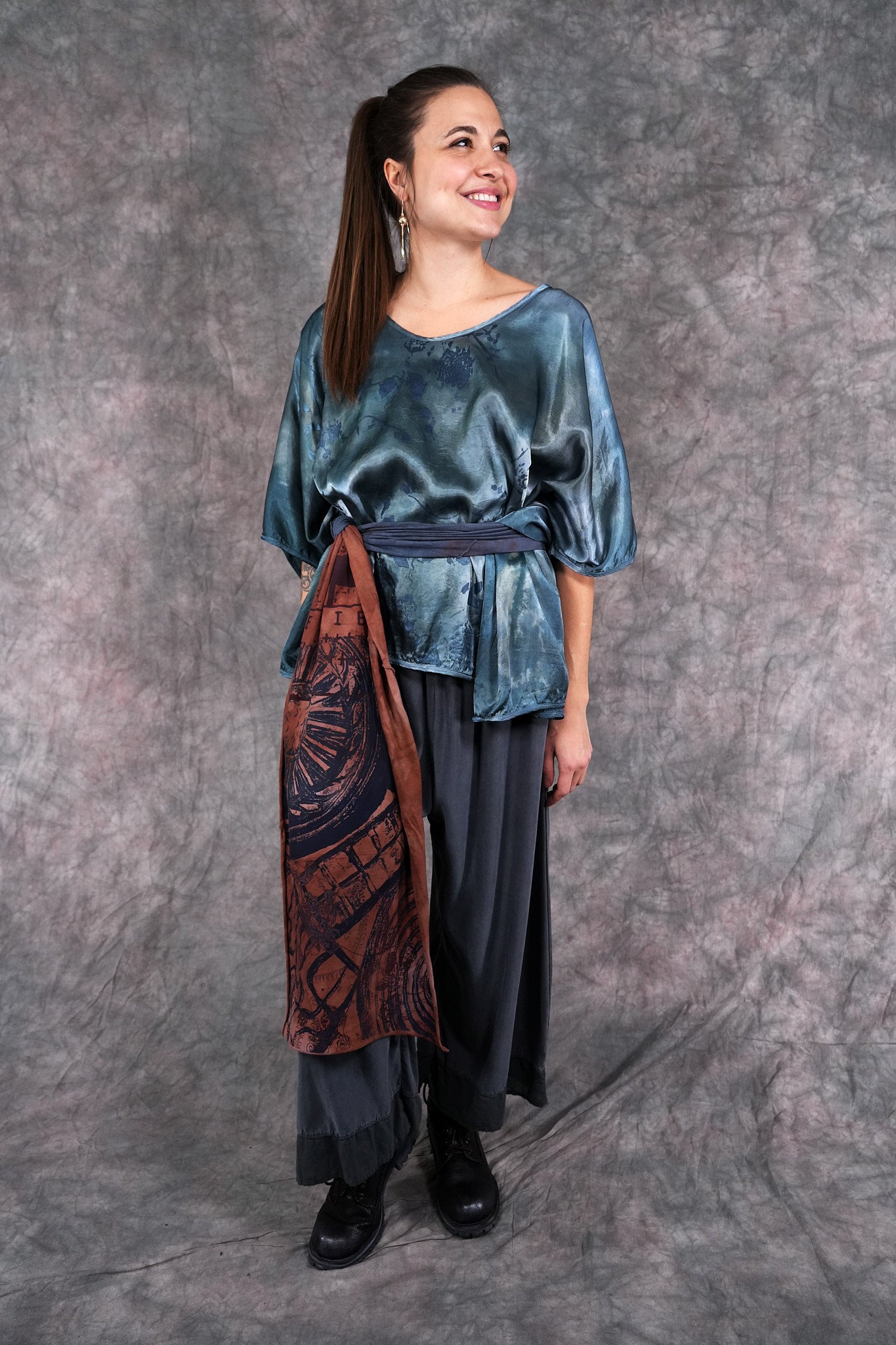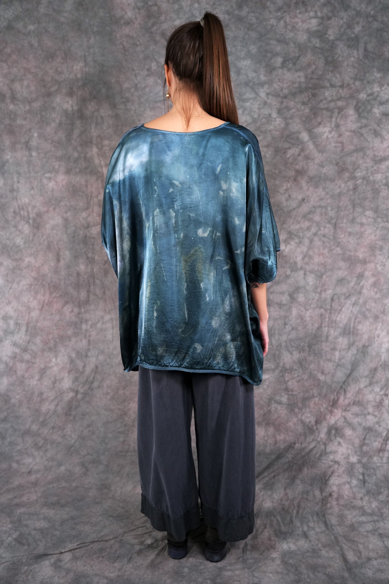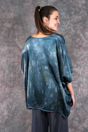 Silky and washable! Great travel piece, dresses up anything in a moment. Hand Dyed and printed , the effect is of watery depths, shimmering in the light.
