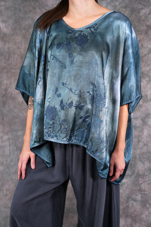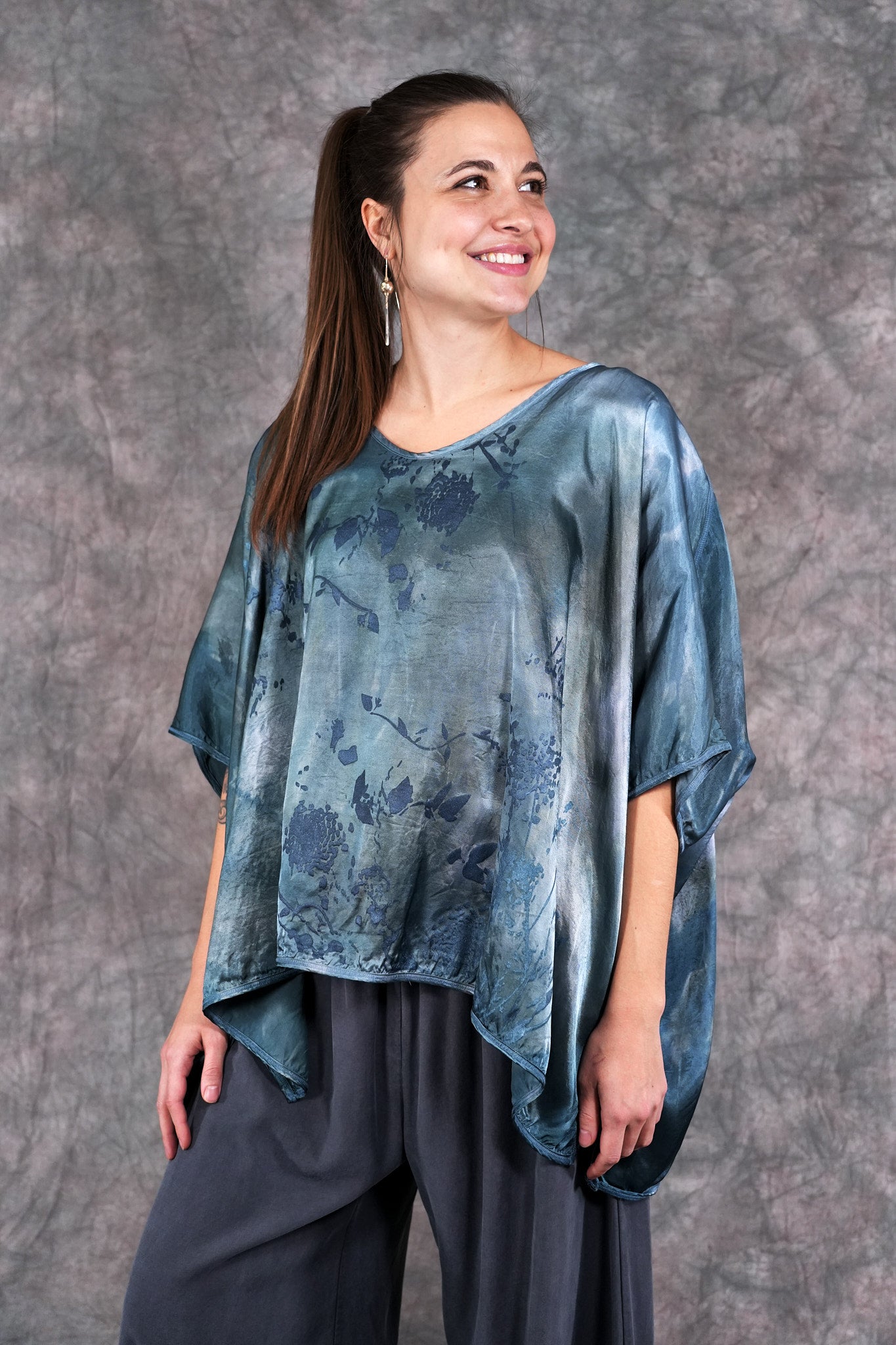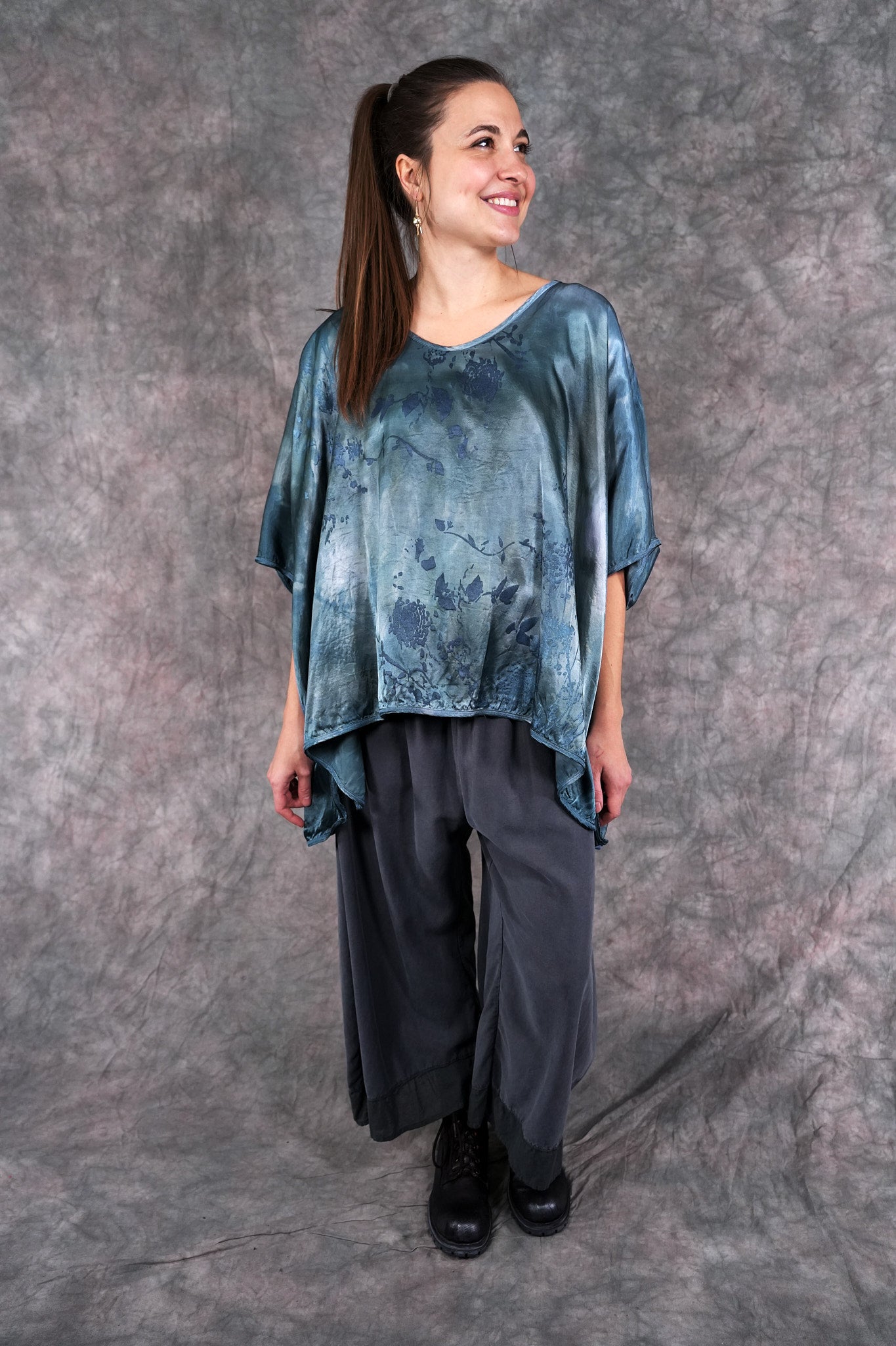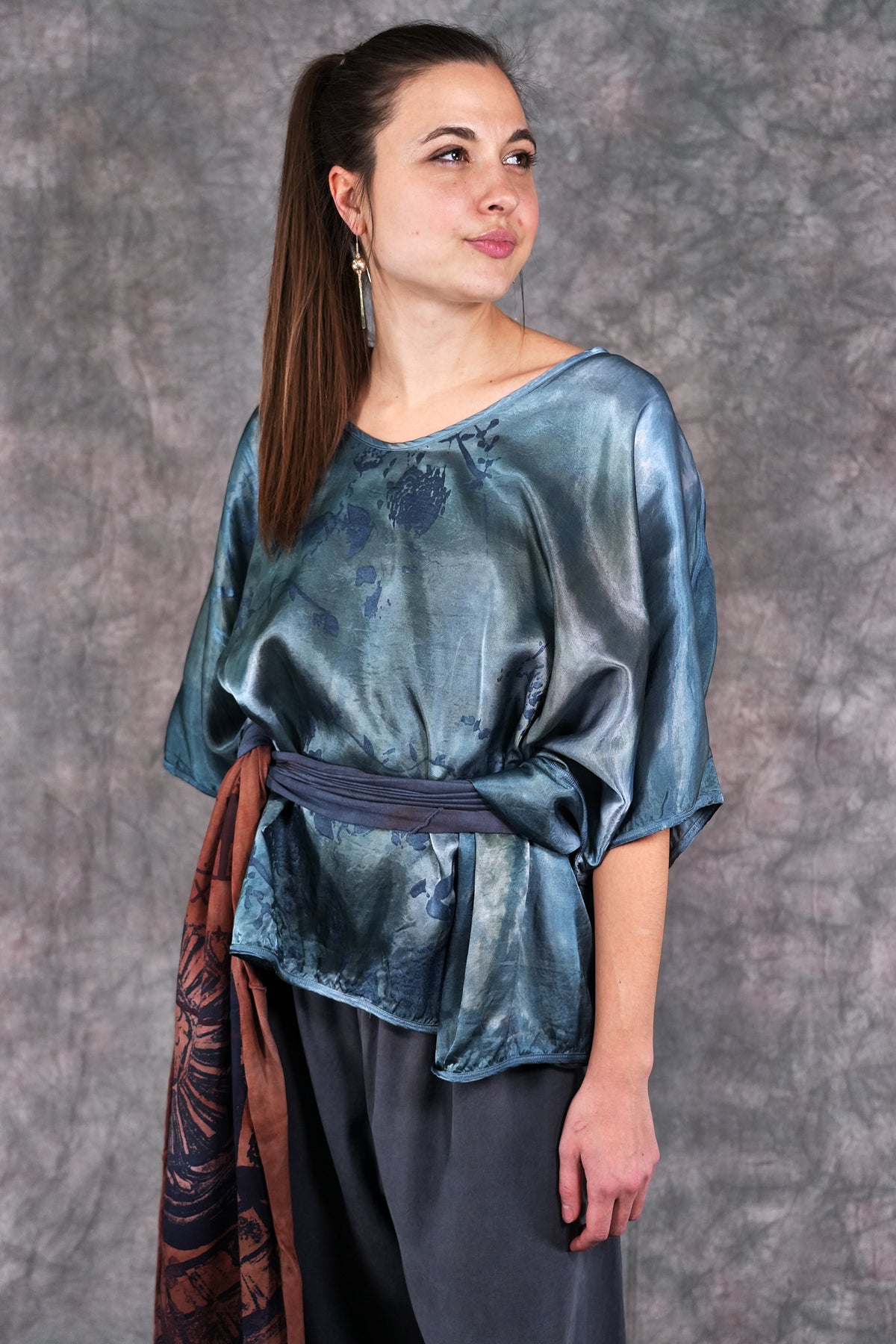 Silky and washable! Great travel piece, dresses up anything in a moment. Hand Dyed and printed , the effect is of watery depths, shimmering in the light.