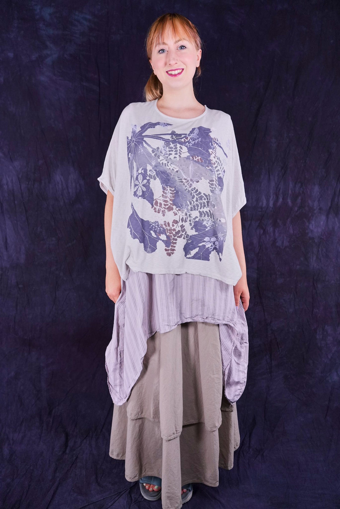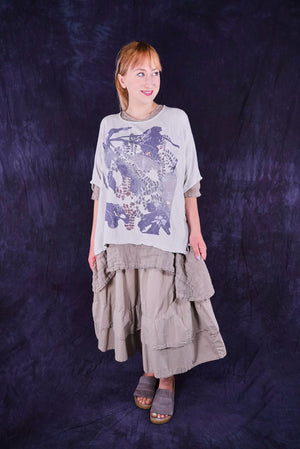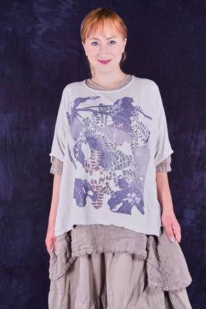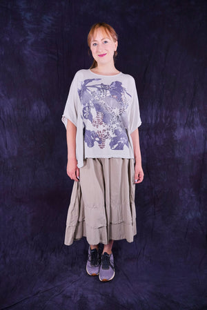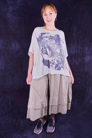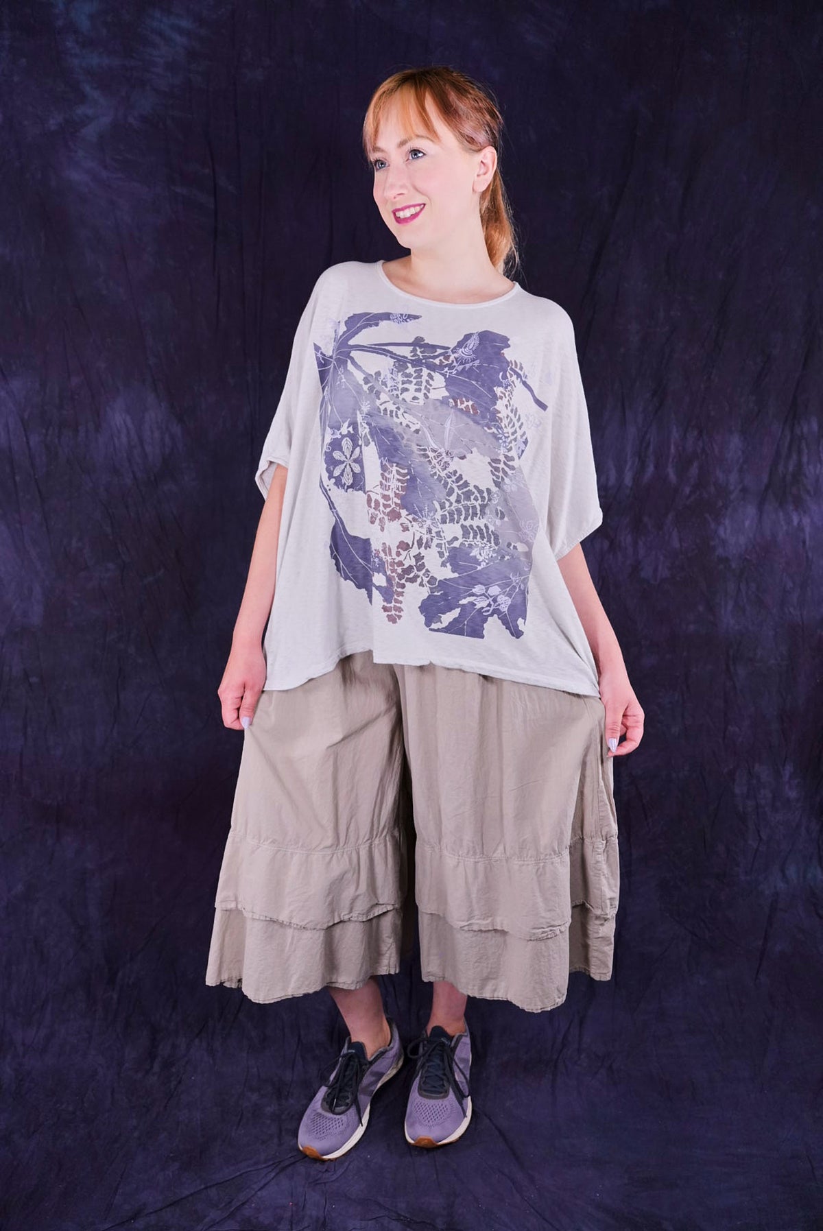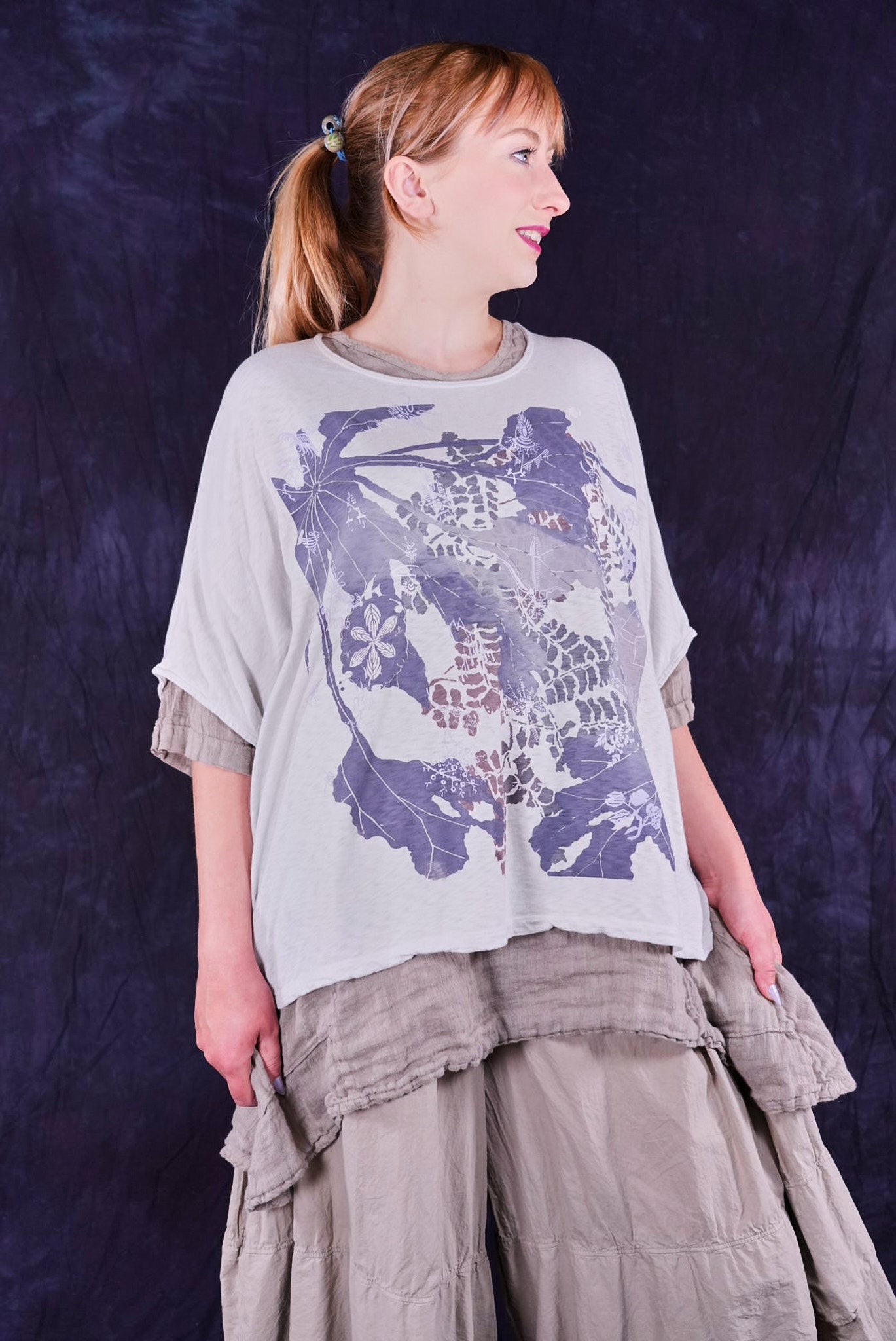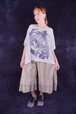 Only a few Light as air organic cotton fabric with beautiful prints to bring you joy! These boxier cropped tees can be worn alone or as a over layer to longer tanks and Mid-layers. It's a multi-purpose tee. Try this layered over lightweight 2315 in linen, or over the striped Hado Shift.