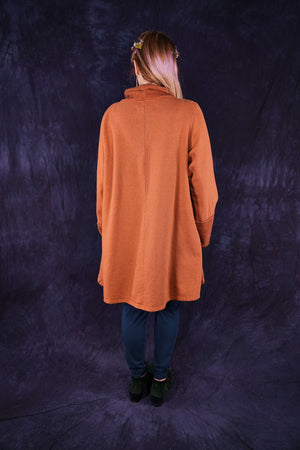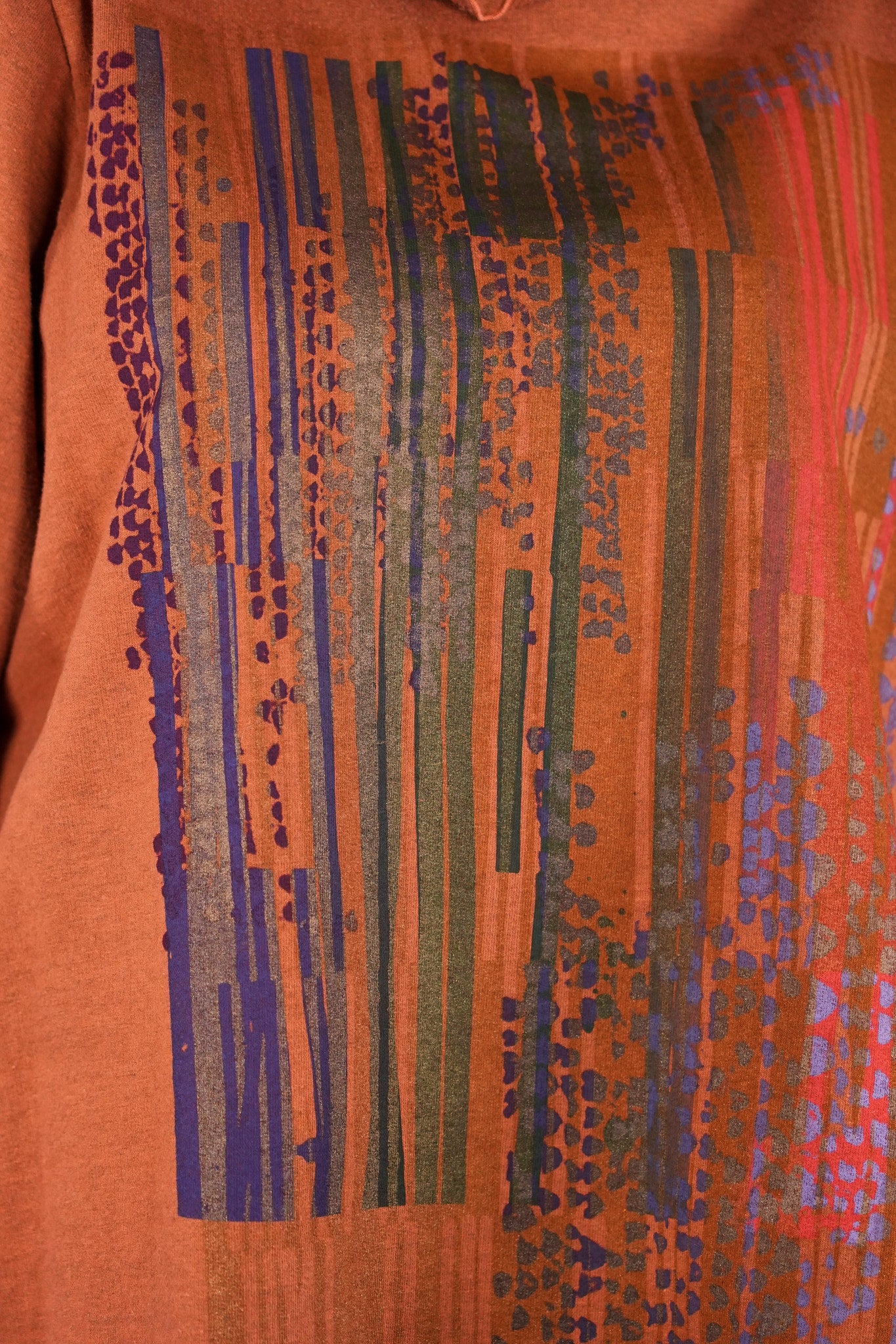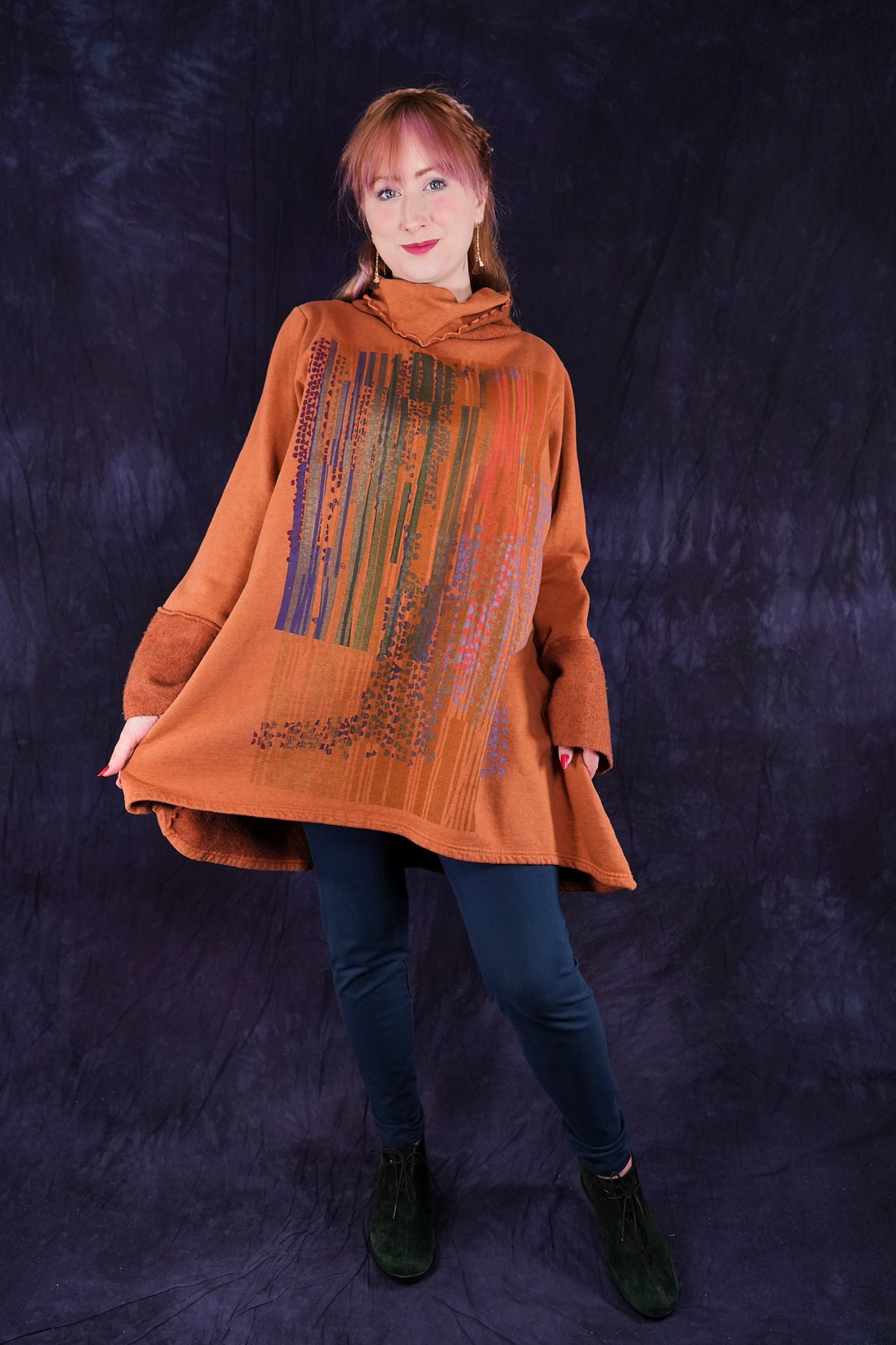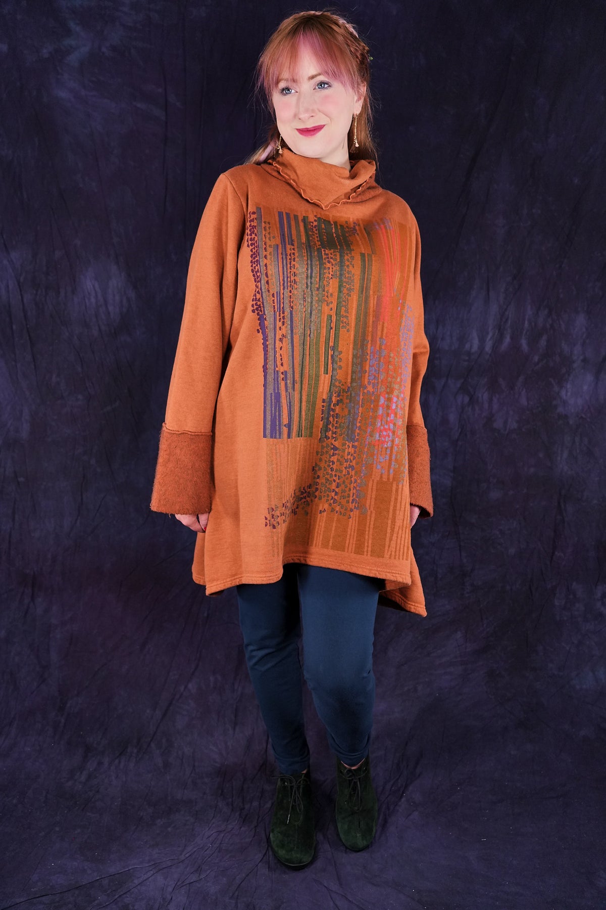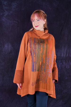 Flattering A-line shape and fuzzy cuff detail. This is the essence of coziness and style in a beautiful fall color. Look closer at the colors of the hand printing. Will coordinate with many items.