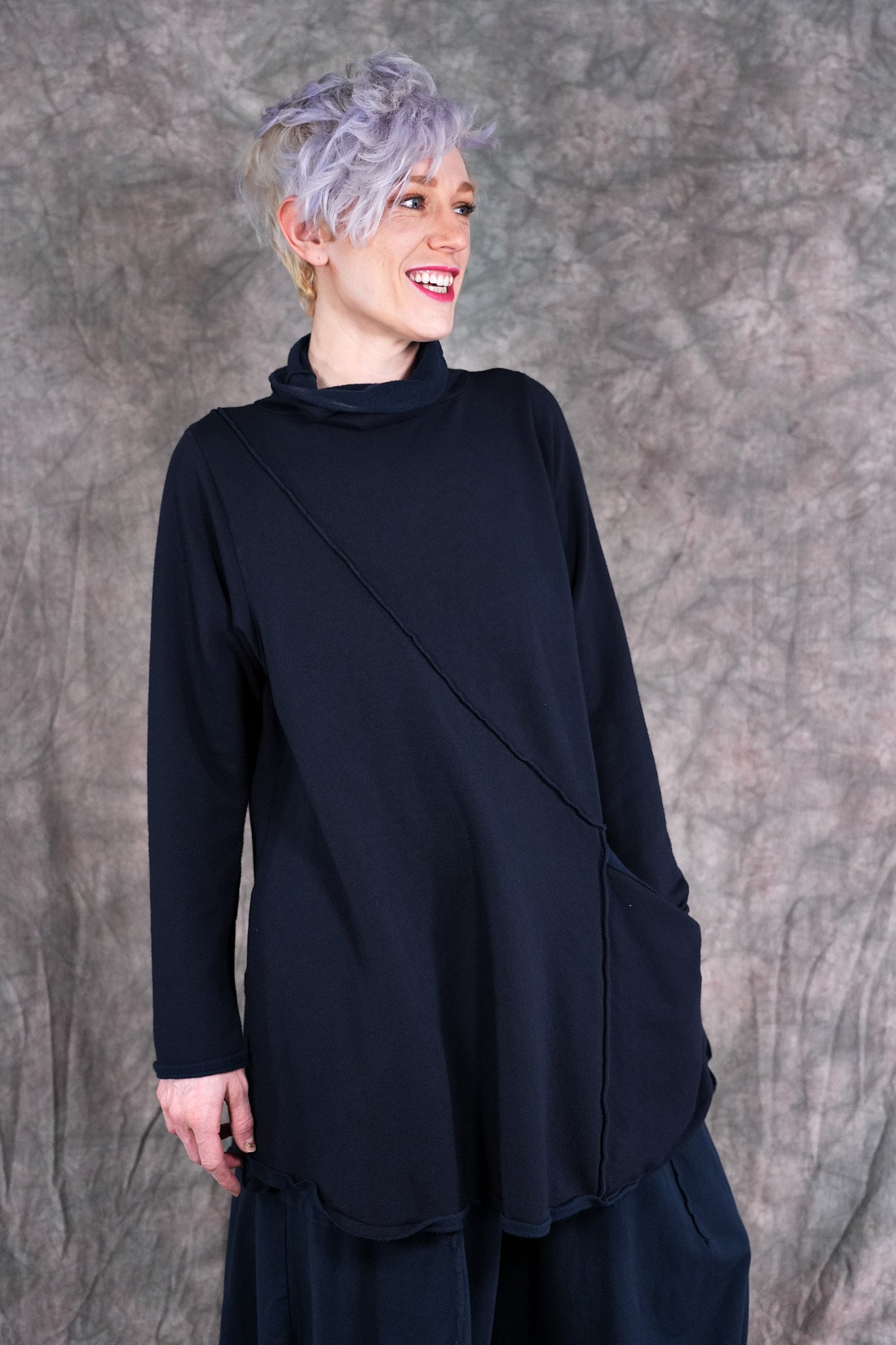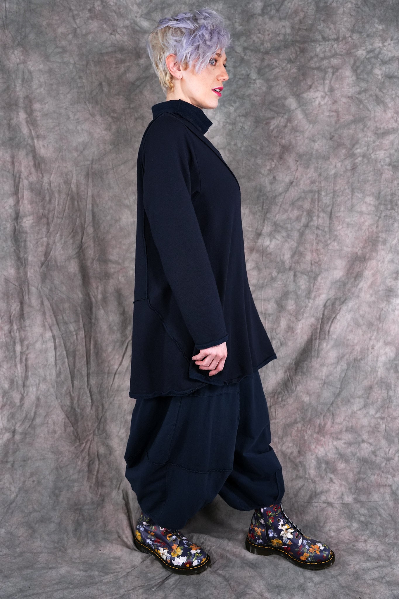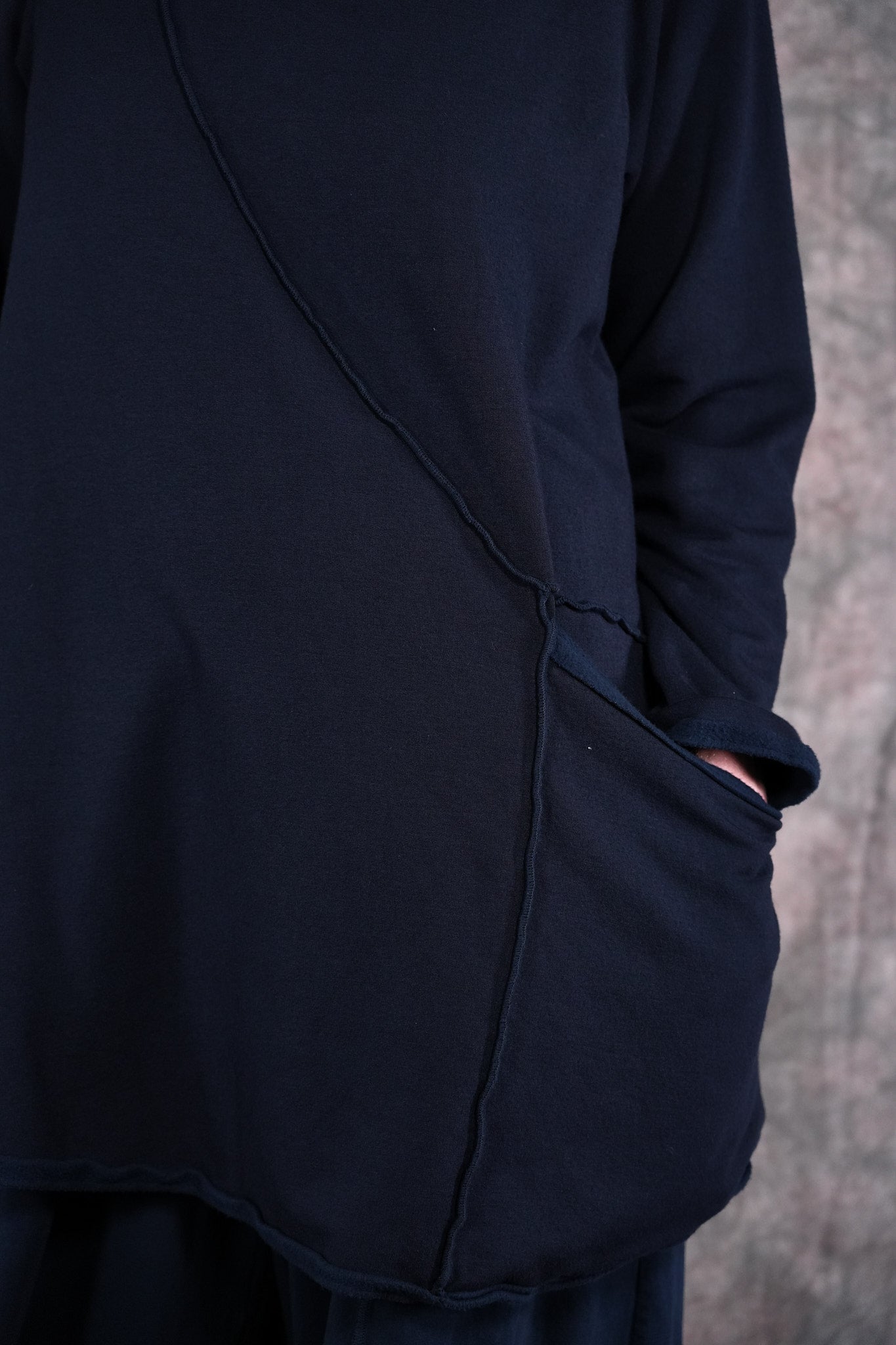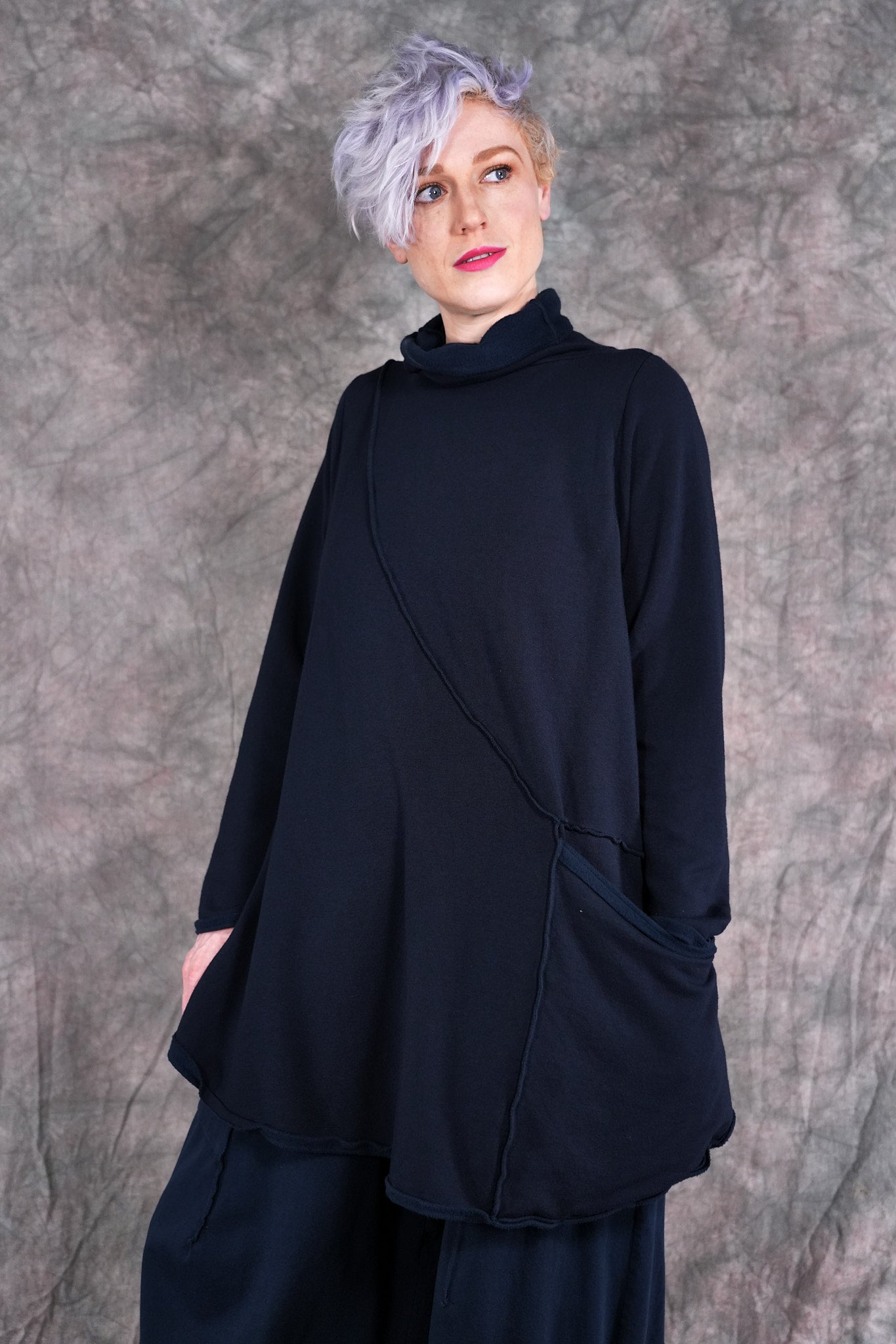 Well, we made too many and we want to share them with you- so here they are at a great price! Made from incredibly soft organic cotton modal stretch fleece. Smooth outside, plush and cozy inside. or wear it reversed. Large off center pocket. Flattering seams and shape, will keep you warm without weighing you down. A great sweatshirt to layer!