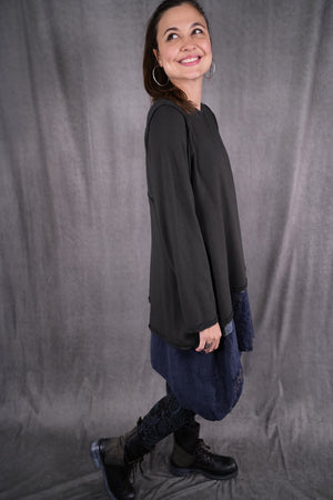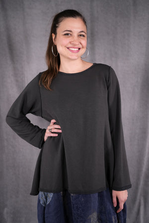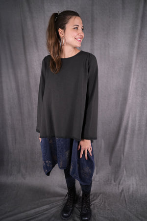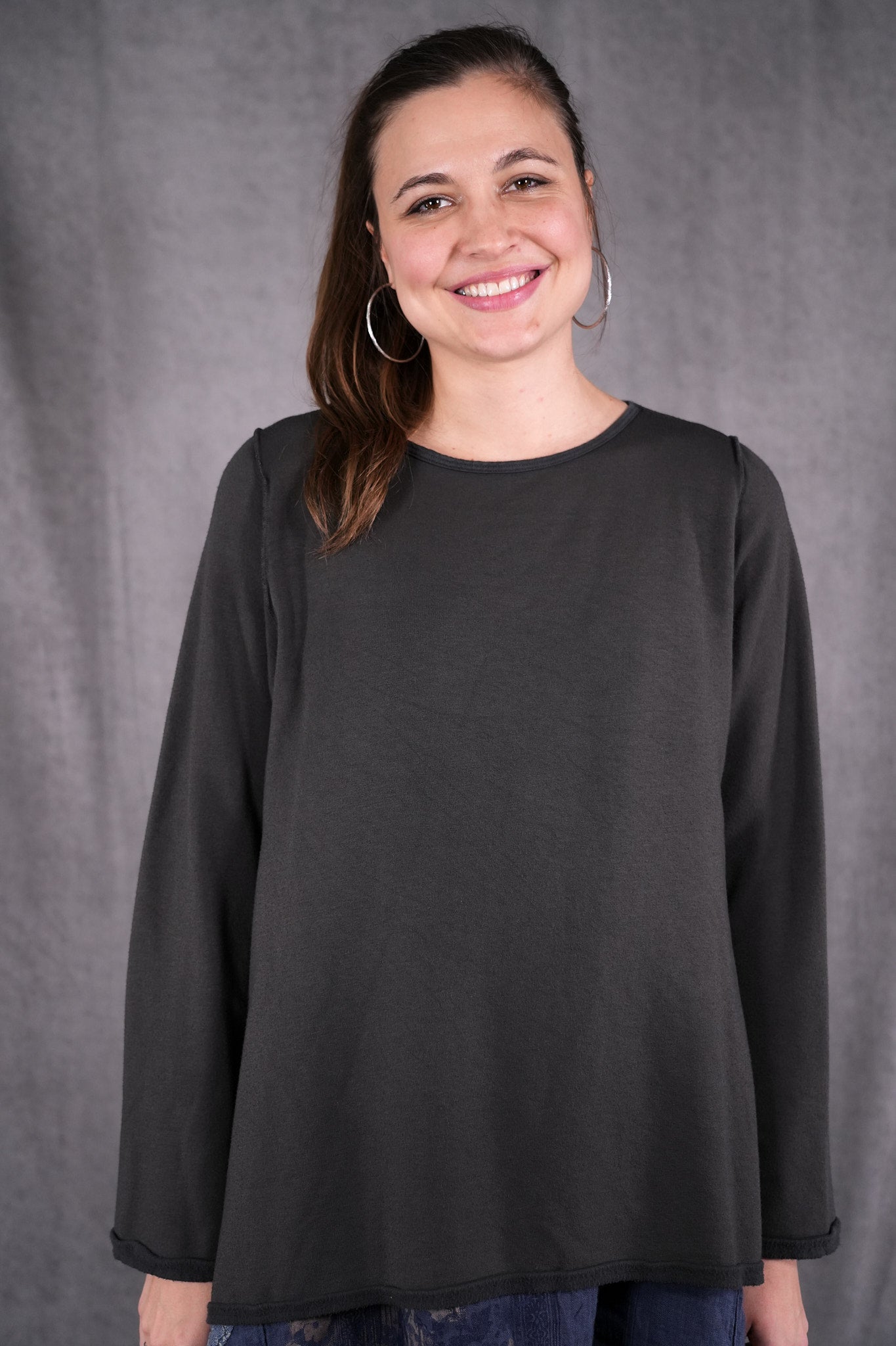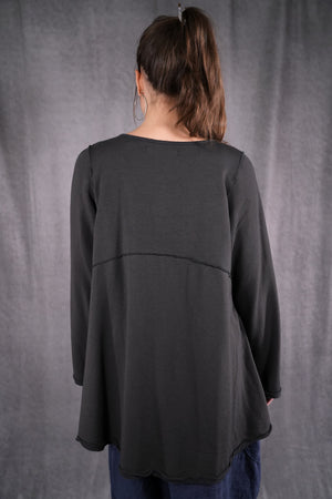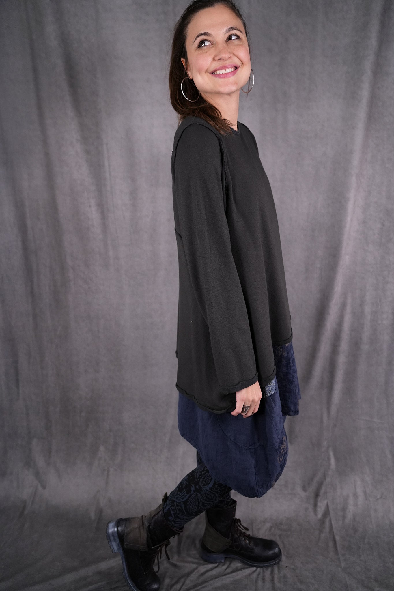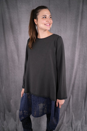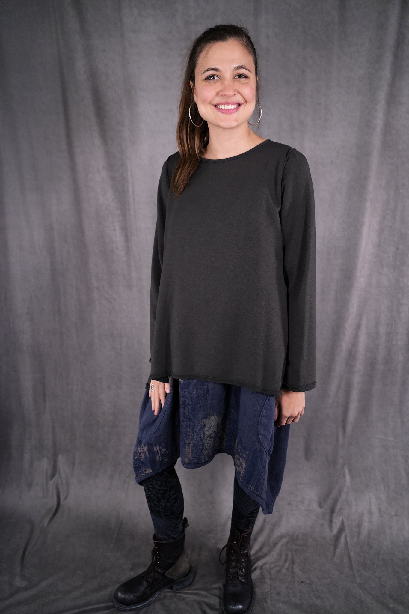 Smooth on the outside, super soft plush on the inside...this fabric is thick and stretchy and fits really well. Cut in a flattering shape, the back is longer than the front at the hem- just the right amount. Made in the USA from a blend of 67% organic cotton fleece blended with modal for a silky luxe feel, with a beautifully curved hem giving it a flattering shape and style. A piece that will mix with this collection as well as collections past .