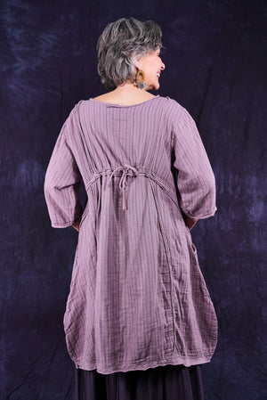 Drawcord back for shaping. Pockets, of course! A very good & useful travel dress.