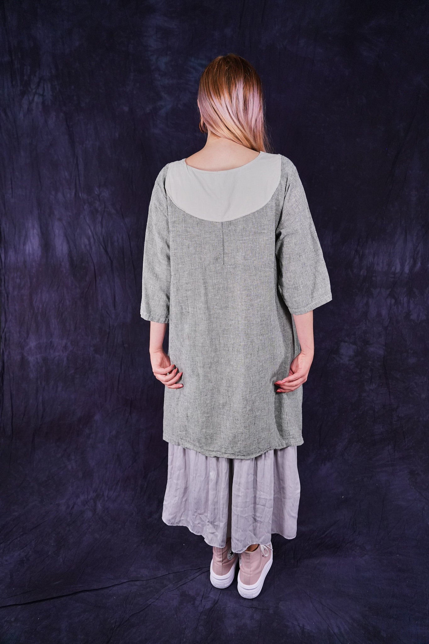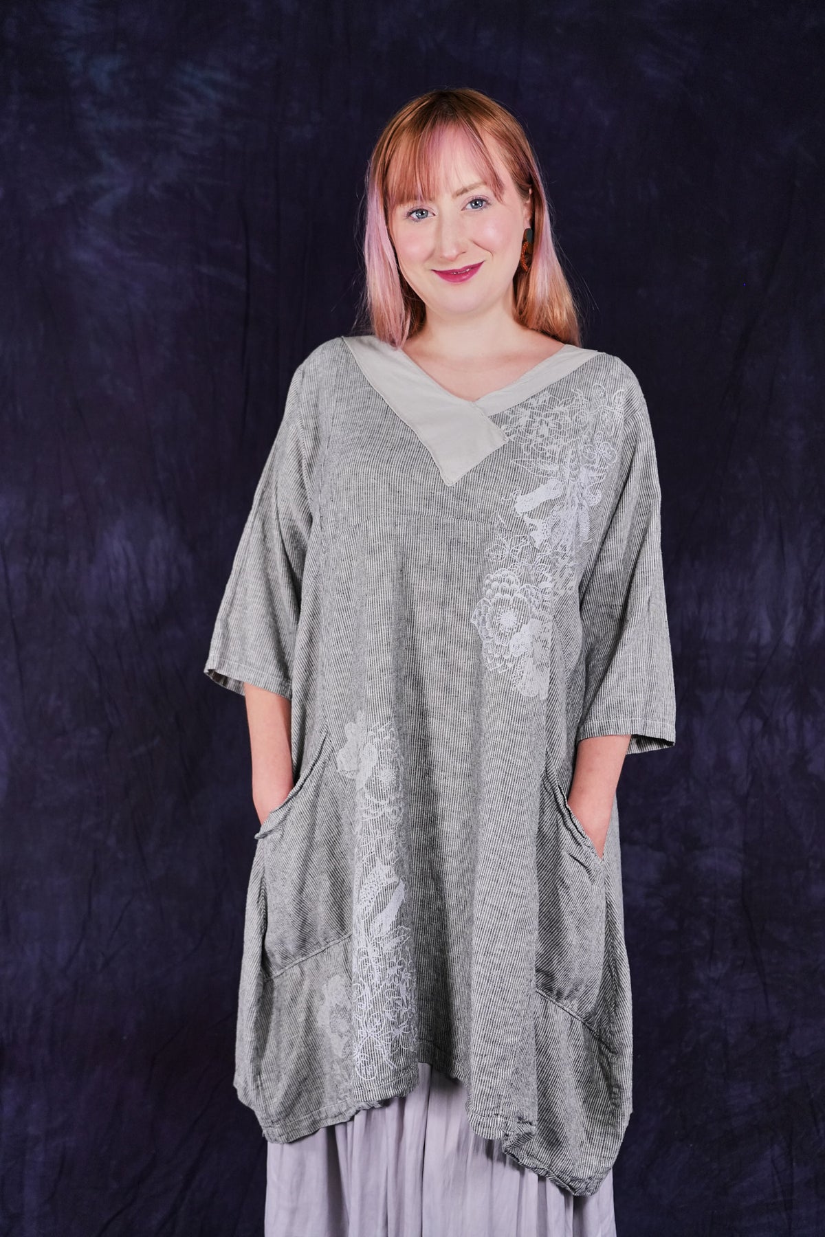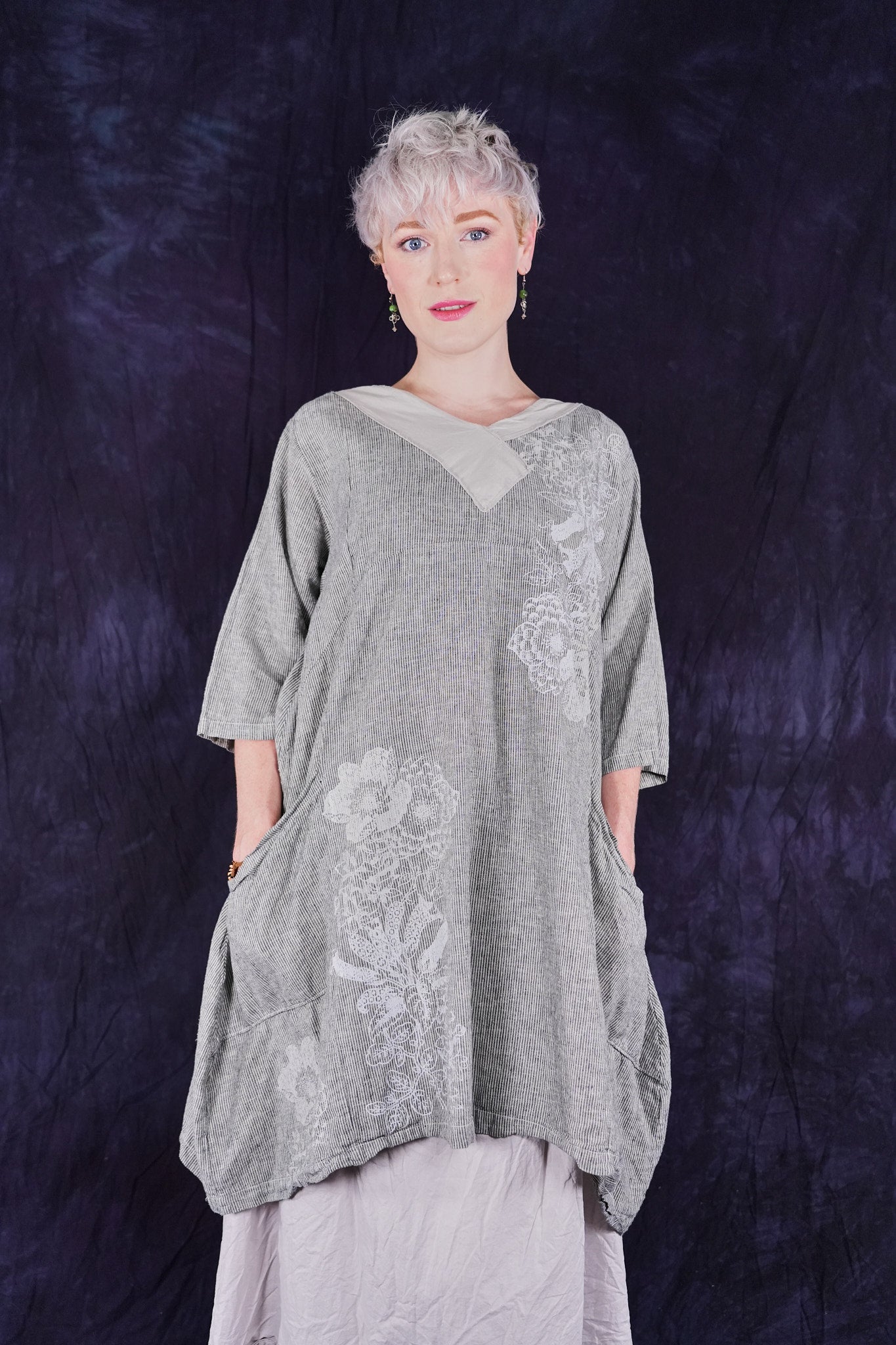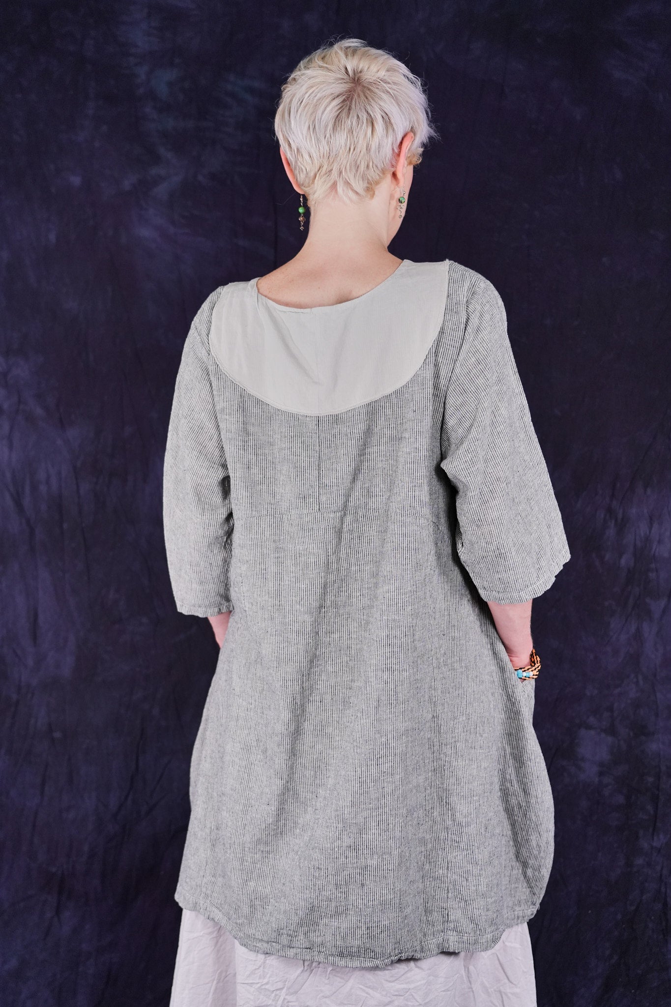 This is the piece, one of our classics and all time favorites! It has the shape of the Urchin tunic with the gorgeous crossover neckline. The fabric is soft and breathable with tiny stripes. Wear over pants, skirts or dresses it will make you feel happy...