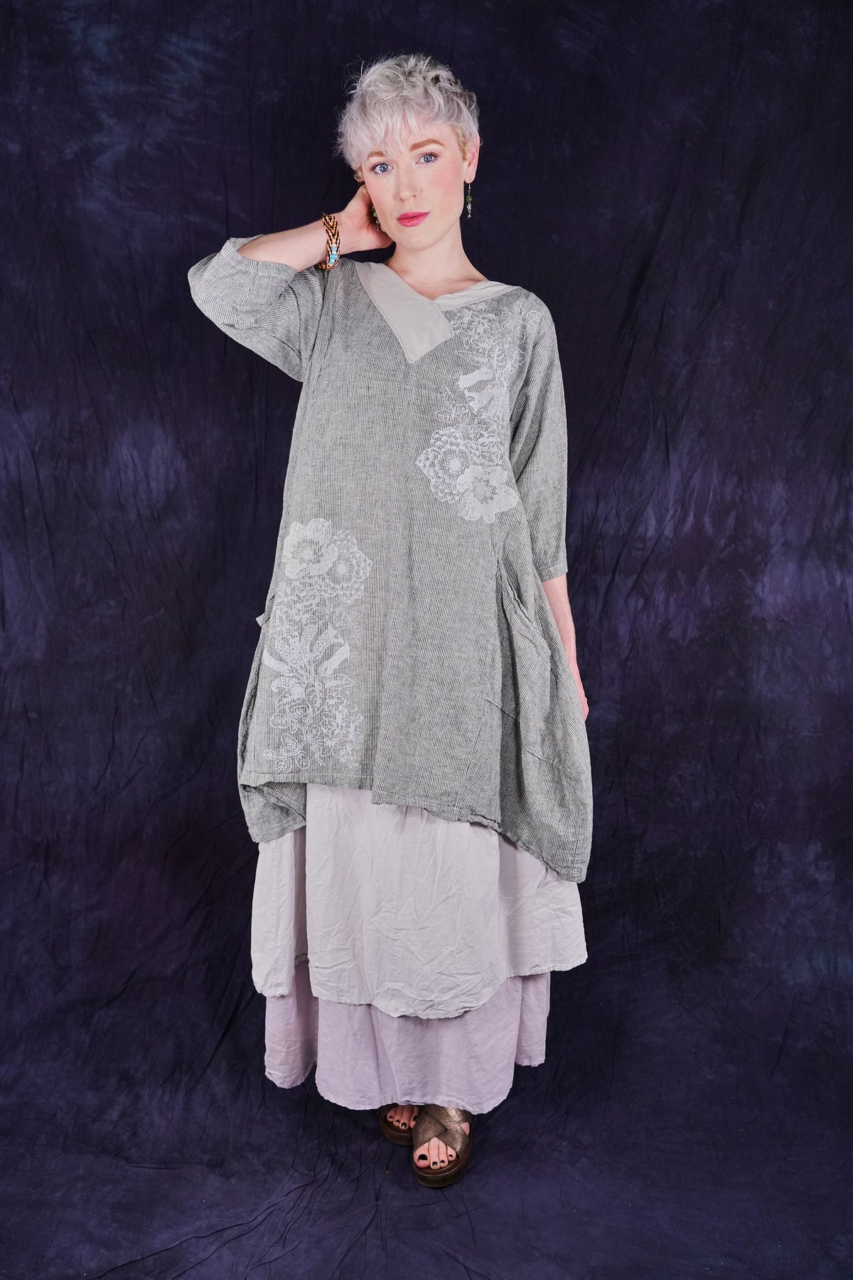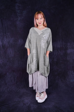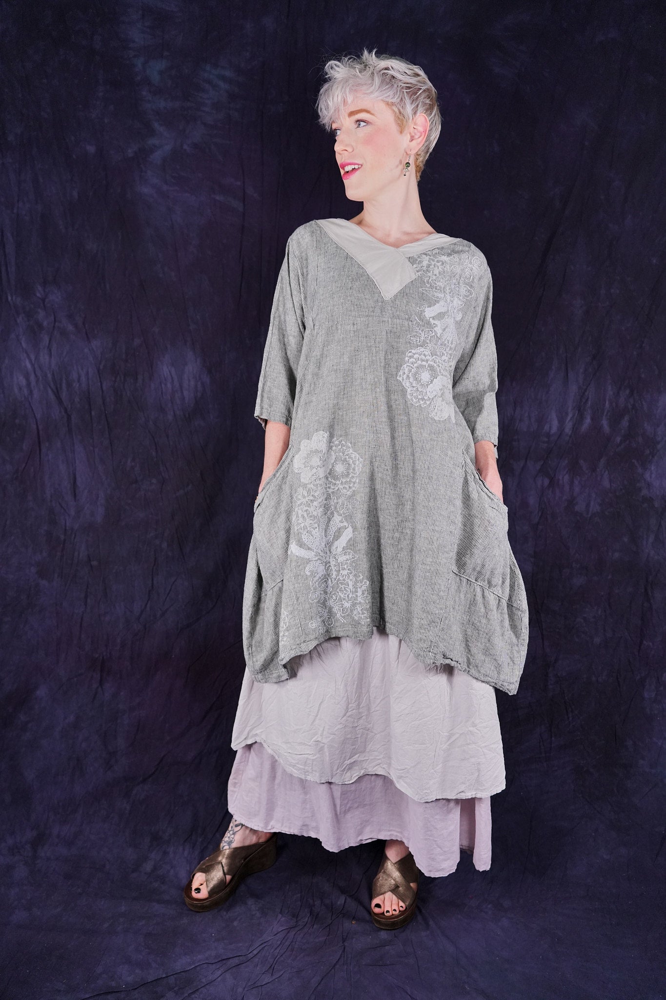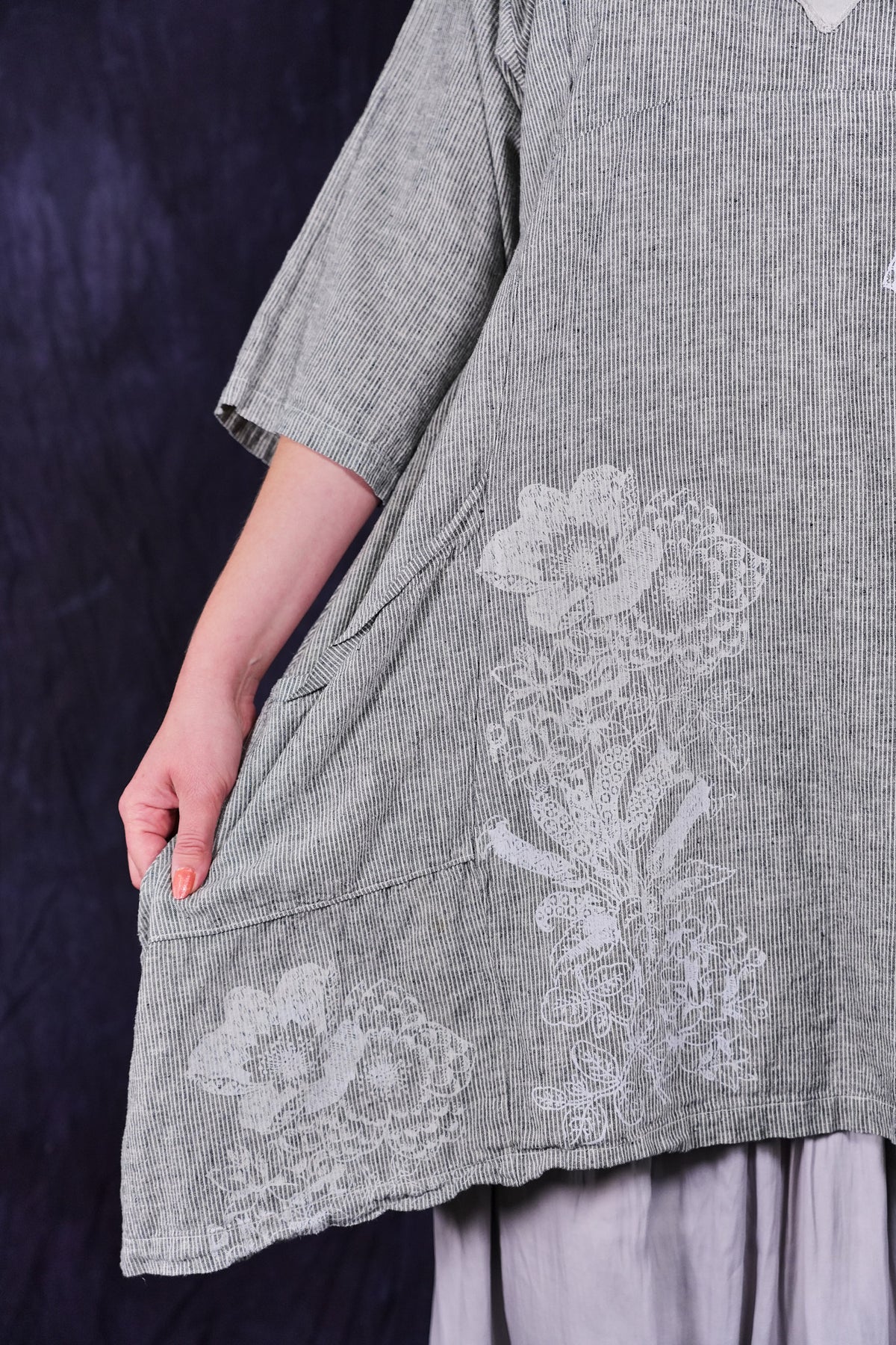 This is the piece, one of our classics and all time favorites! It has the shape of the Urchin tunic with the gorgeous crossover neckline. The fabric is soft and breathable with tiny stripes. Wear over pants, skirts or dresses it will make you feel happy...