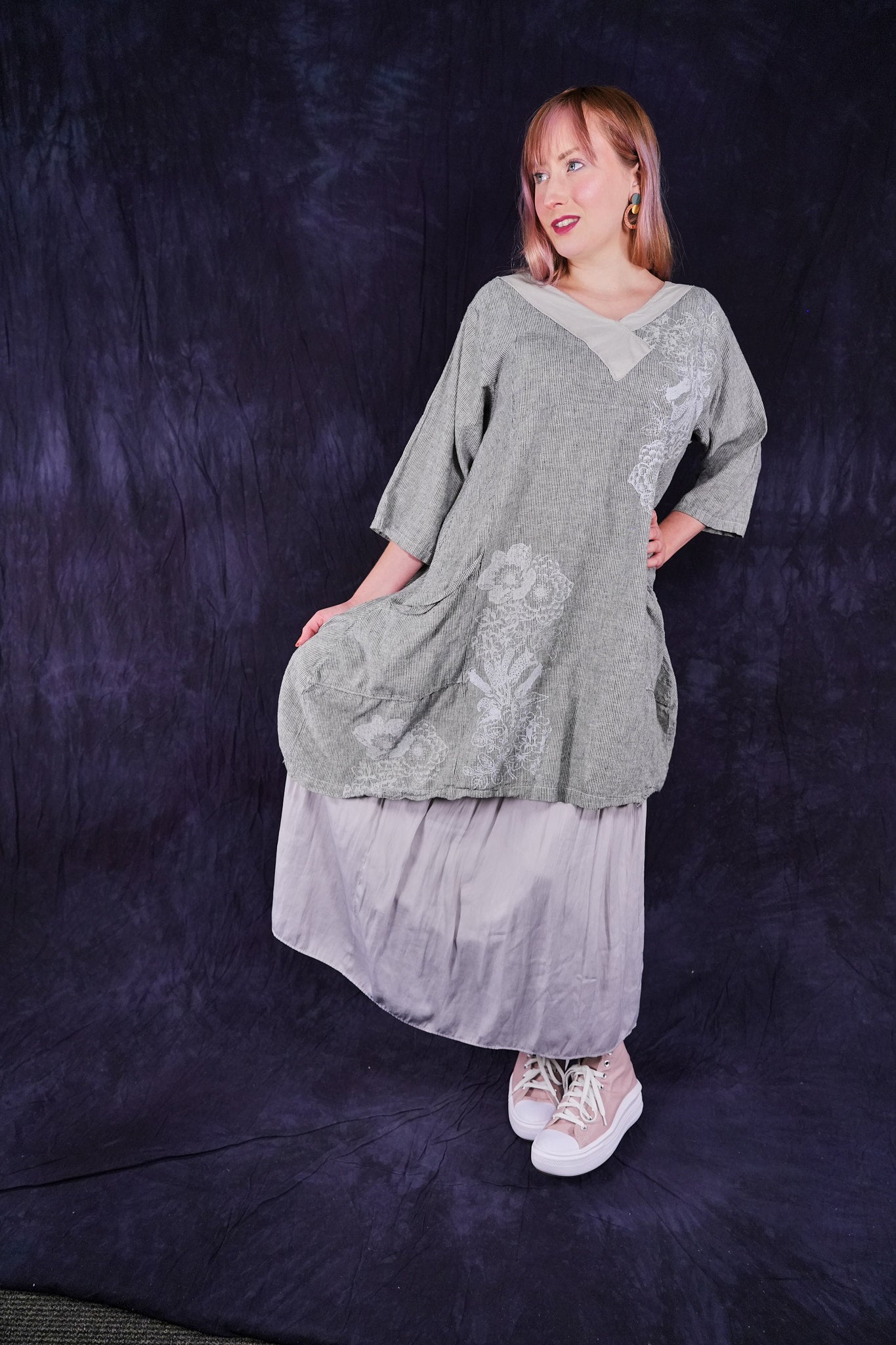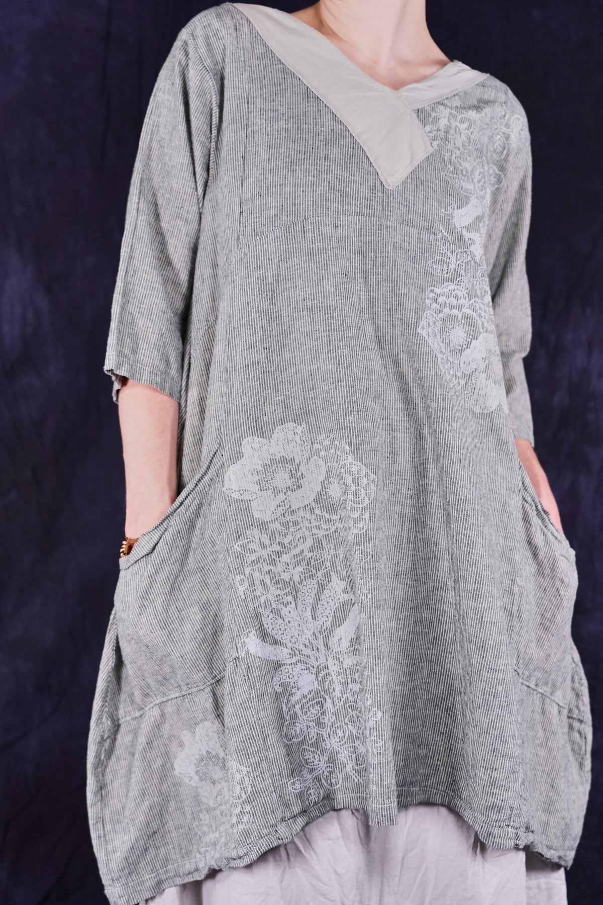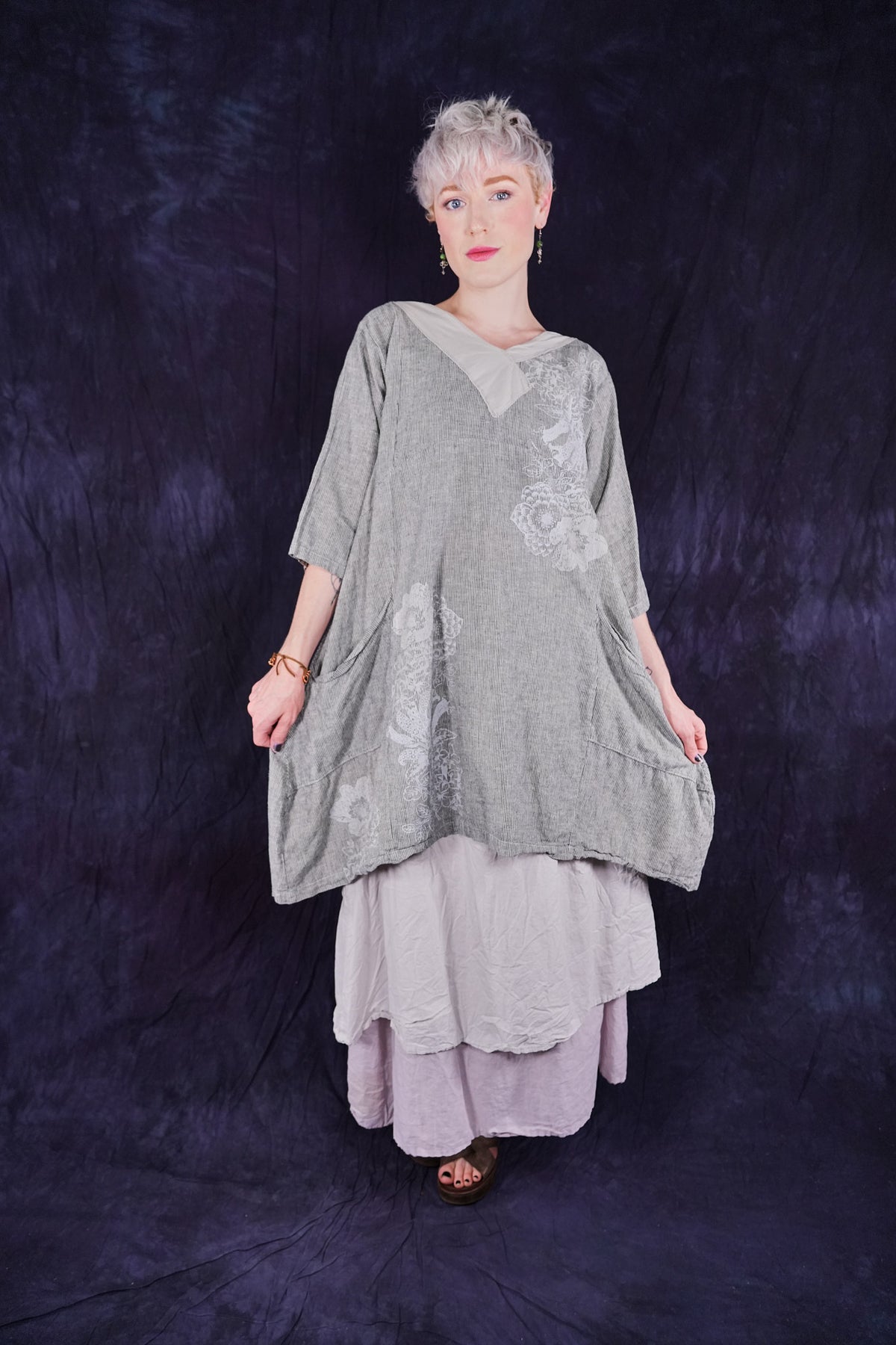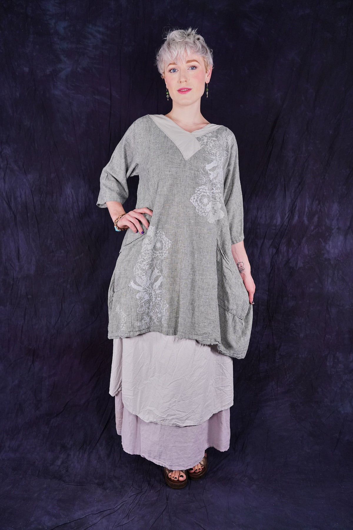 This is the piece, one of our classics and all time favorites! It has the shape of the Urchin tunic with the gorgeous crossover neckline. The fabric is soft and breathable with tiny stripes. Wear over pants, skirts or dresses it will make you feel happy...