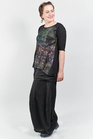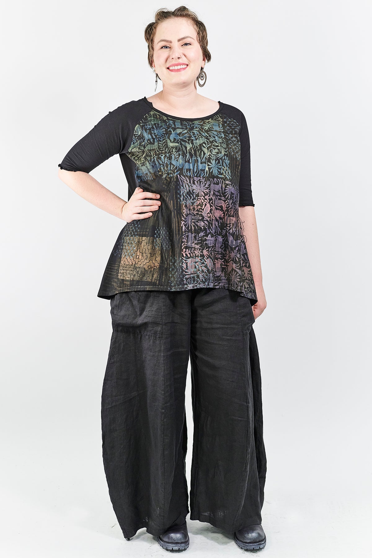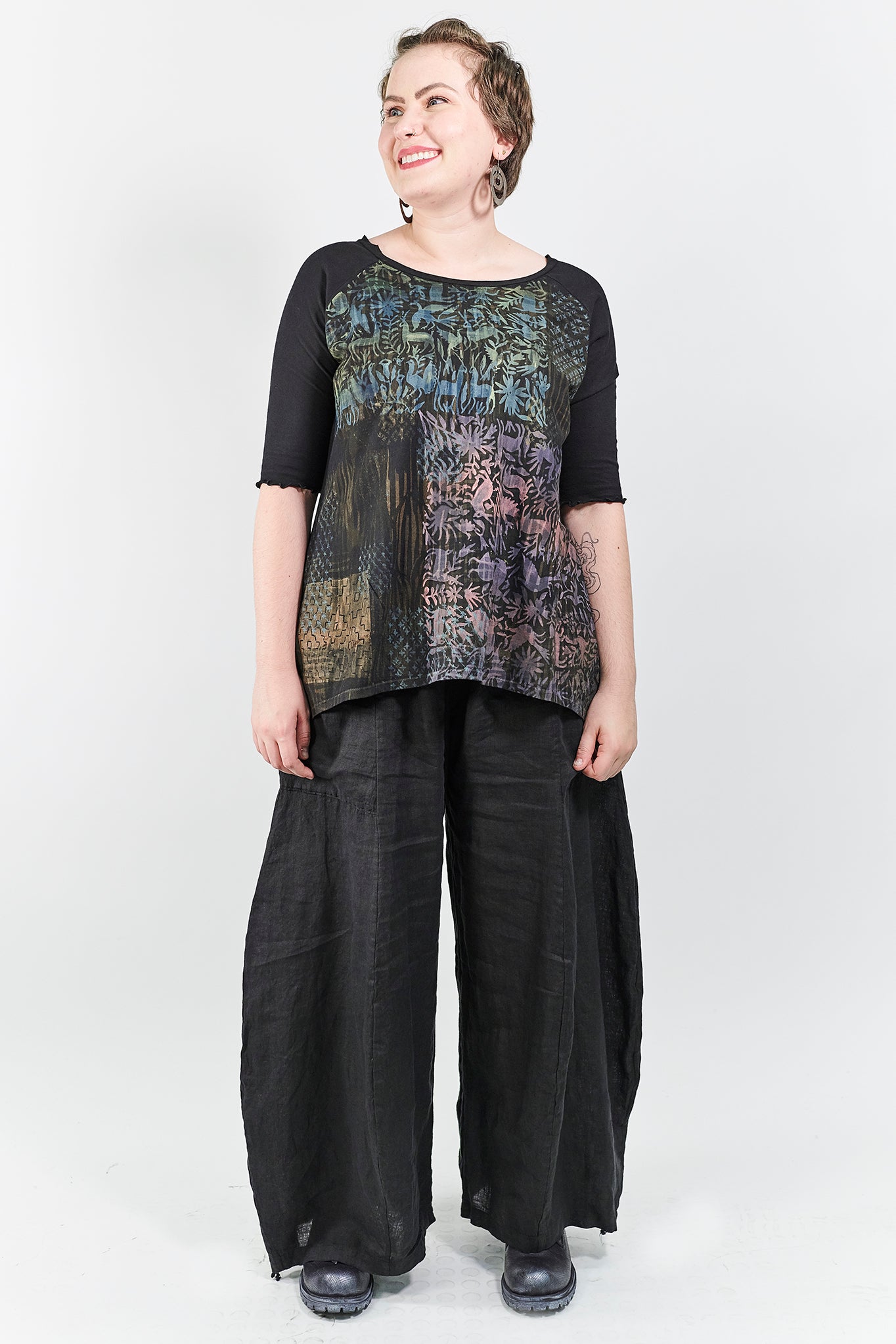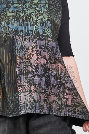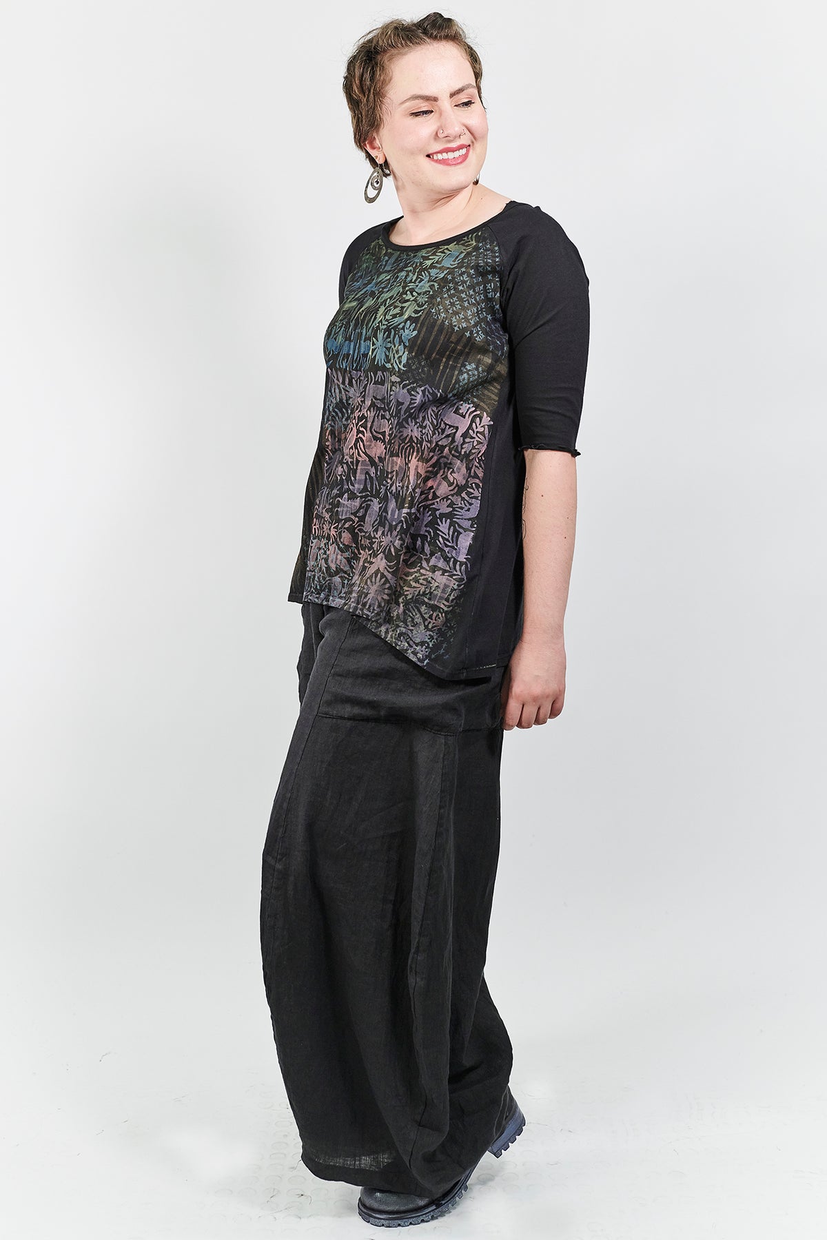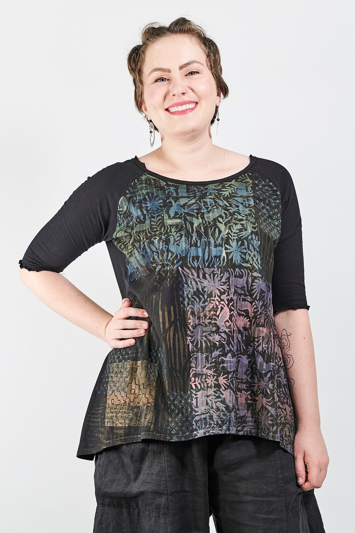 This top, made from light weight organic cotton jersey, has fitted sleeves to the elbow and bright and fun hand printed designs on the front. The shaping is more fitted at the top and gently A-lined out to the hem, not too big. Wear alone or under one of our Apron Jumpers or a Striped Jacket.