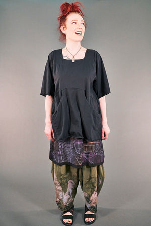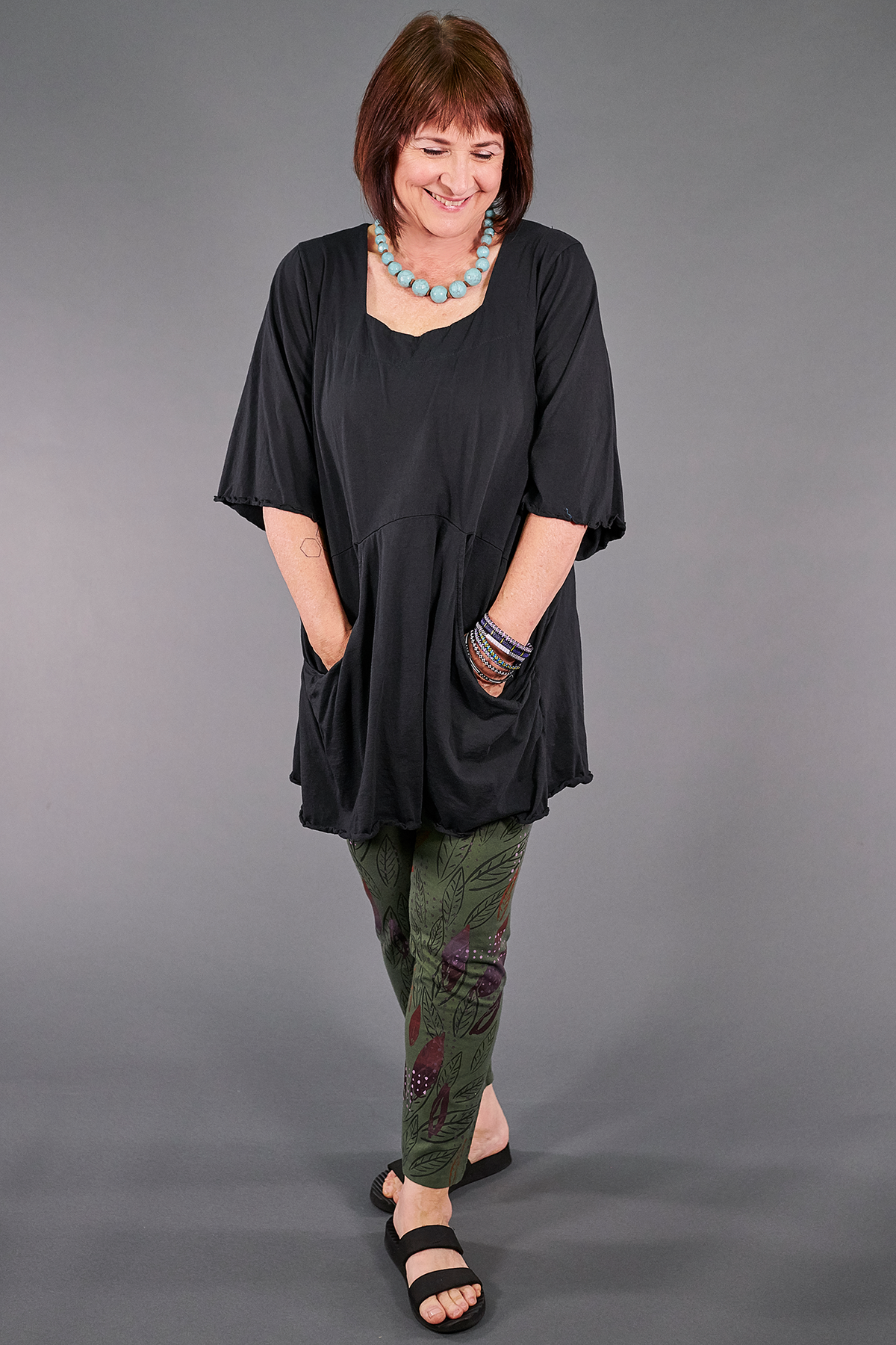 A beautifully feminine top fit for an artful queen of comfort and style. This flattering tunic features a softly squared neckline and gentle shaping through the bodice, ending in a slightly flared hemline. Set-in functional pockets and the softest organic cotton jersey make this top a dream to wear. Sleeves hit just above the elbow.