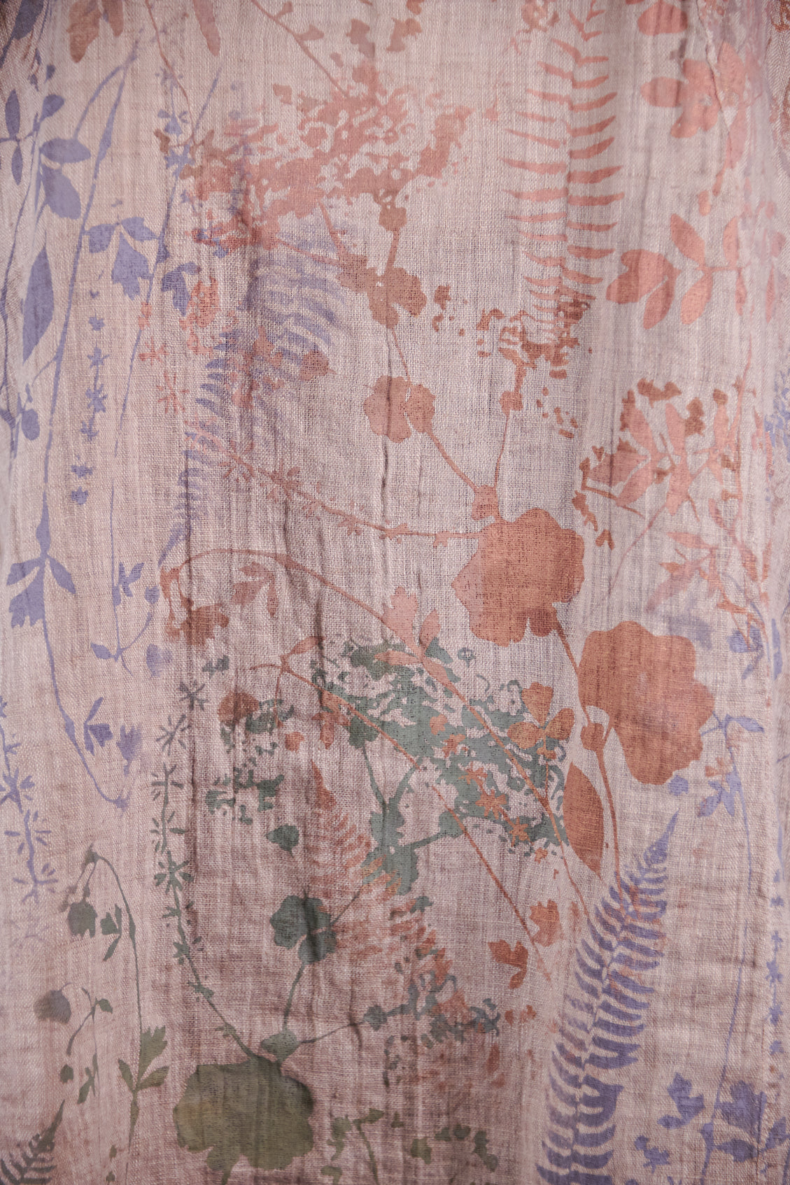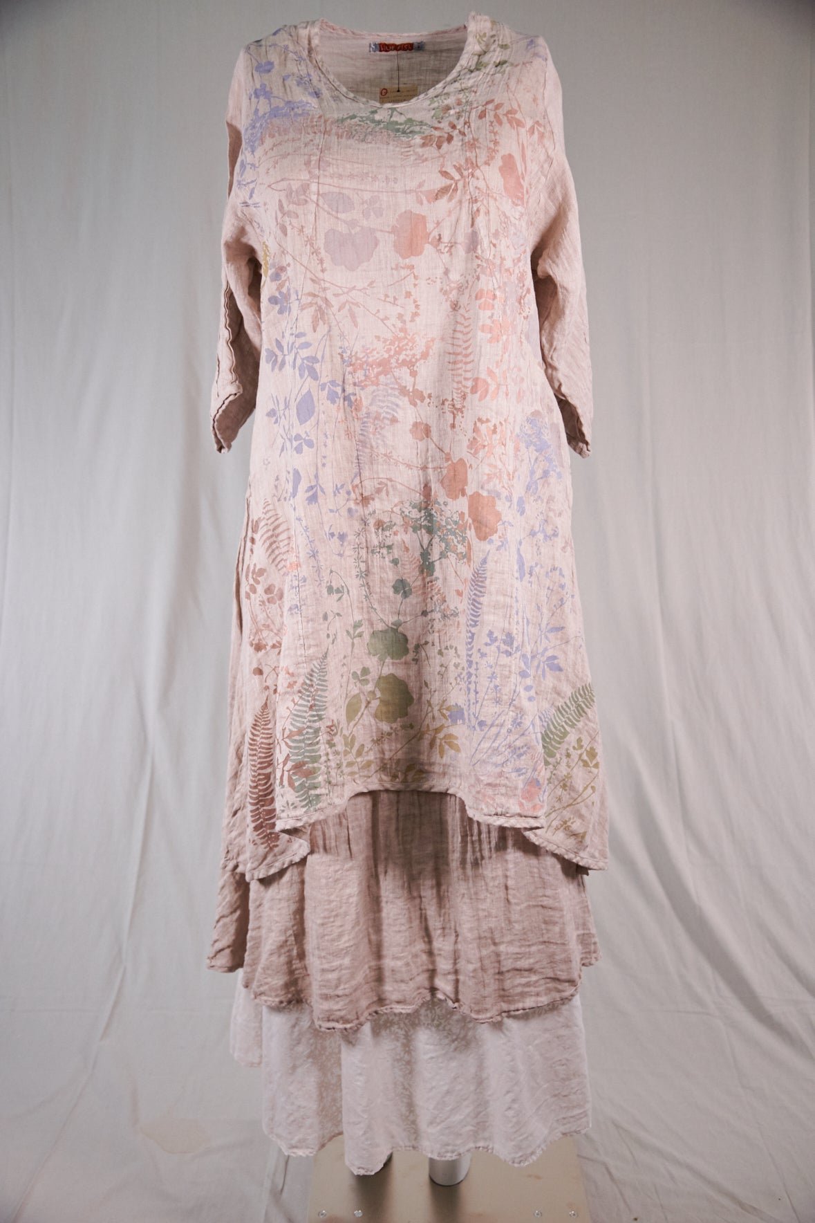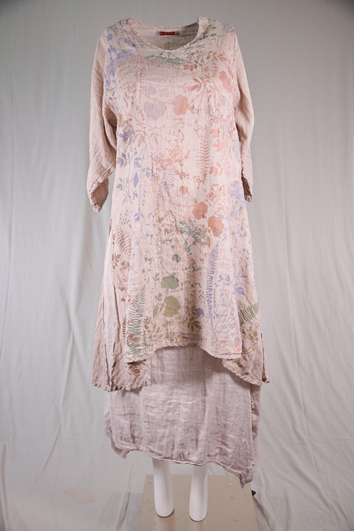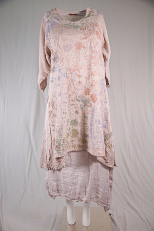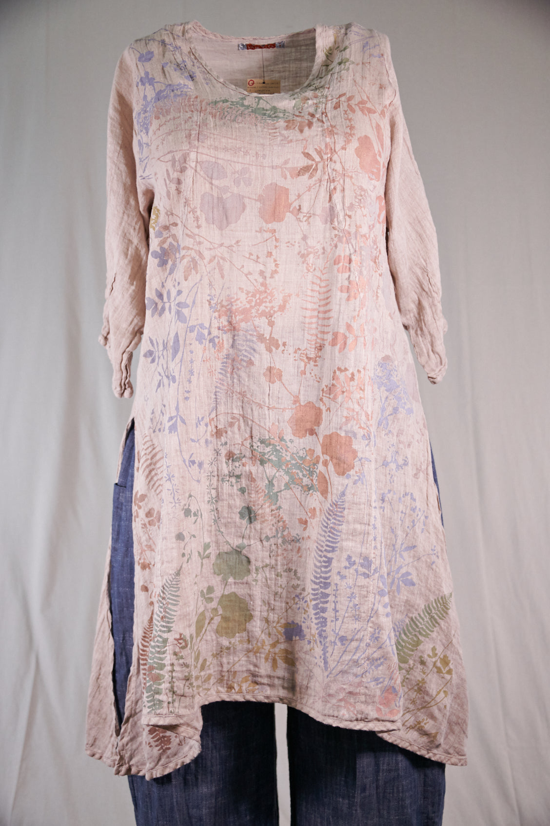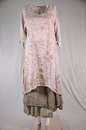 This graceful lightweight linen tunic has a softly V’d neckline, princess seaming on front and back and 3/4 length sleeves. Also features beautiful shaping that flatters the body without having a lot of extra fabric. Fitted look; PLEASE read measurements below. Size 2 will fit up to a size 16 comfortably. High side slits allow ease around the hip area. Limited print Subtle Botanical Garden. We have only a few of the skirts available #4177 Tiered linen skirt... or it also goes with the #4181 Sylph Skirt in Natural.