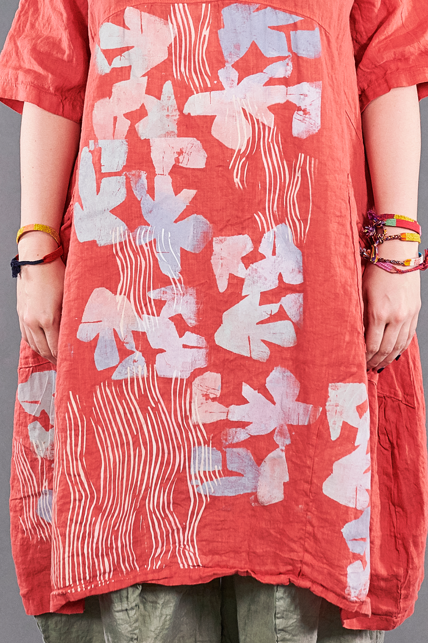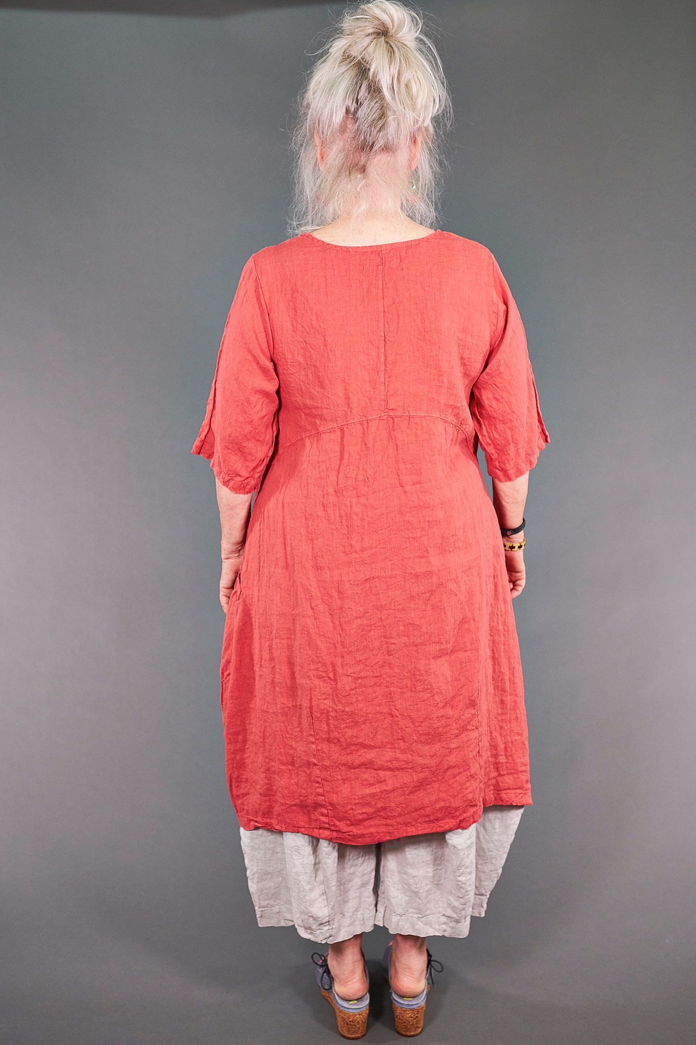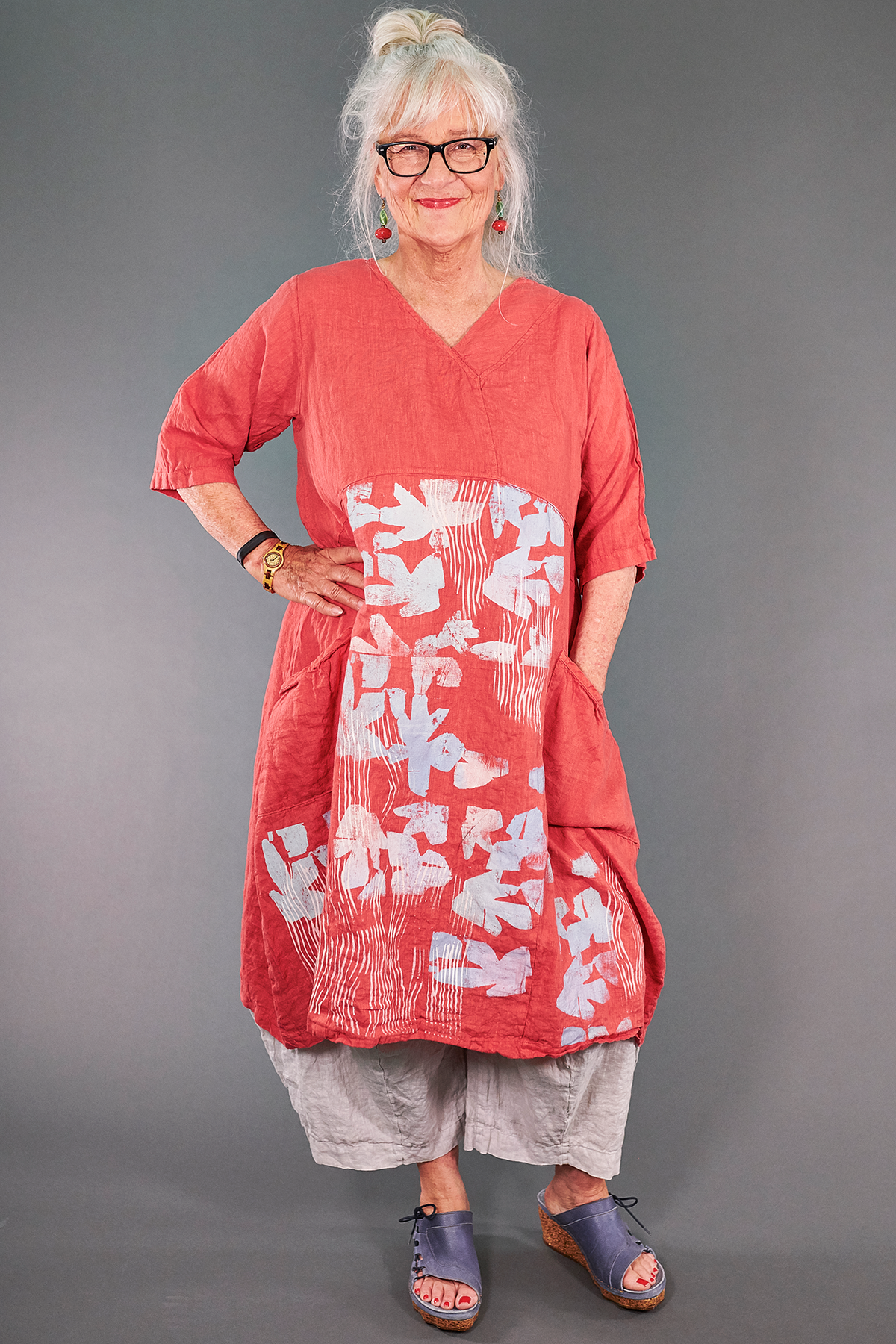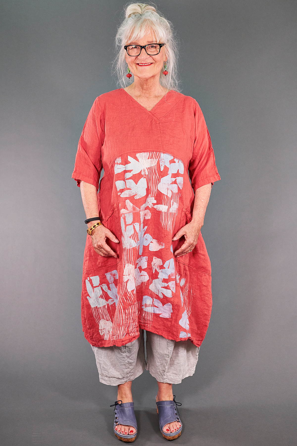 This linen tunic is so versatile, you'll find yourself wearing it everywhere! This longer style Includes two pockets & an asymmetrical detail at the neckline (zoom to see). It can easily be worn as a tunic or a dress. We printed this on the front with fresh art from our studio.