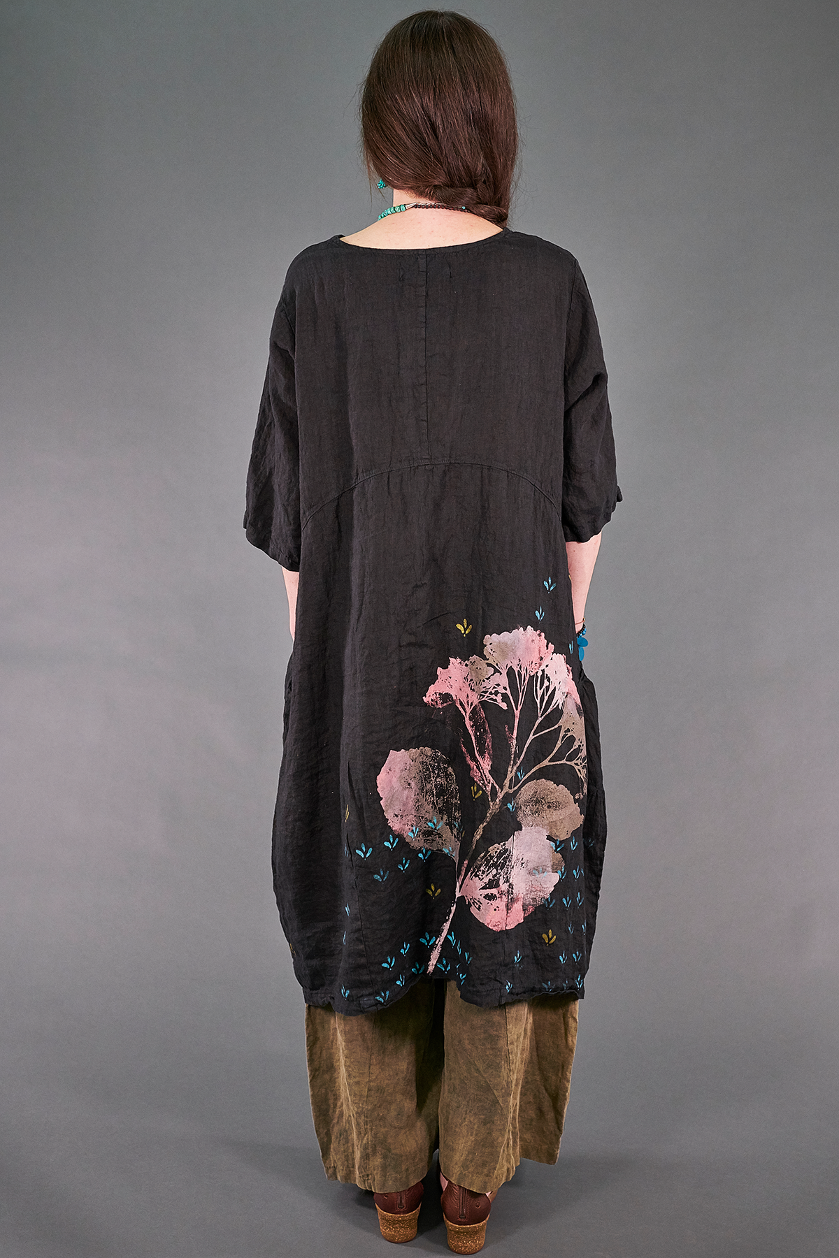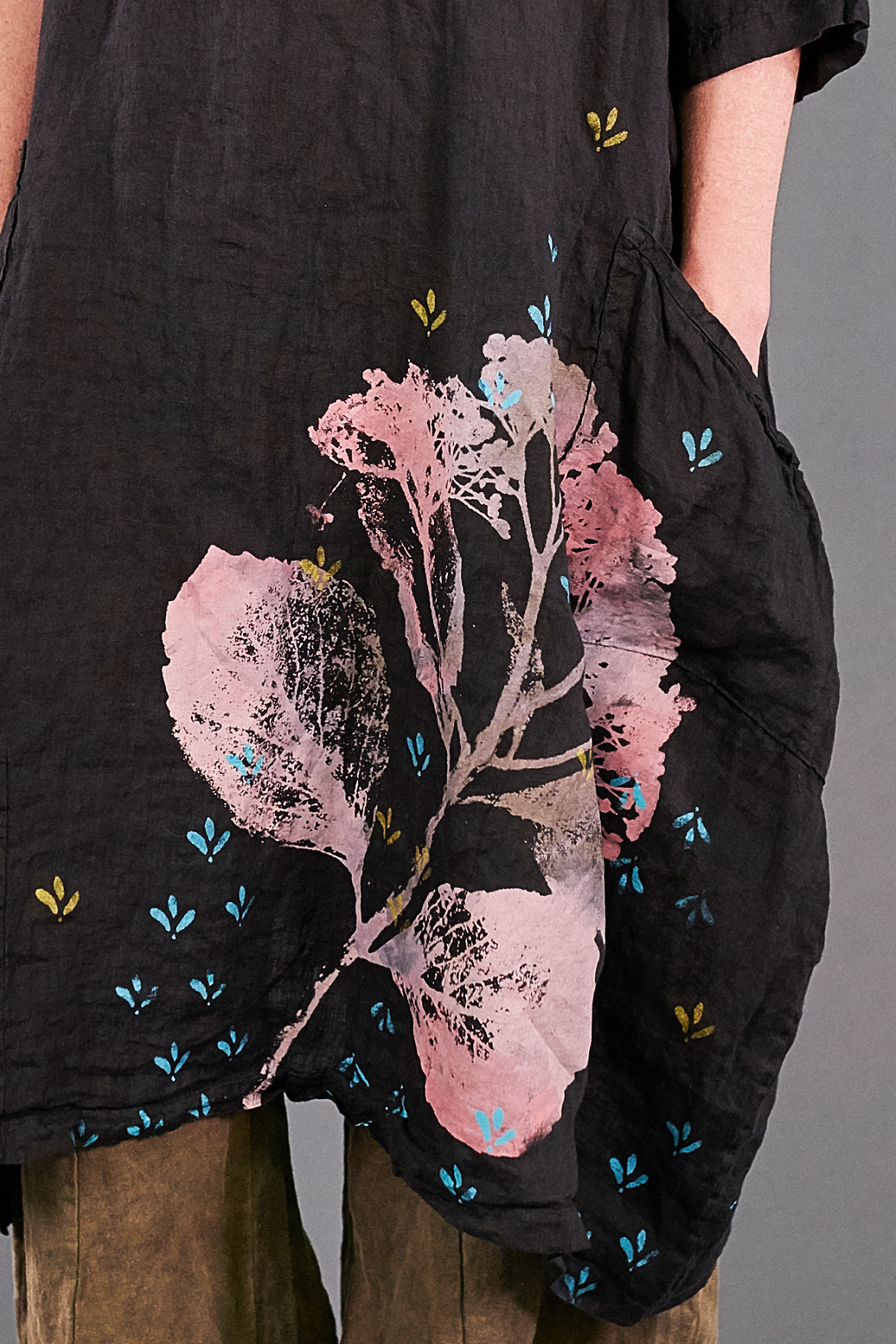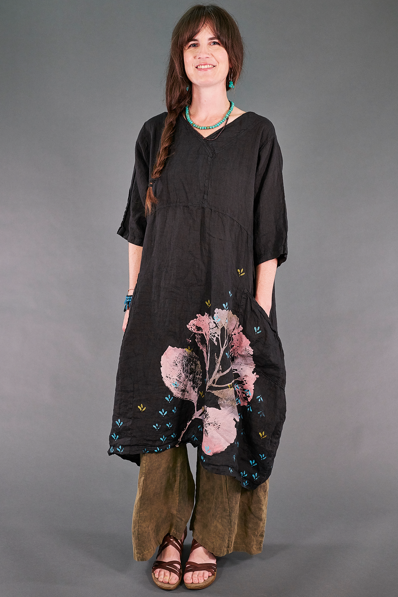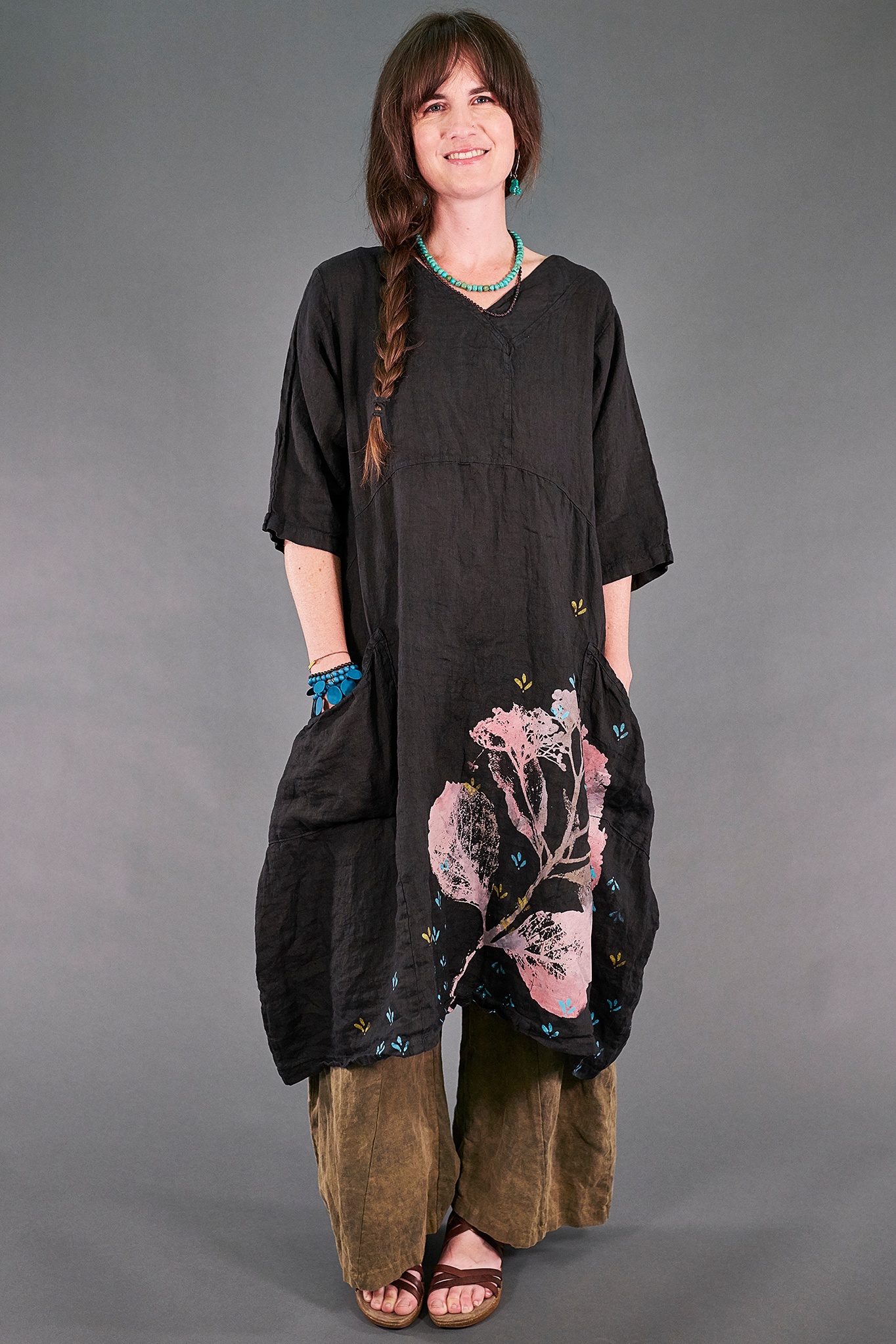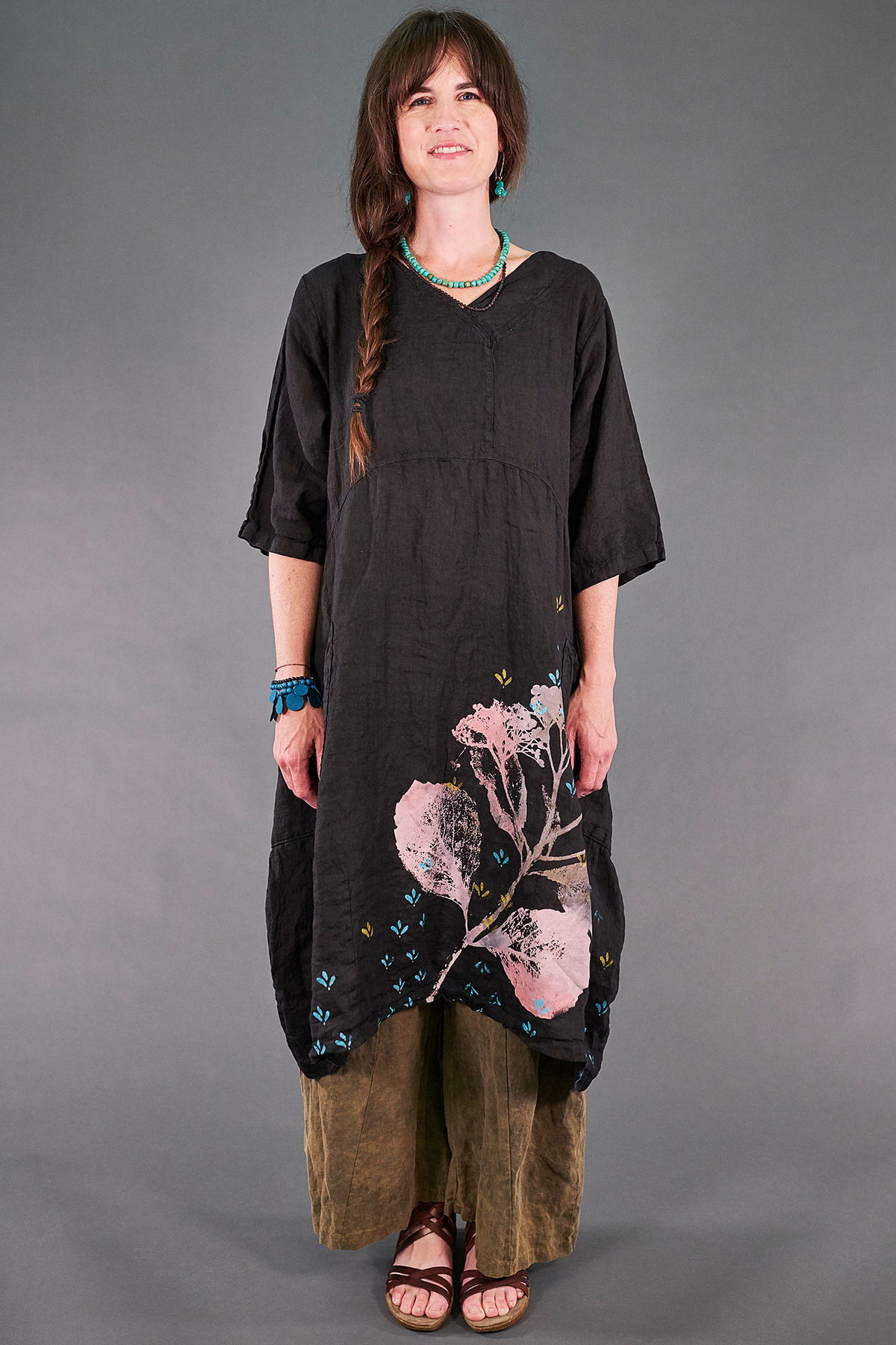 This linen tunic is so versatile--you'll find yourself wearing it everywhere. This longer style Includes two pockets & an asymmetrical detail at the neckline (zoom to see). It can easily be worn as a tunic or a dress. We printed this on the front AND back with fresh art from our studio.