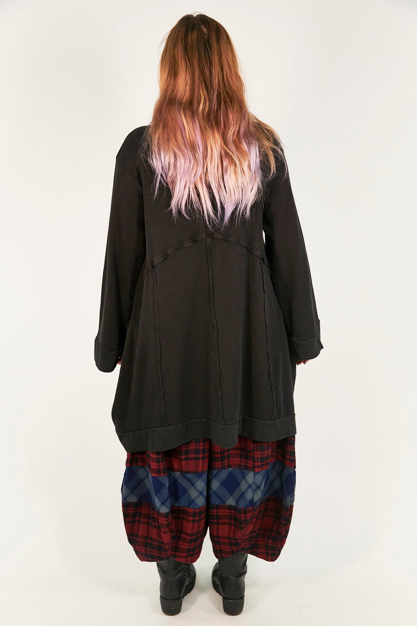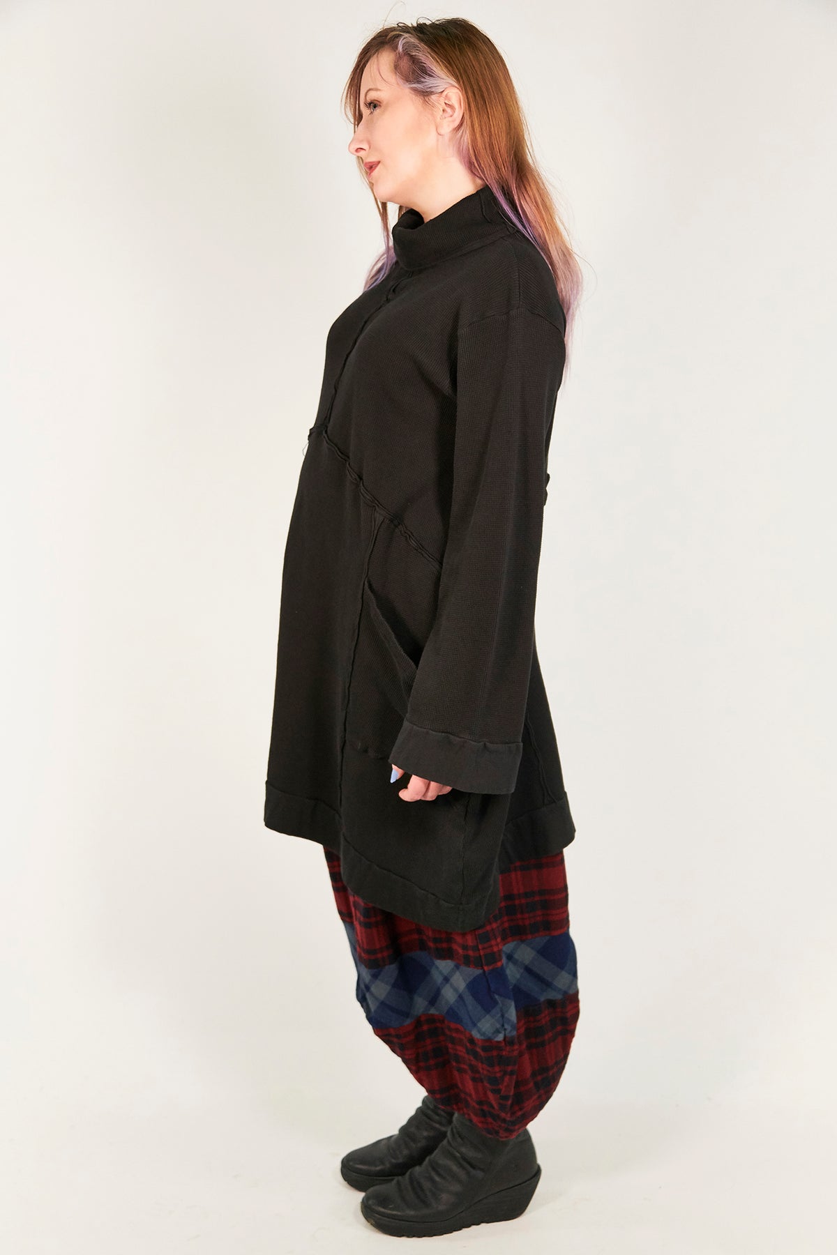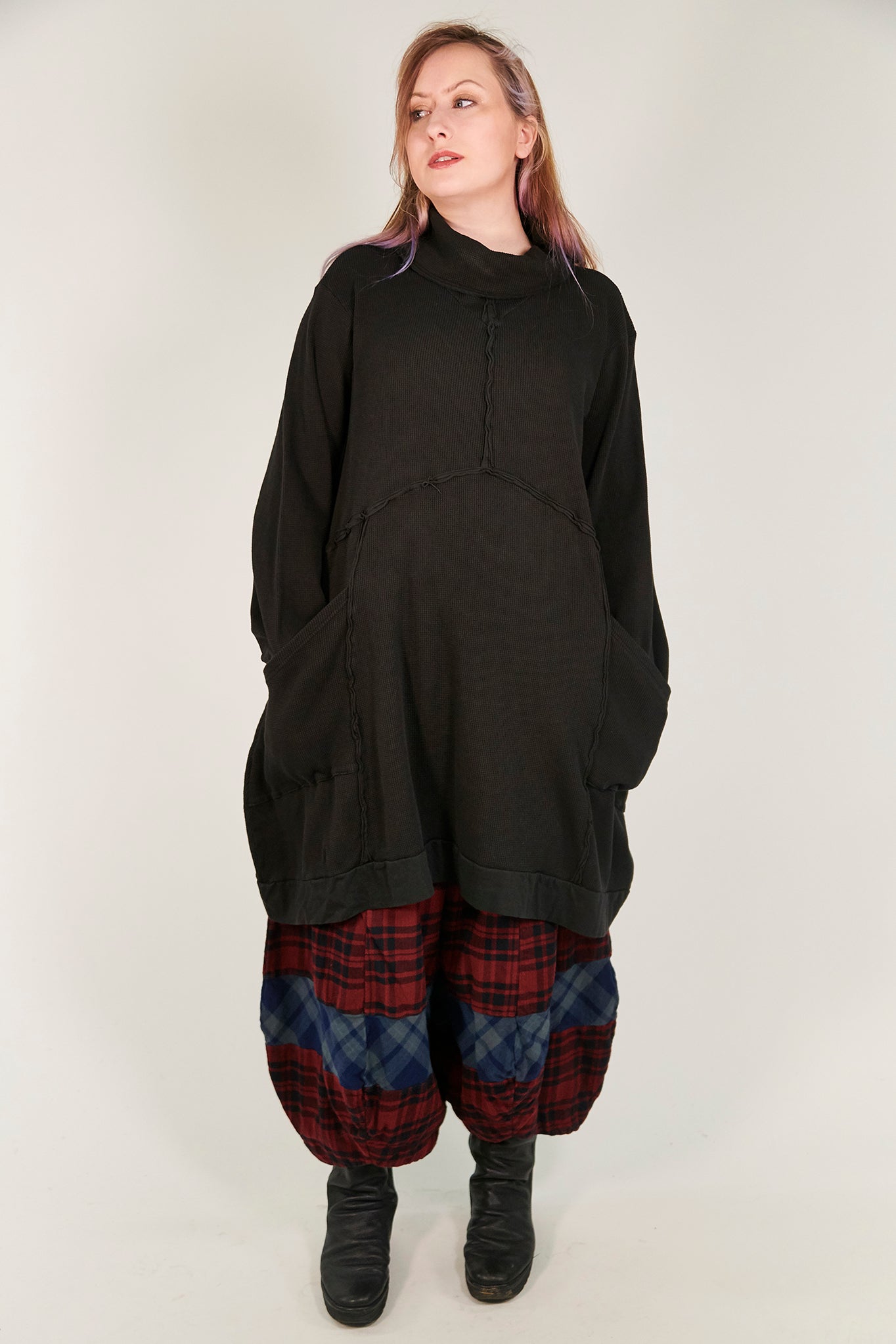 Our best and most fun to wear piece for the heart of winter; one that you reach for time and time again.An oversized thermal tunic dress with inside out roll to raw seaming and deep pockets, an extra wide high neck and wide sleeves so that you can easily layer this over other pieces to keep warm & feel cozy. Our model is 5'6" tall.