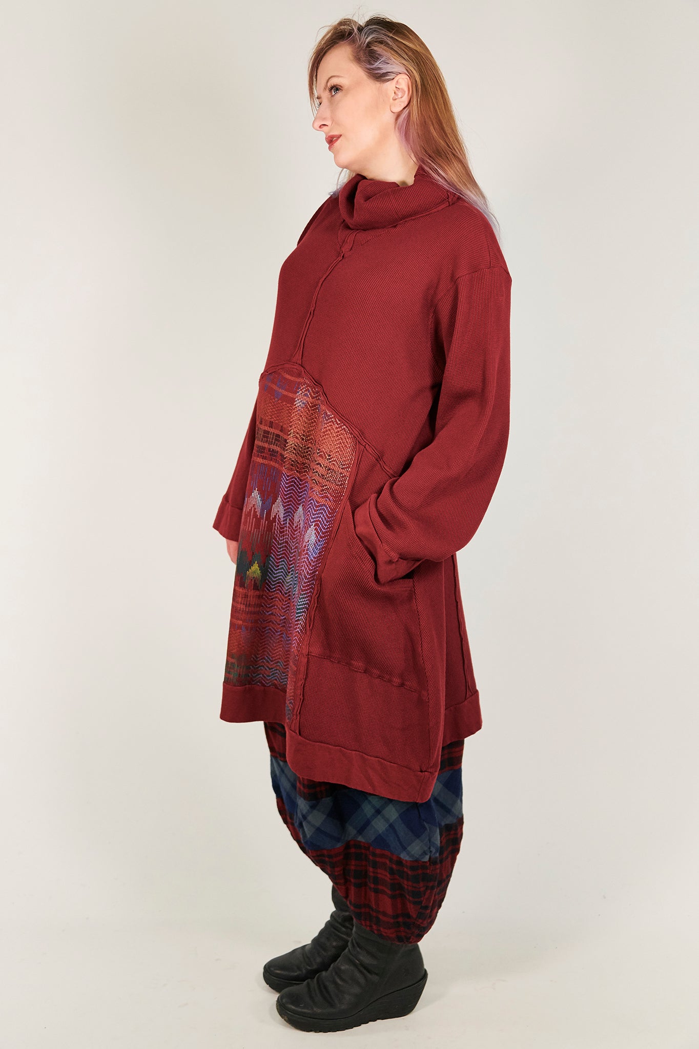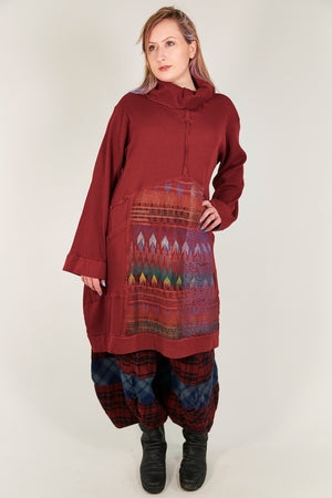 An oversized thermal tunic dress with inside out roll to raw seaming and deep pockets, an extra wide high neck and wide sleeves so that you can easily layer this over other pieces to keep warm & feel cozy.