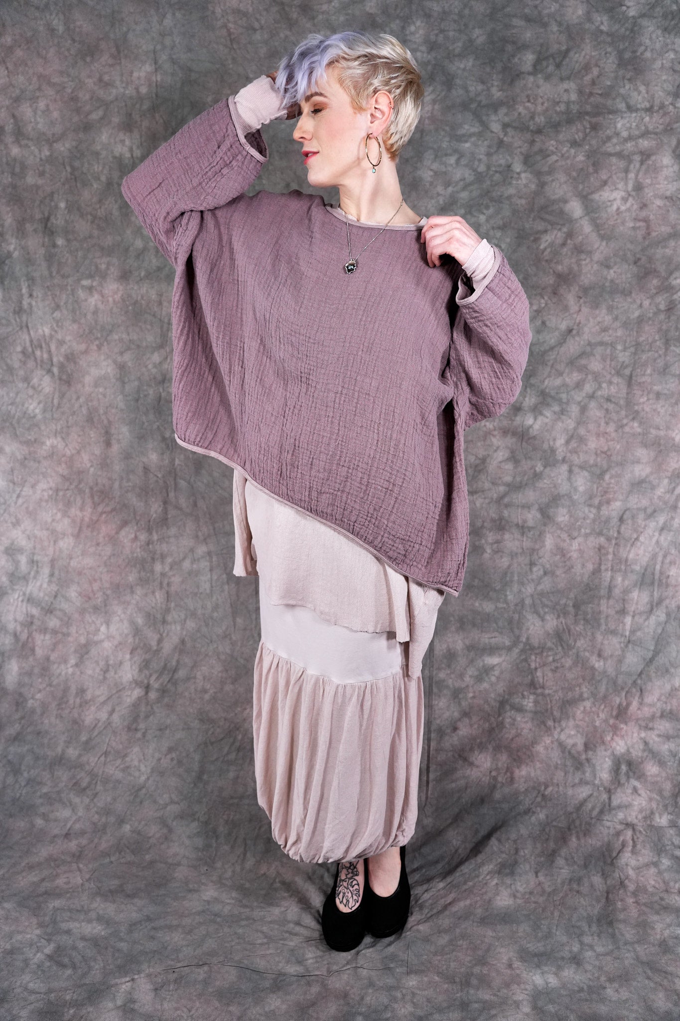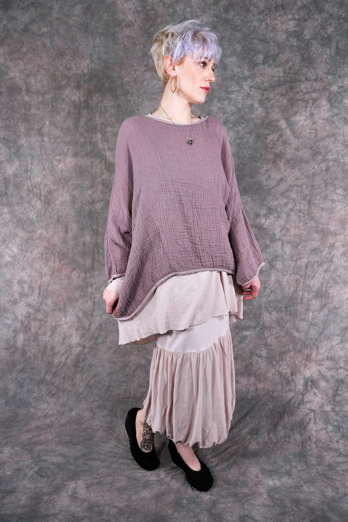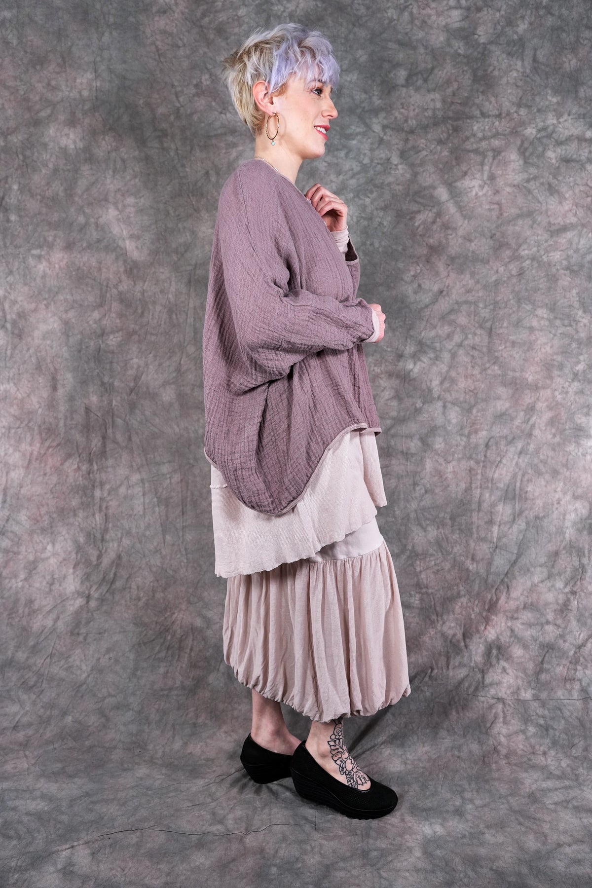 The Vintage Leaf Tee is made of 100% textured loose weave linen double gauze. It can be worn as an over piece all summer, very lightweight. Similar in shape to our mariposa but slightly cropped. Super cool worn over our #6229 Salted Shift in textured cotton, 6199 or #6199 Summer Frock as shown.