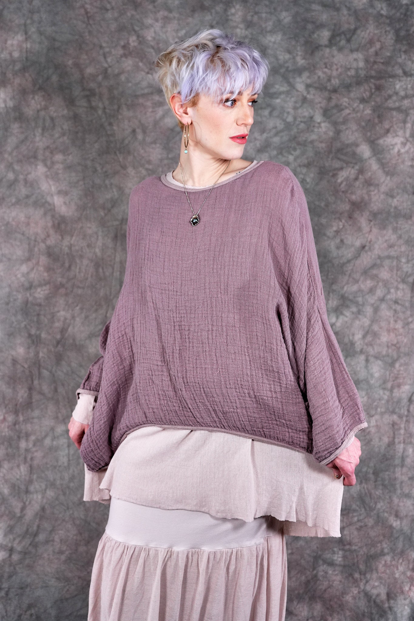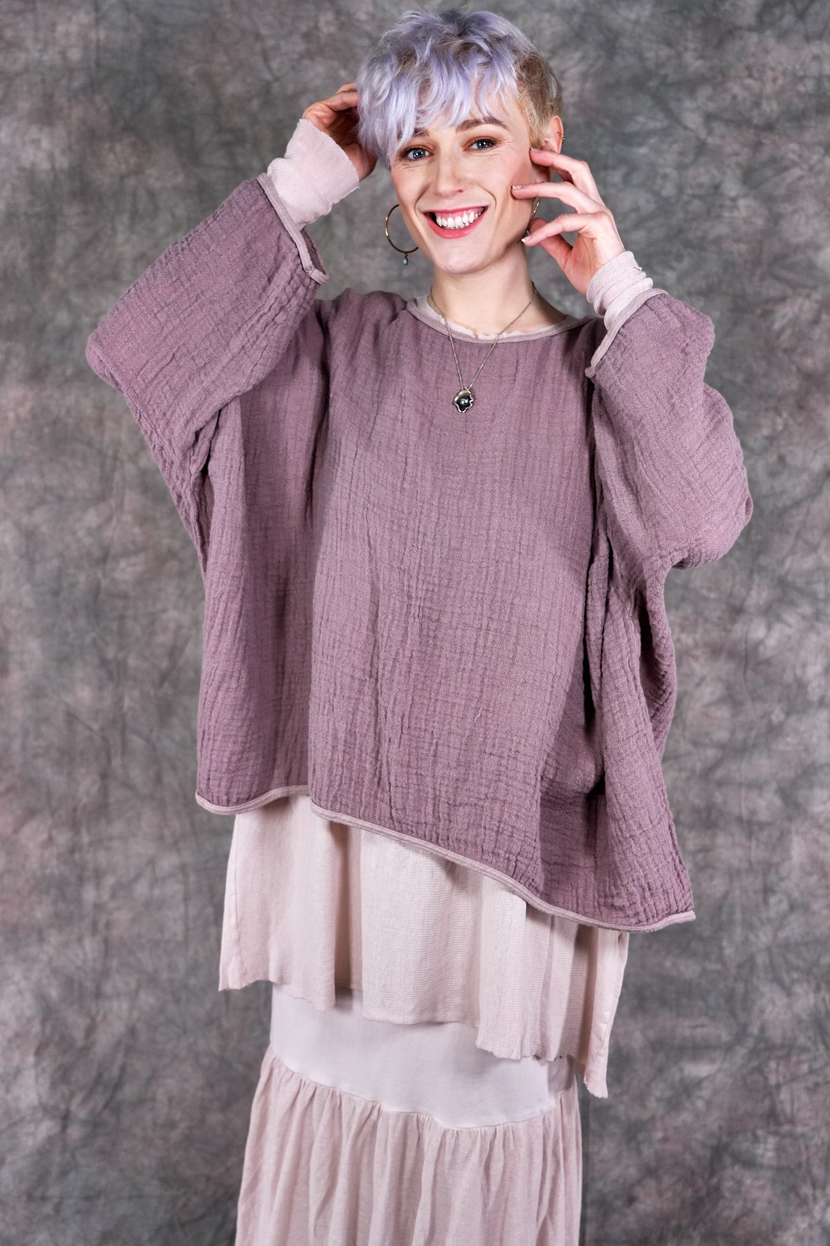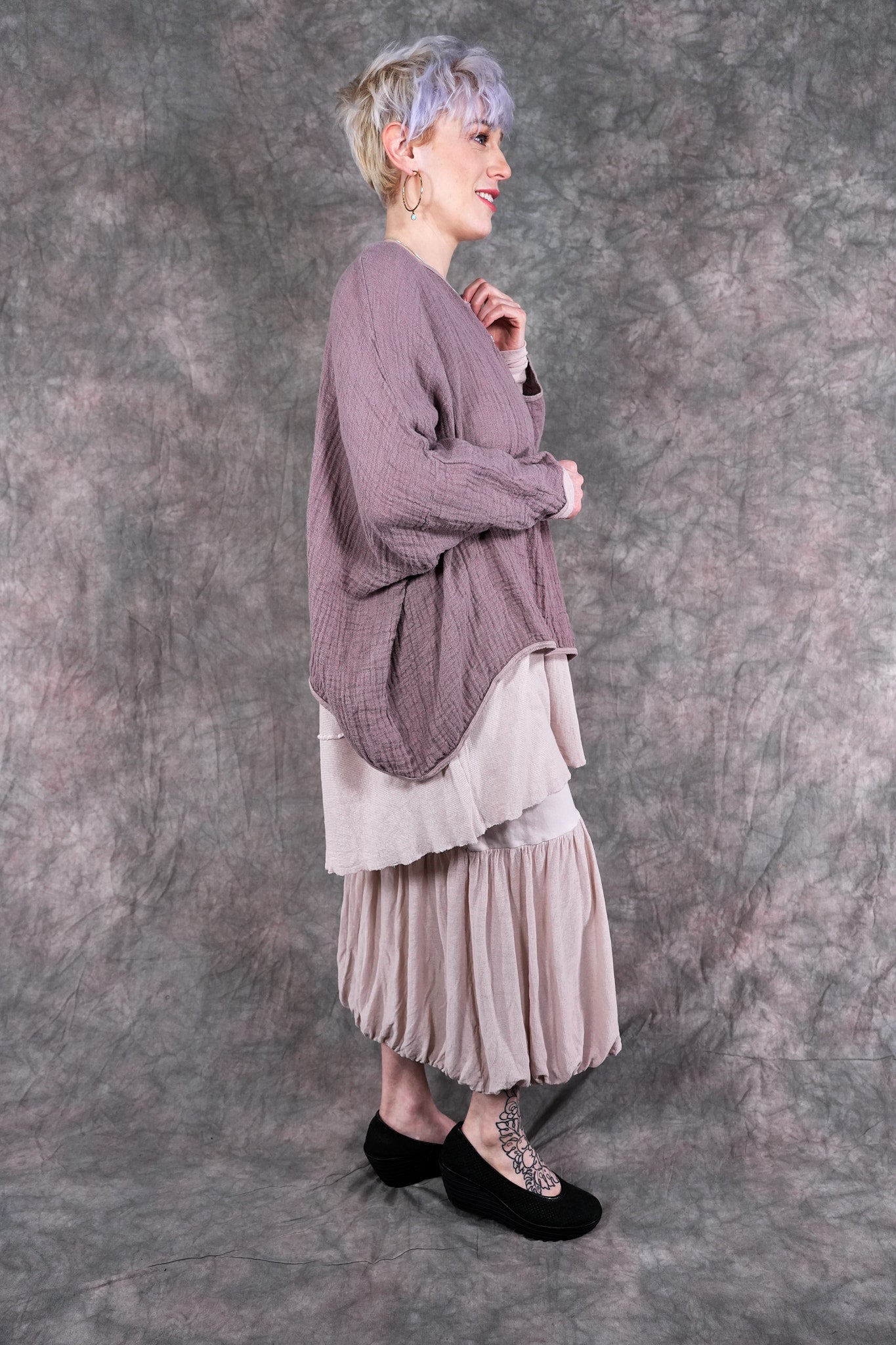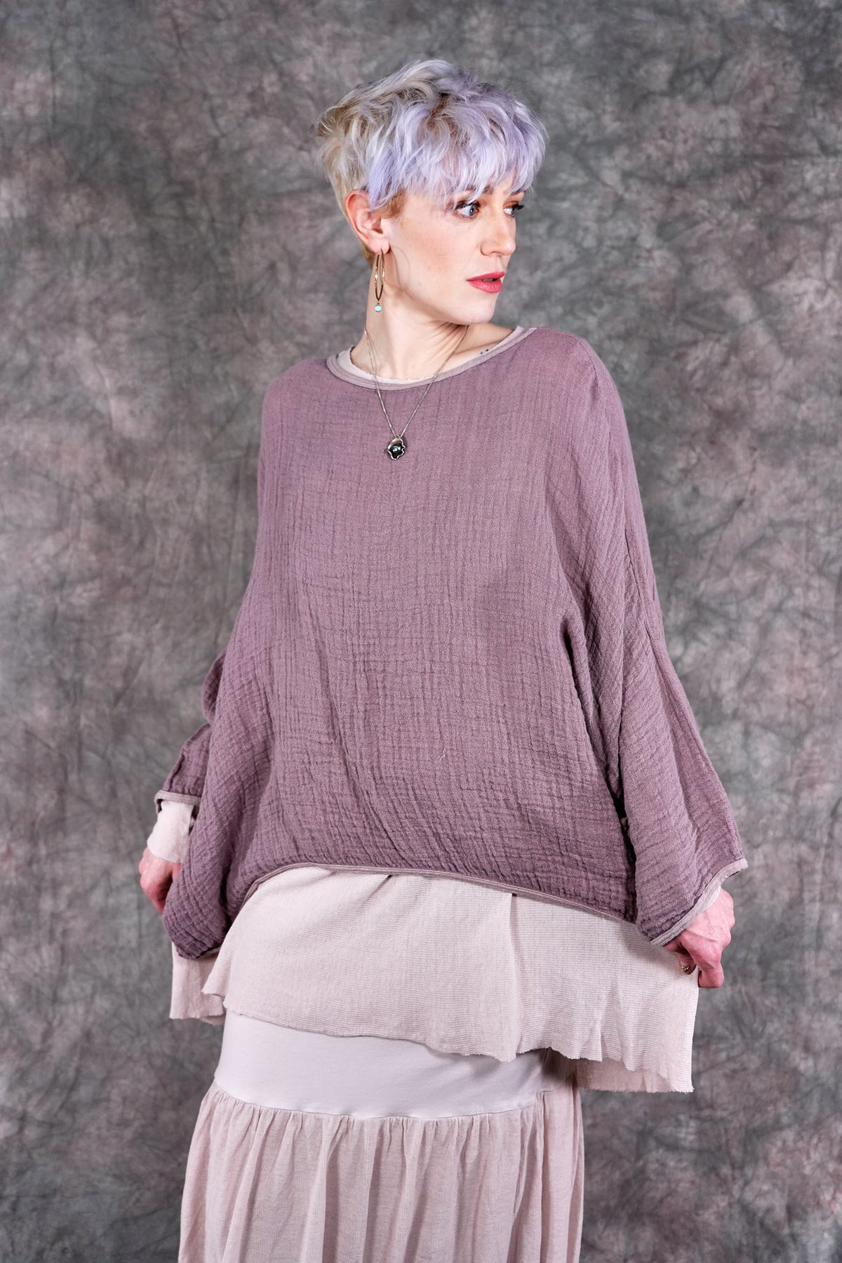 The Vintage Leaf Tee is made of 100% textured loose weave linen double gauze. It can be worn as an over piece all summer, very lightweight. Similar in shape to our mariposa but slightly cropped. Super cool worn over our #6229 Salted Shift in textured cotton, 6199 or #6199 Summer Frock as shown.