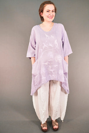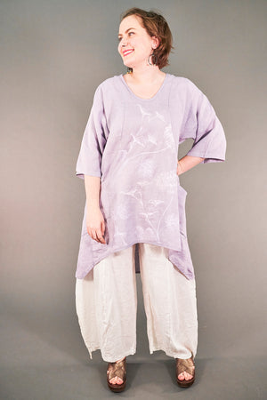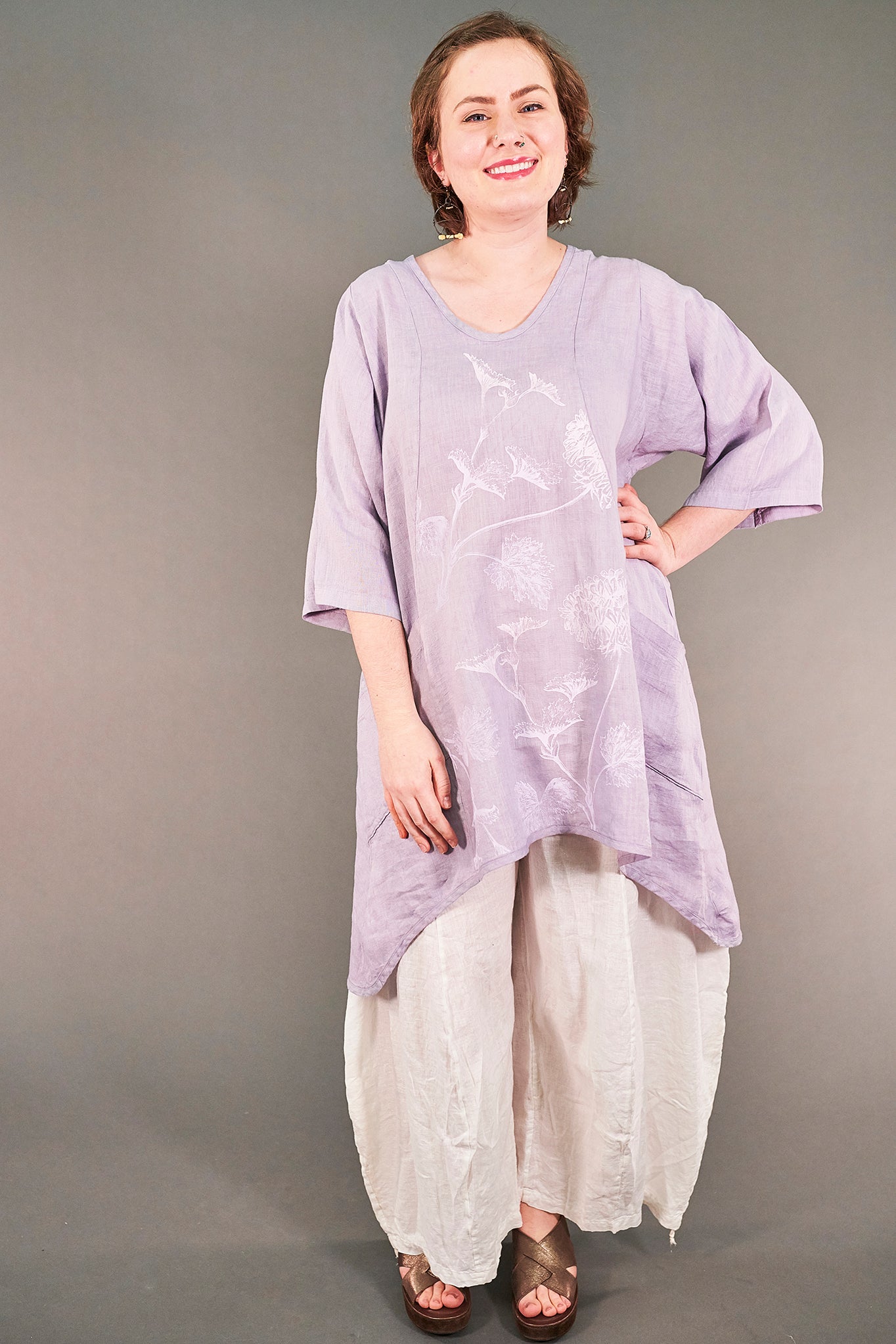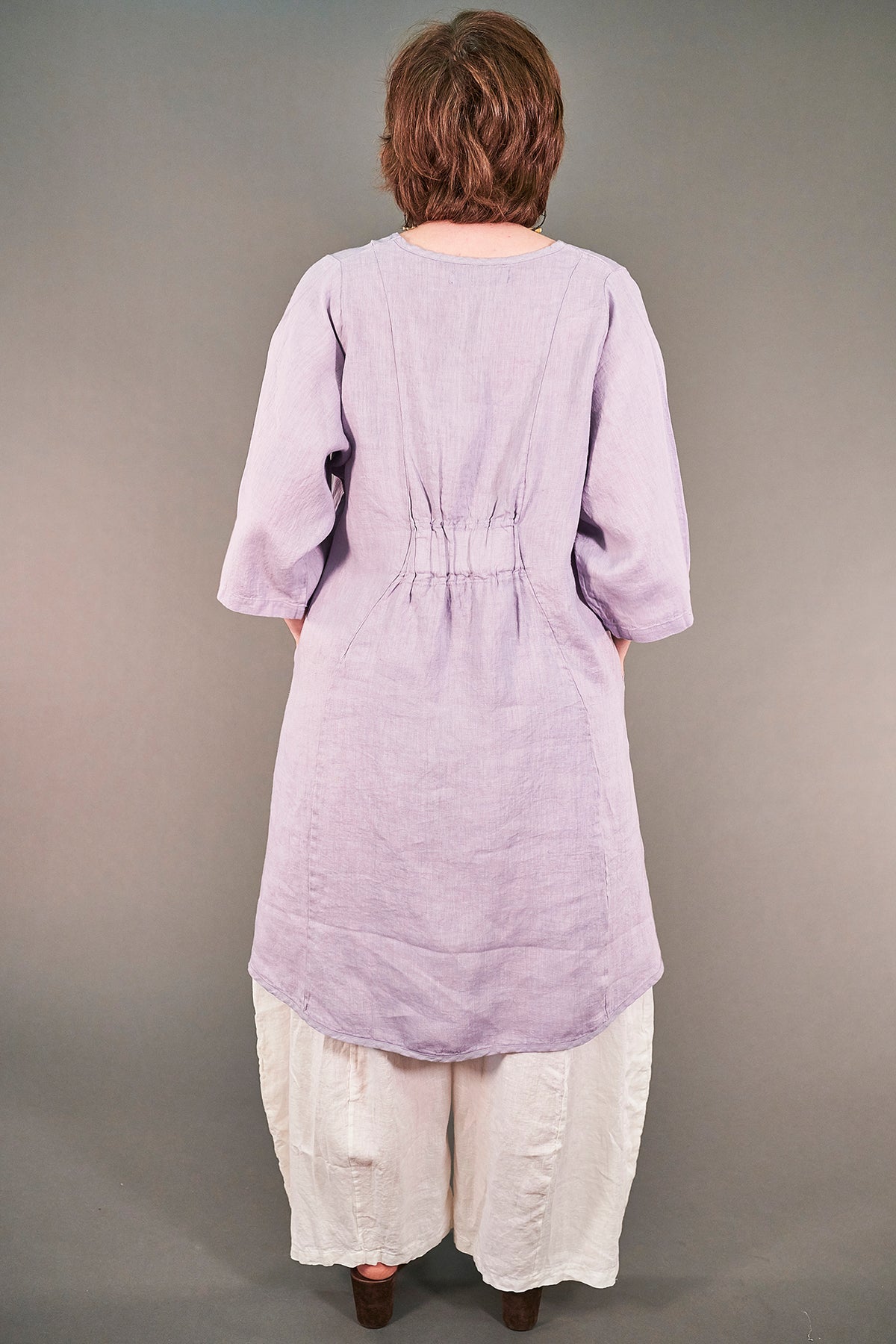 Lovely scooped neckline, roomy 3/4 sleeves, and beautifully curved seams make this such a flattering style on many body types. Hemline scoops up in the front & drapes gracefully longer in the back. A bit of elastic across the back pinches the waist ever so slightly to create a bit of definition. Two pockets add style & practicality.