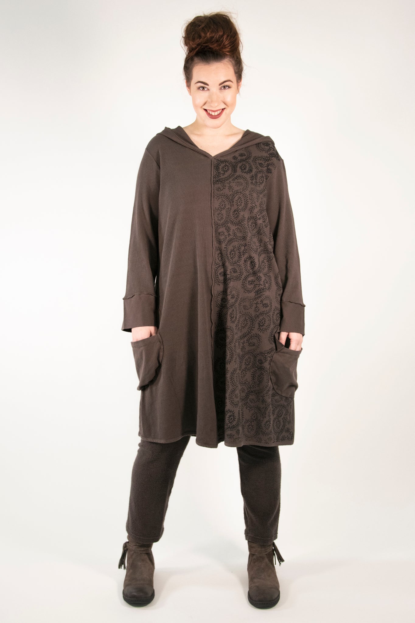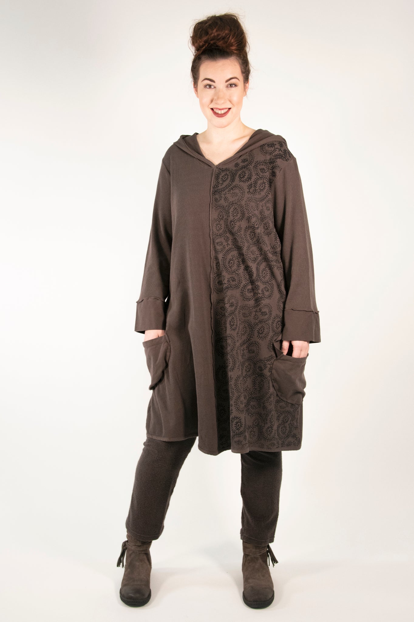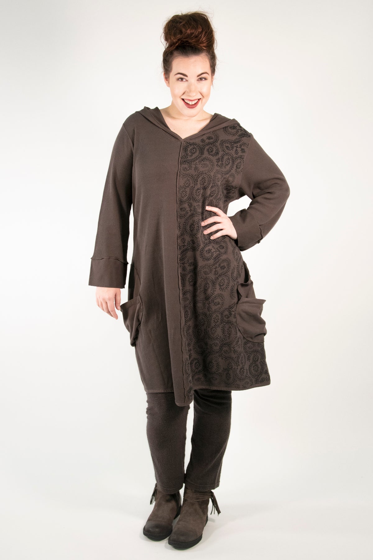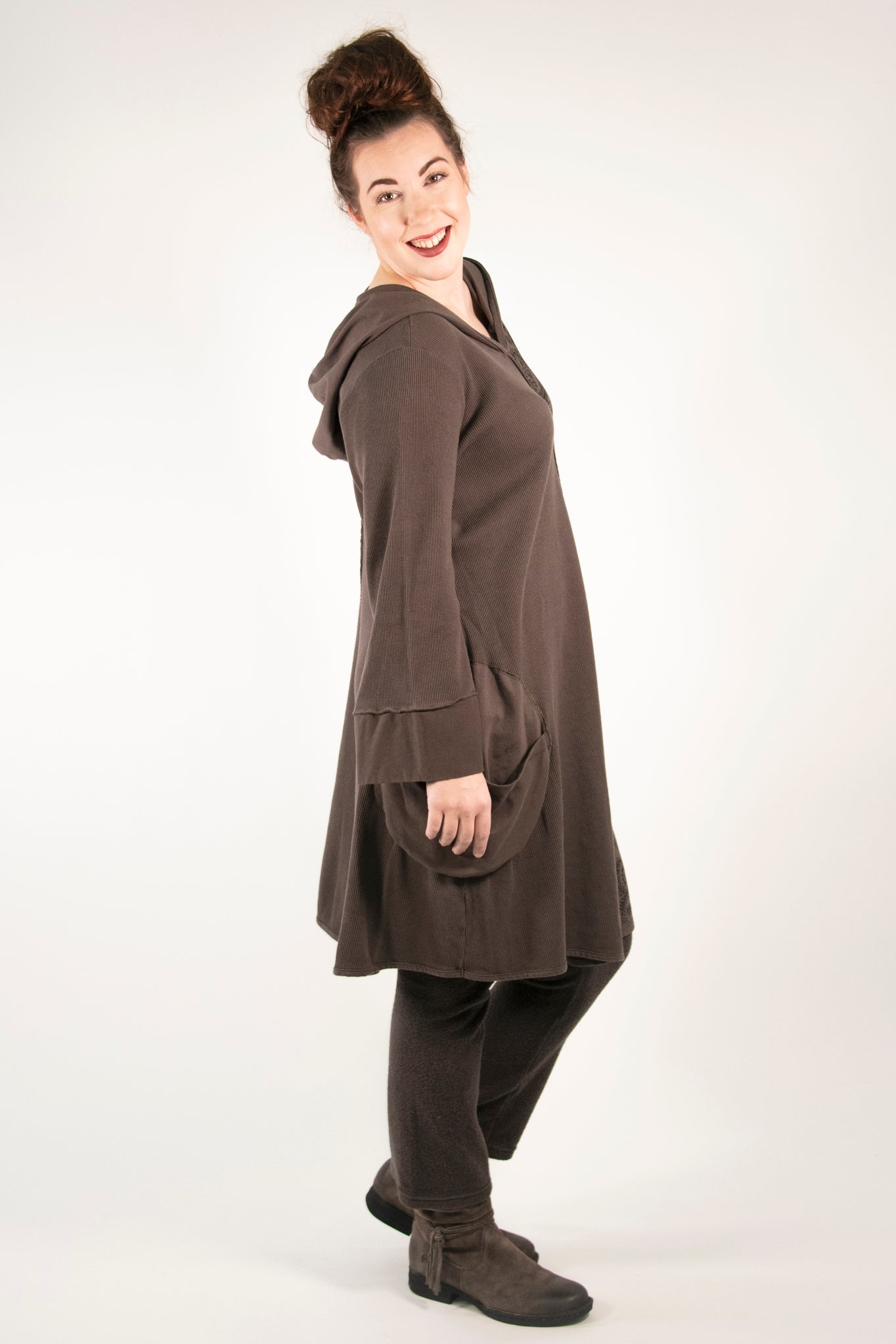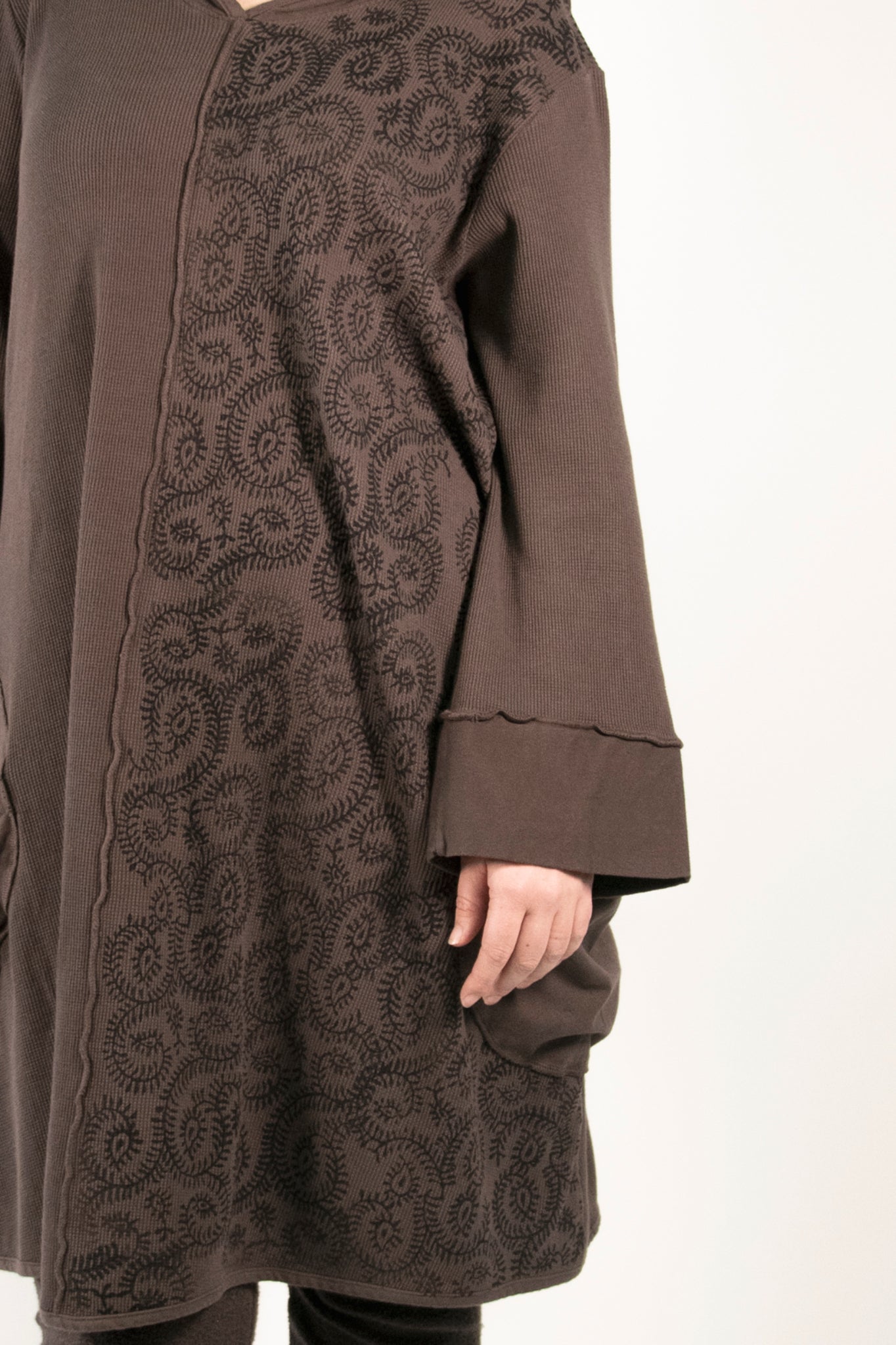 This cozy style is a new favorite! This thermal hoodie tunic is a perfect style to throw on over anything--wear with pants or leggings for an easy winter outfit. Organic cotton thermal fabric is substantial enough to keep you warm while being thin enough to wear underneath thicker winter layers. We've graced the front with elegantly simple hand-printed artwork from our studio. Big, circular pockets add function & flair, & the hood on the top is perfect for cold weather.