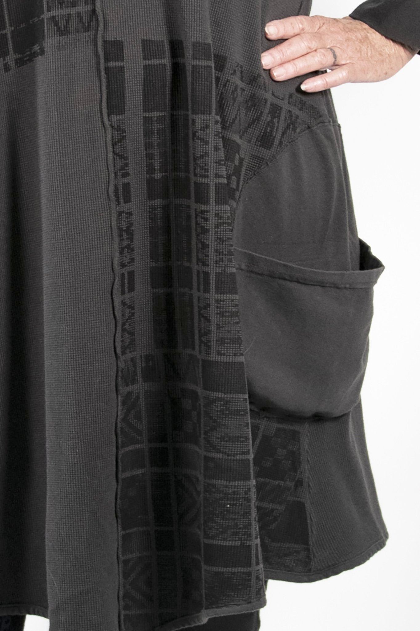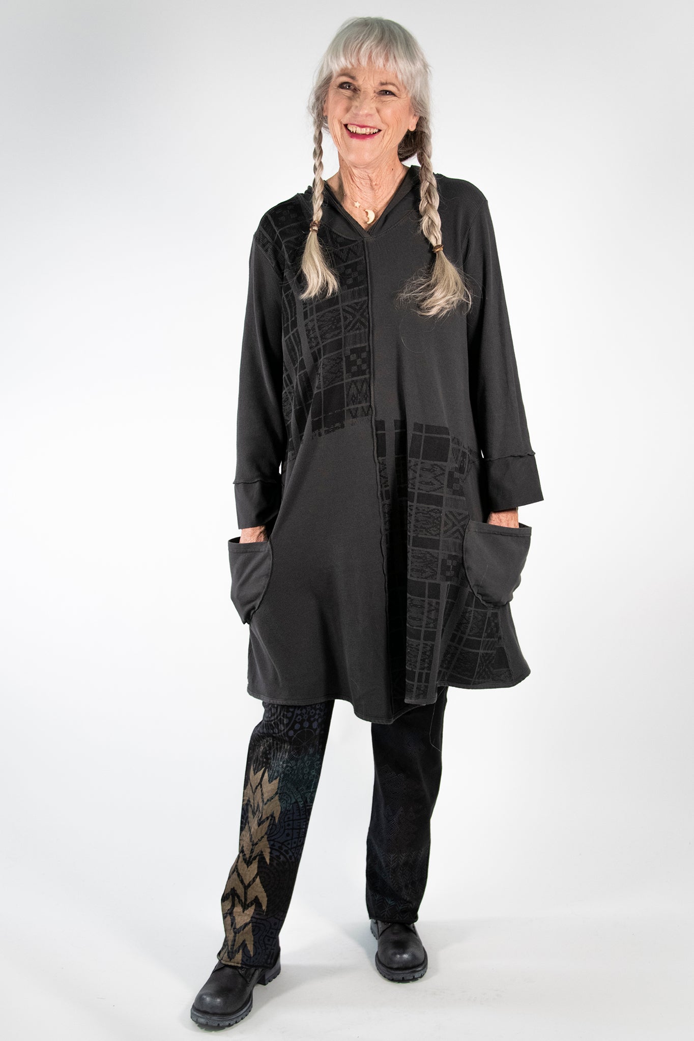 This cozy style is a new favorite! This thermal hoodie tunic is a perfect style to throw on over anything--wear with pants or leggings for an easy winter outfit. Organic cotton thermal fabric is substantial enough to keep you warm while being thin enough to wear underneath thicker winter layers. We've graced the front with elegantly simple hand-printed artwork from our studio. Big, circular pockets add function & flair, & the hood on the top is perfect for cold weather.