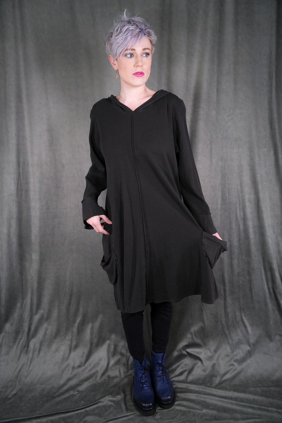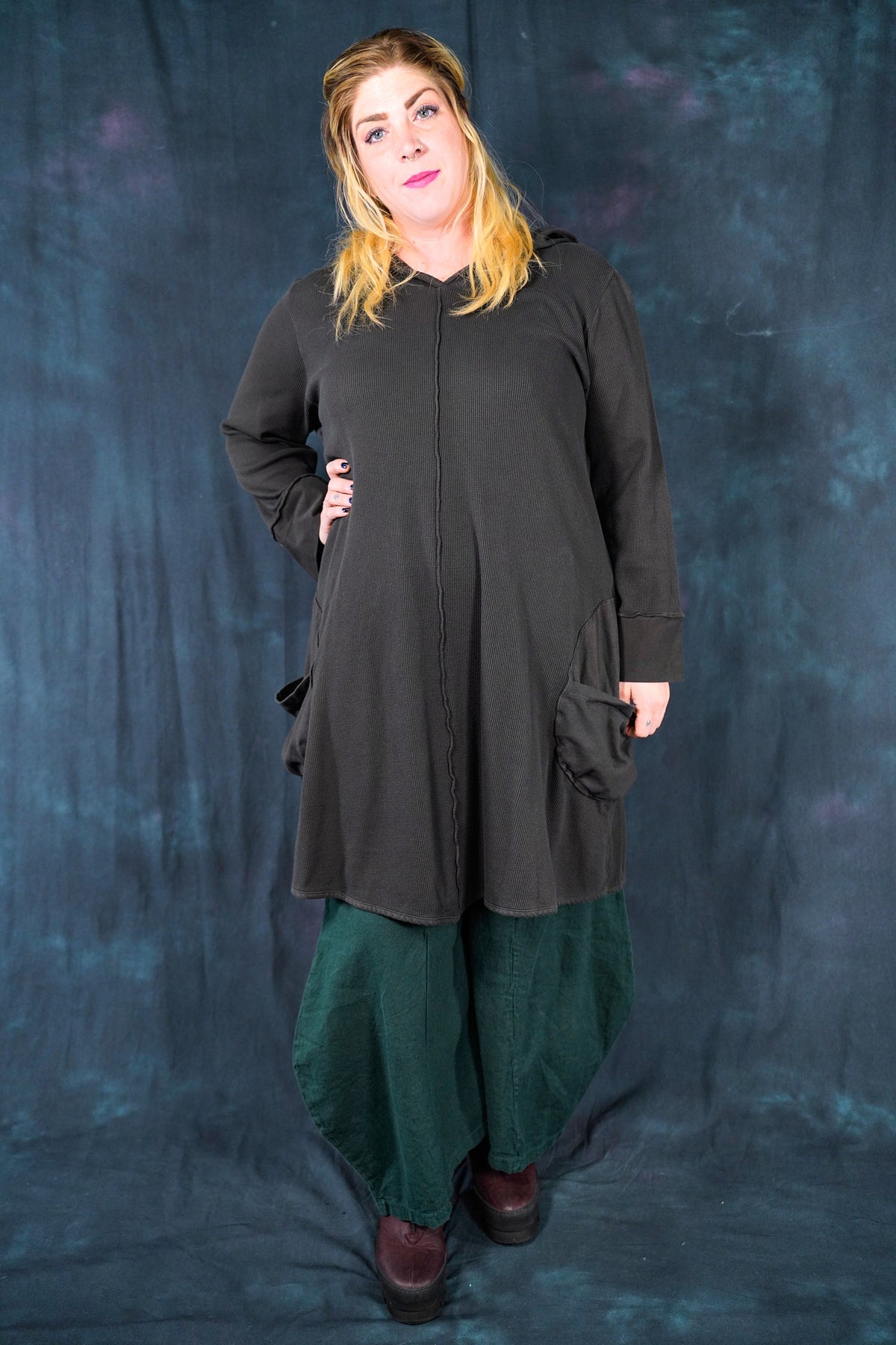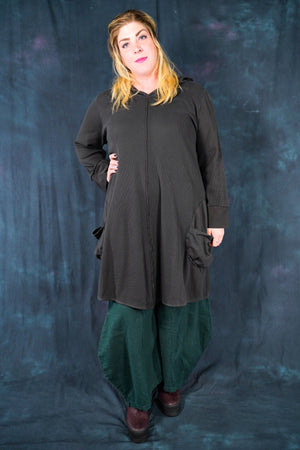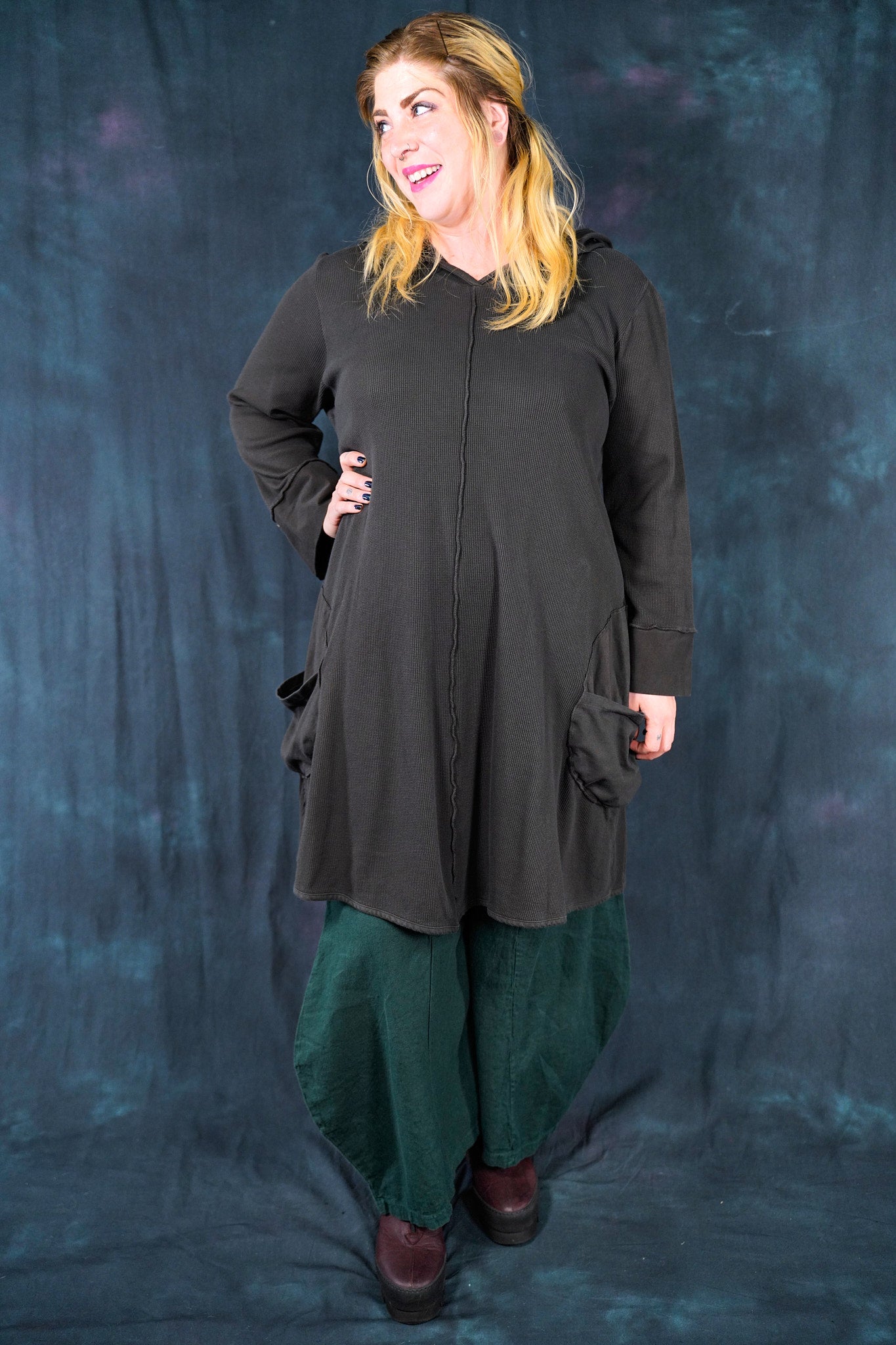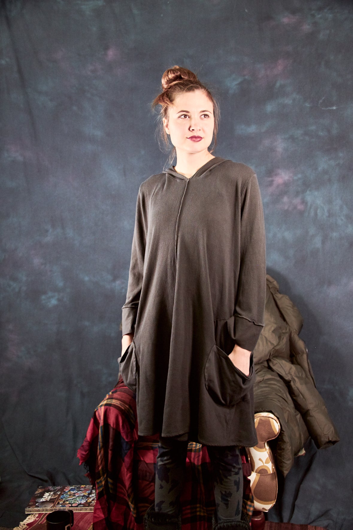 This organic cotton thermal tunic is a perfect style to throw on over anything--wear with pants or leggings for an easy & cozy at home outfit. It is substantial enough to keep you warm while being thin enough to wear underneath thicker winter layers. Big, circular pockets add function & flair, & the hood on the top is perfect for cold weather.