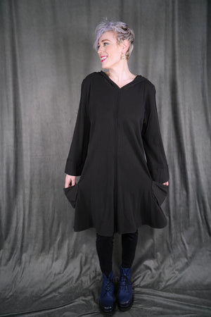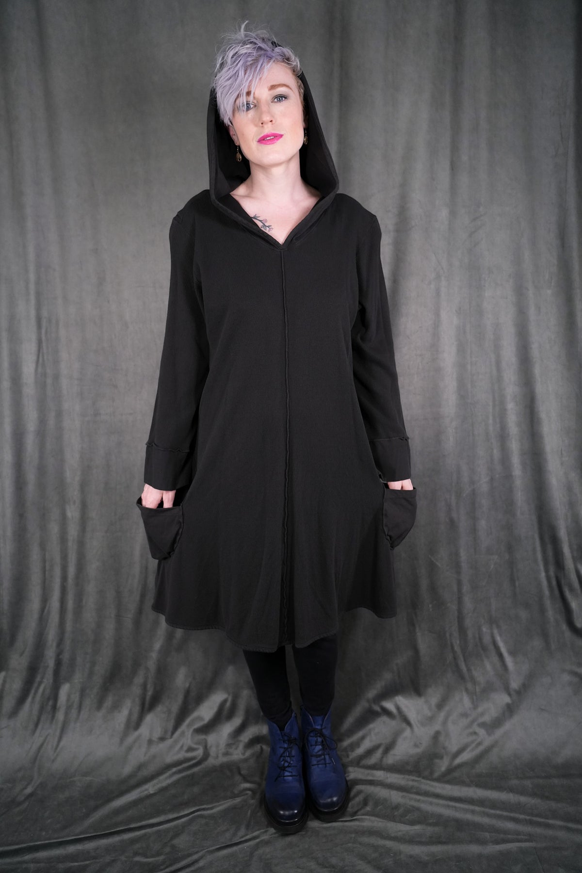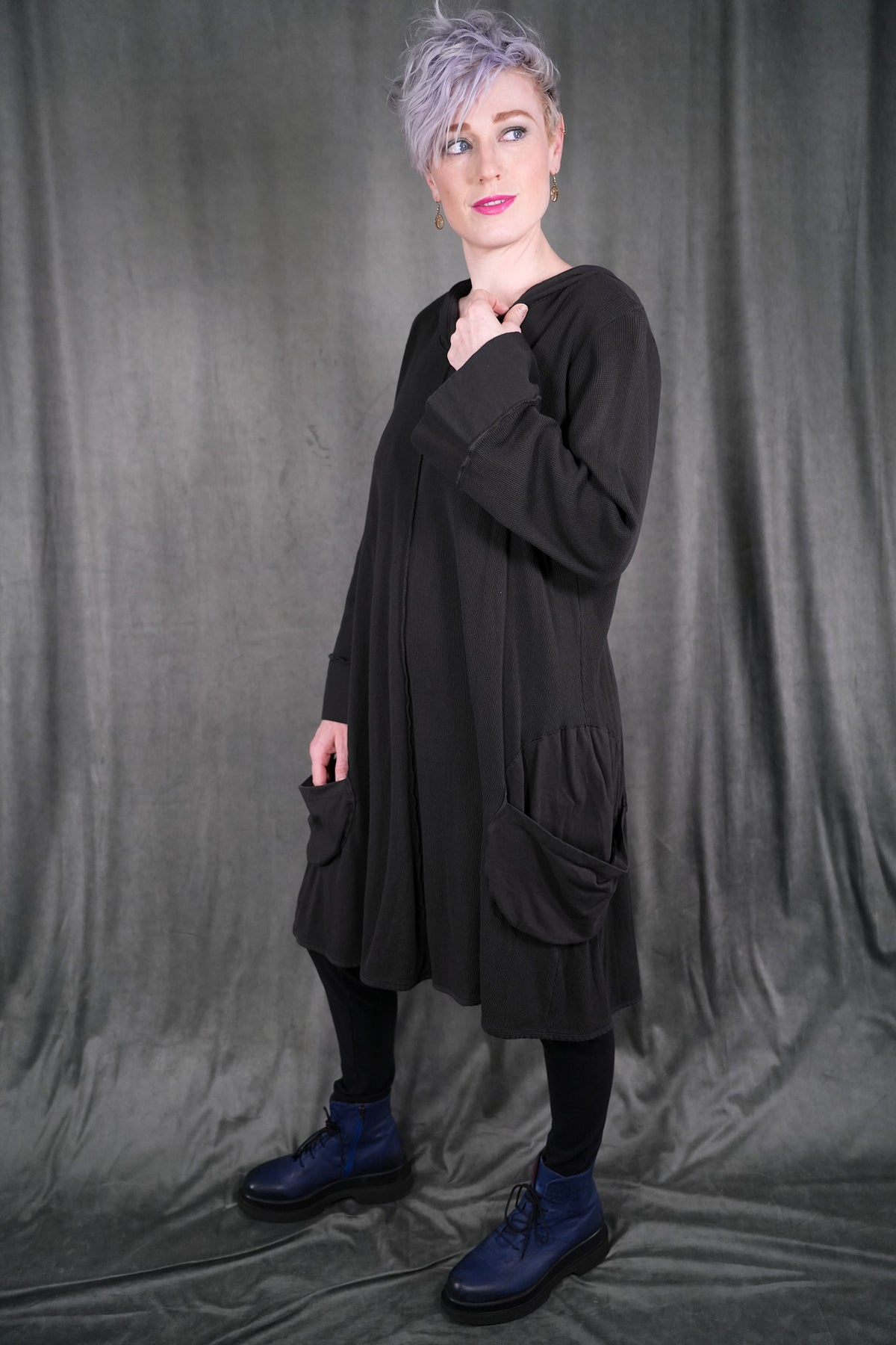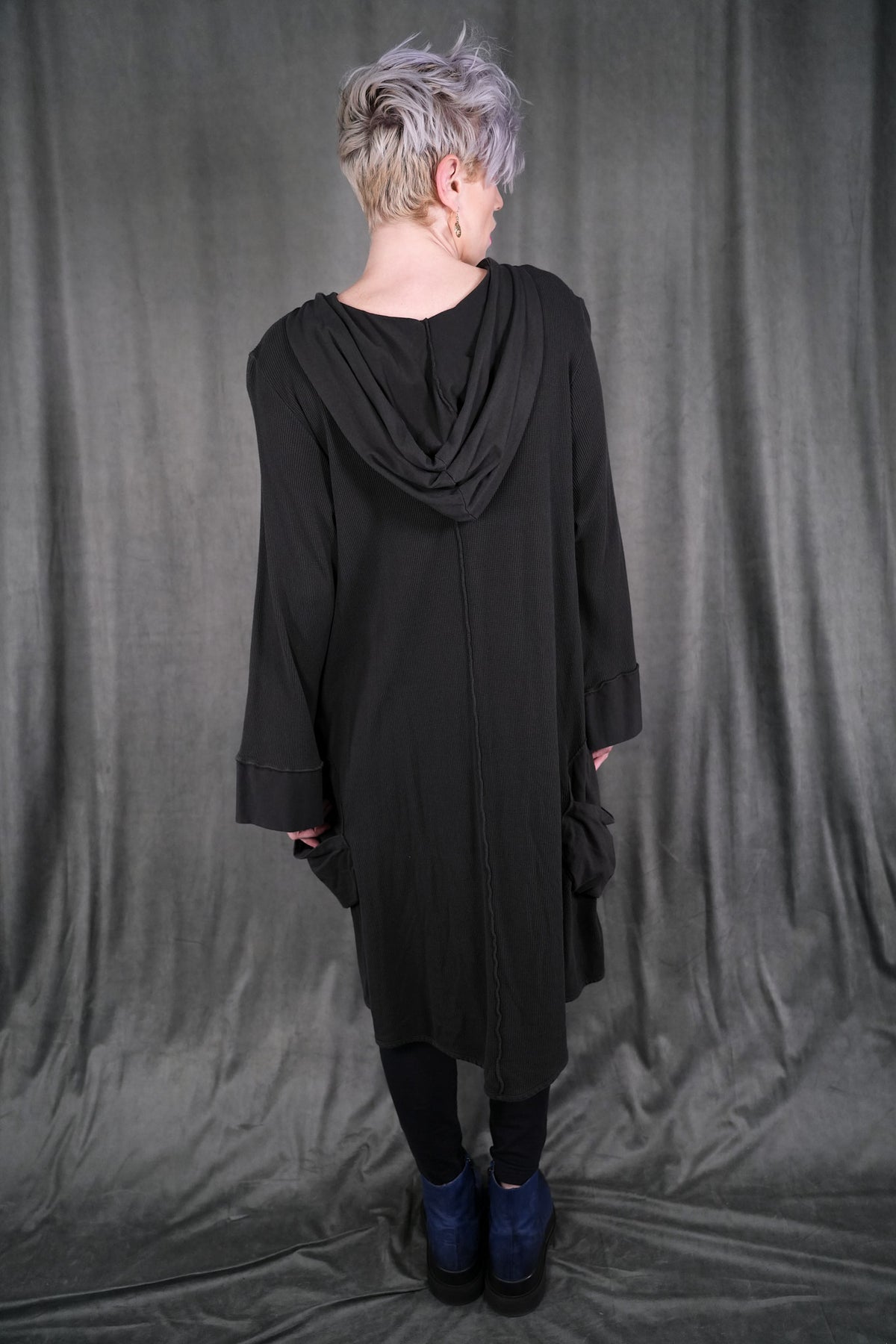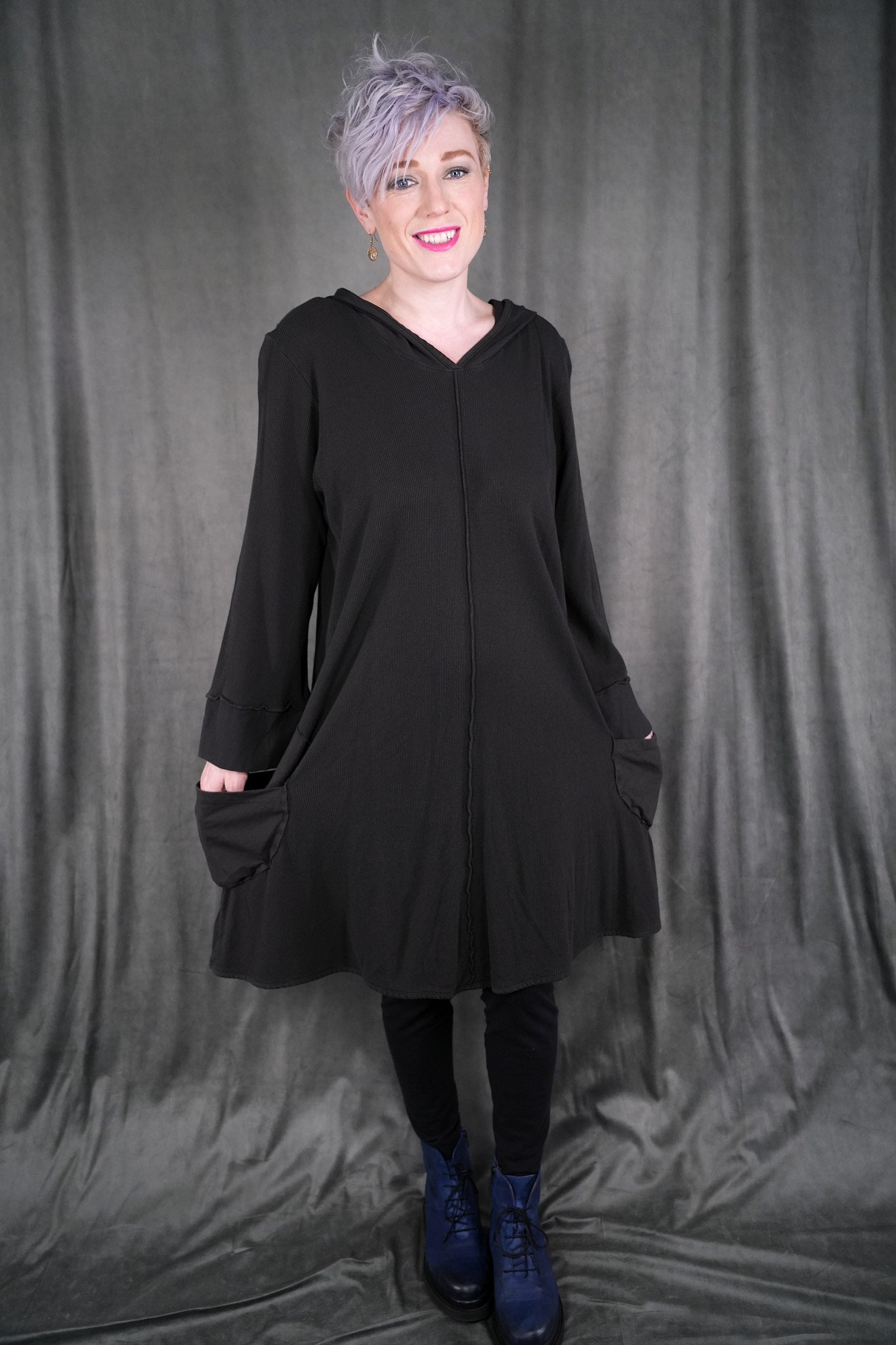 This organic cotton thermal tunic is a perfect style to throw on over anything--wear with pants or leggings for an easy & cozy at home outfit. It is substantial enough to keep you warm while being thin enough to wear underneath thicker winter layers. Big, circular pockets add function & flair, & the hood on the top is perfect for cold weather.