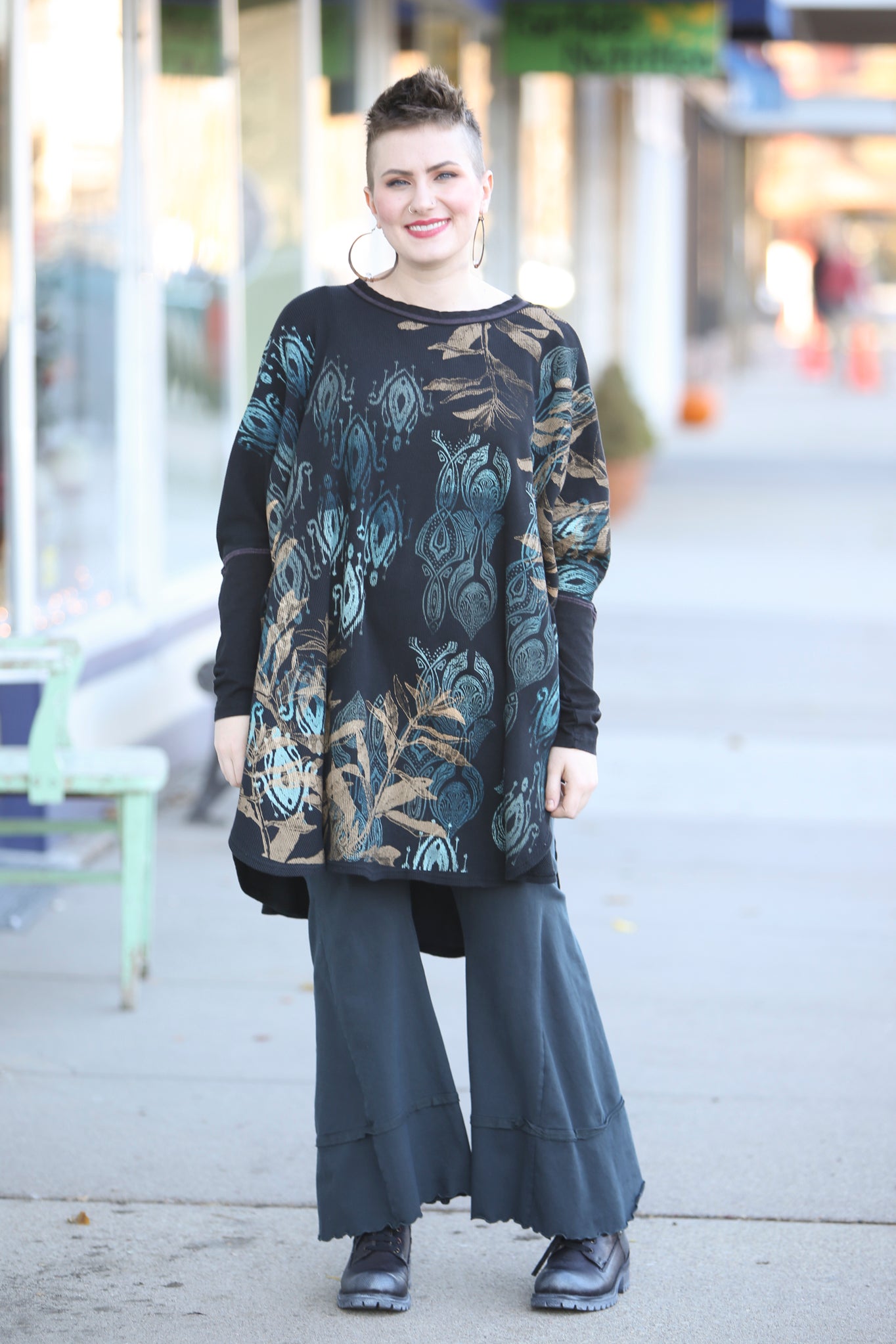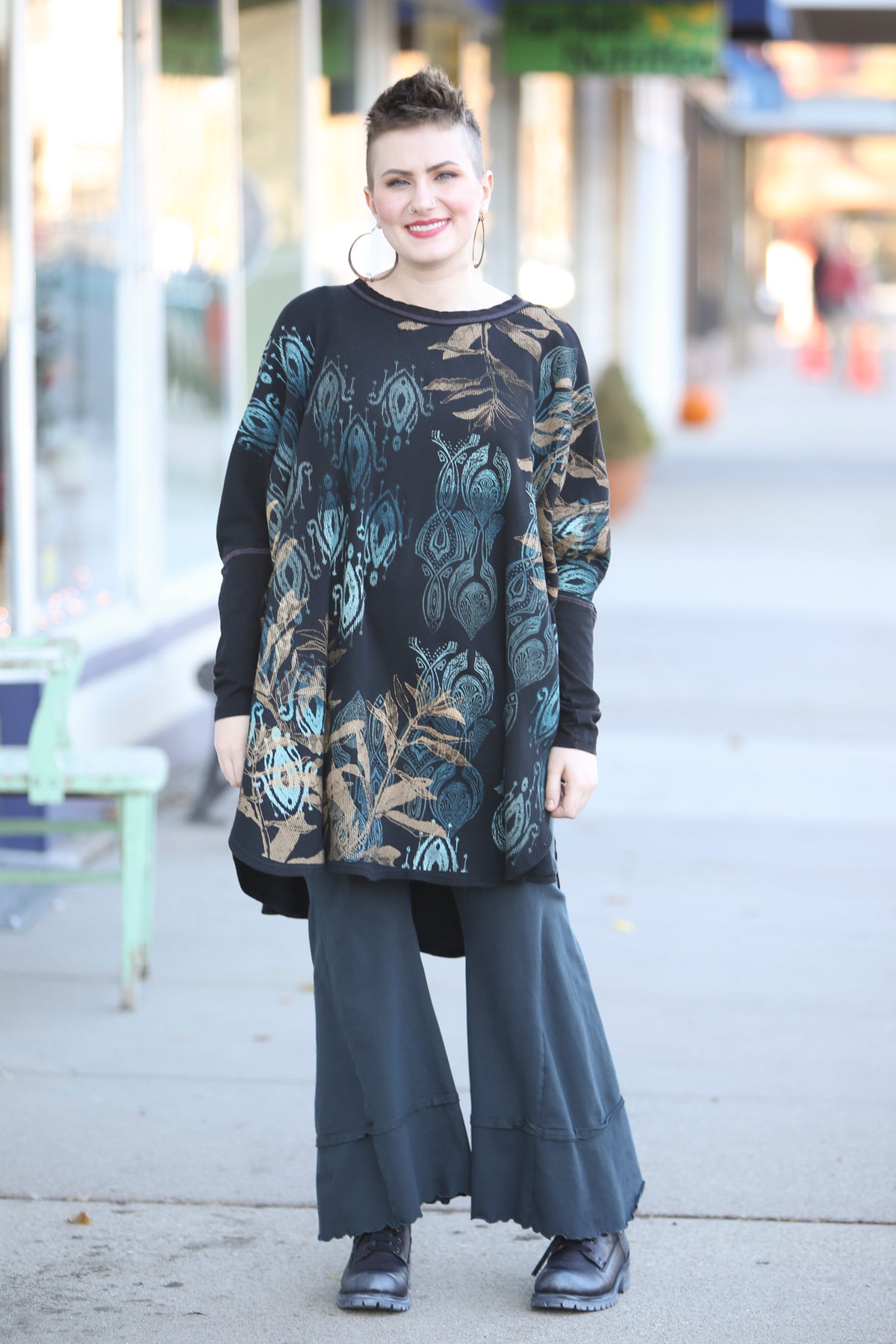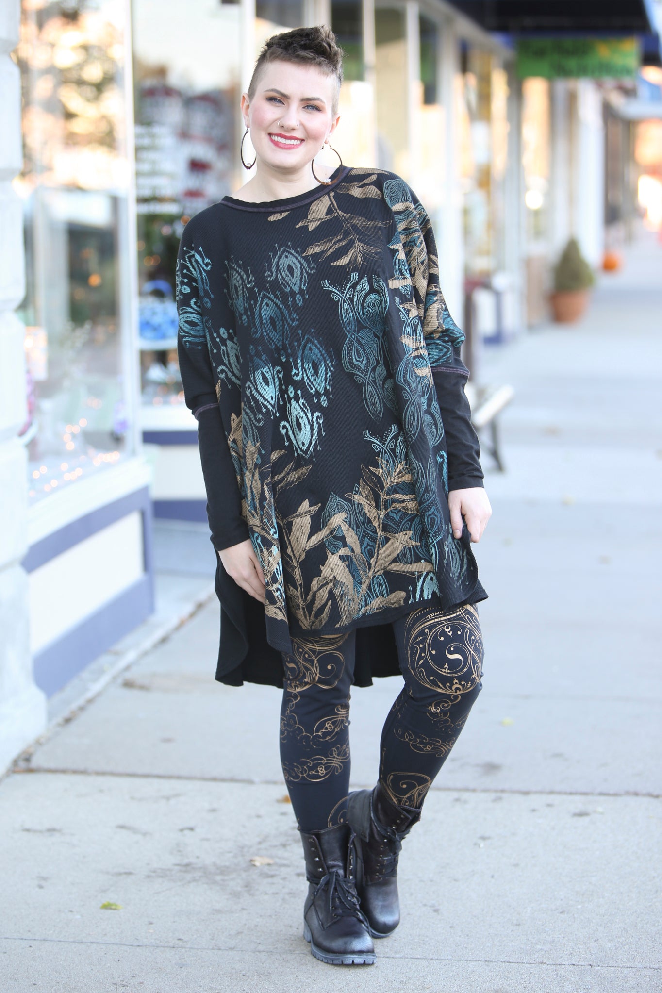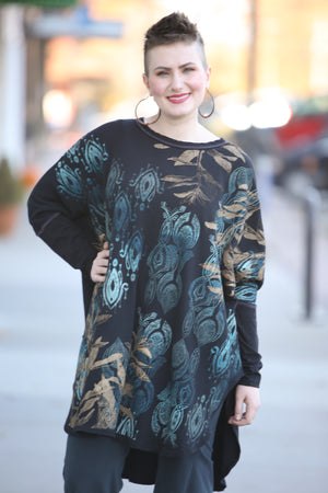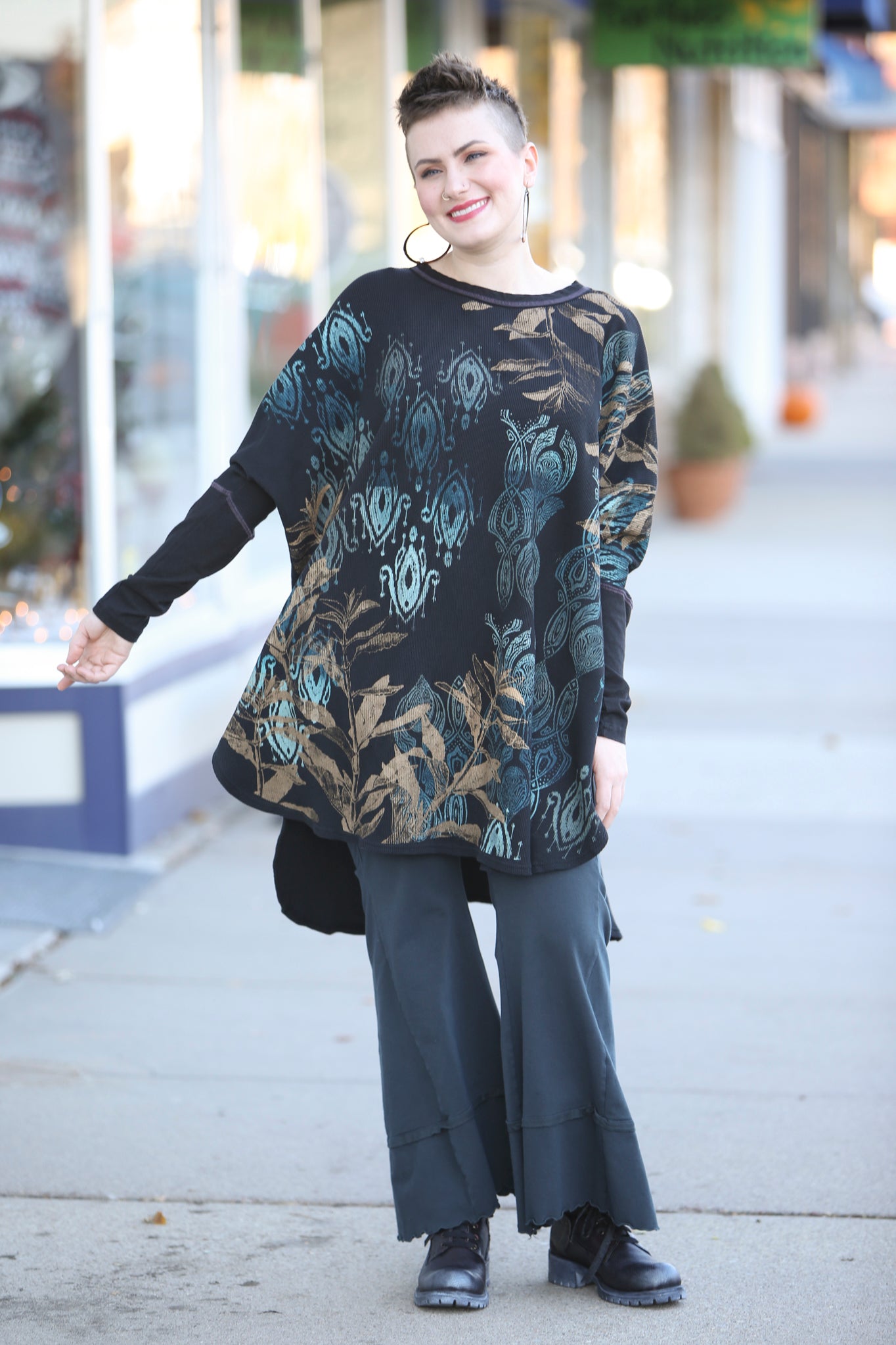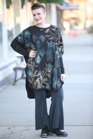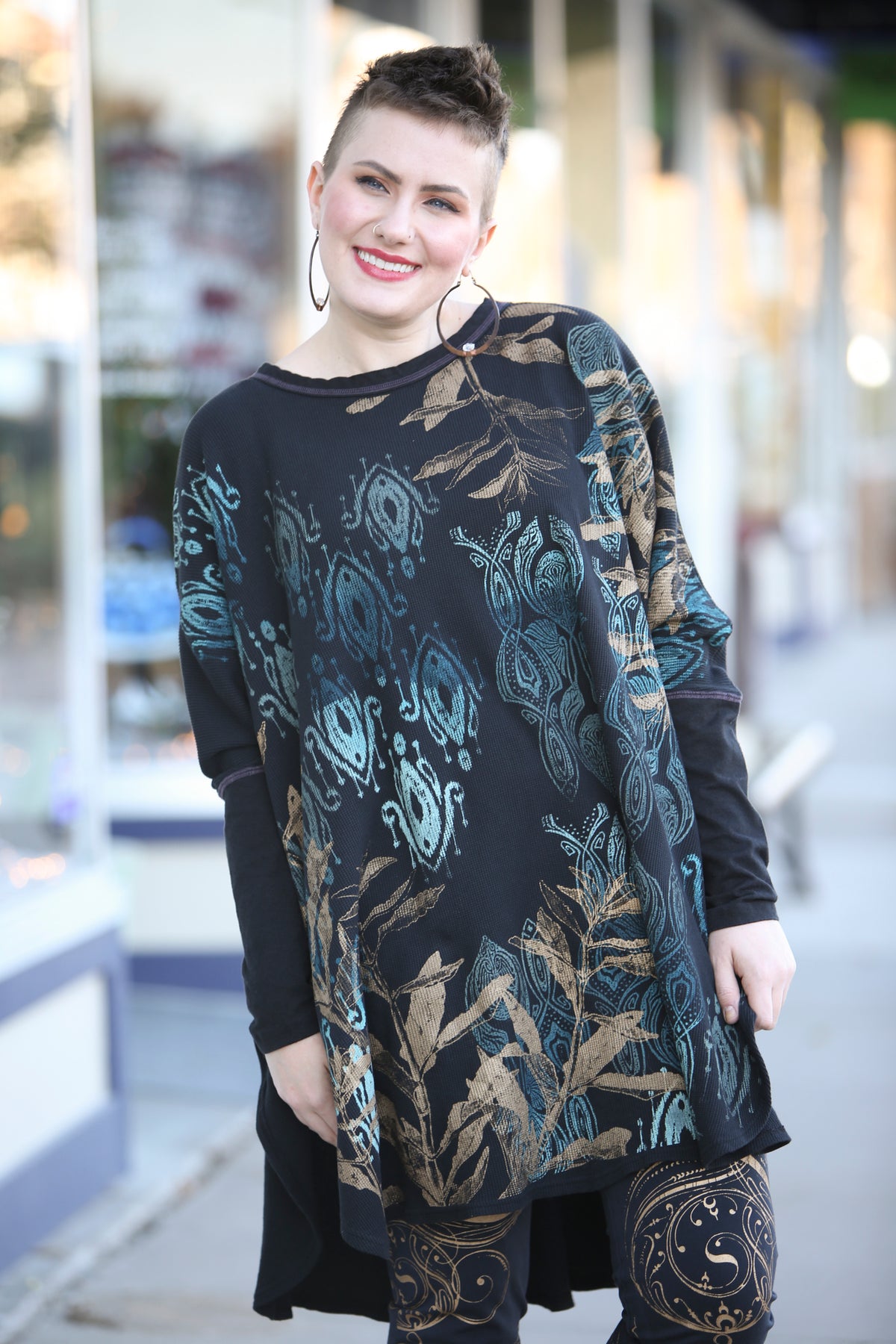 Vienna + Sage brings together the opulence of soft metallic bronze with the earthiness of sage leaves in this dramatically printed tunic. In black, with patinated tones of gradated soft turquoise and metals. It has black color block trim at the neck and sleeves with a thick cotton/hemp blend and features subtle contrasting stitching.