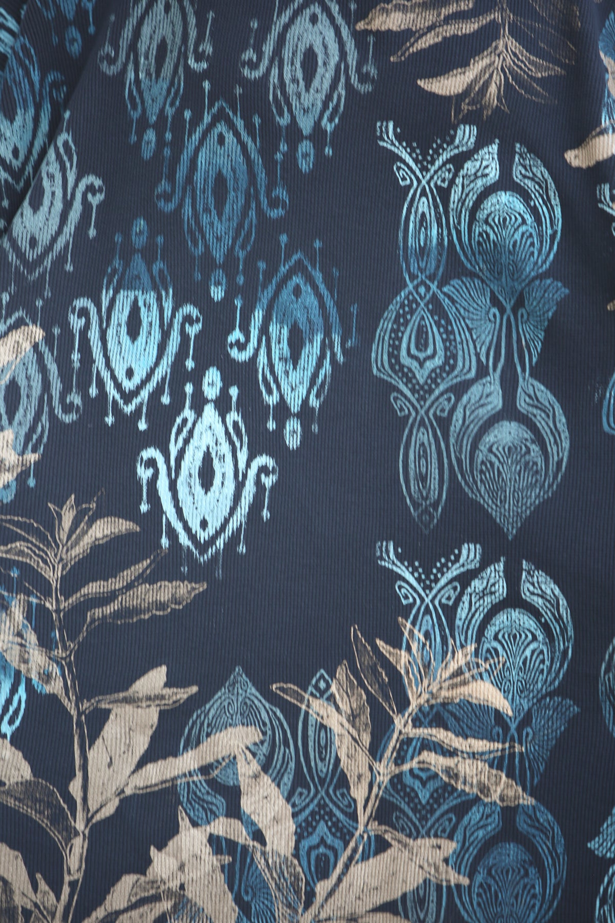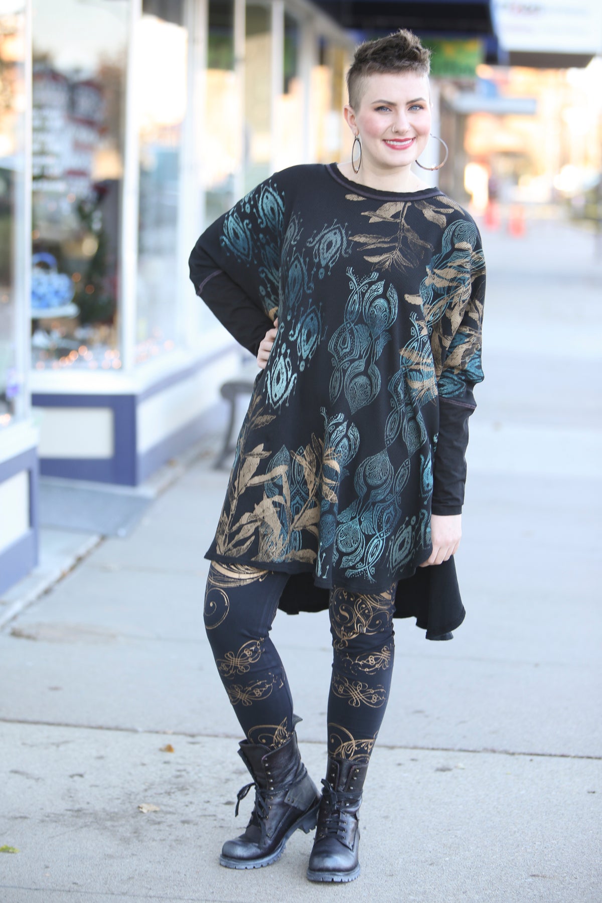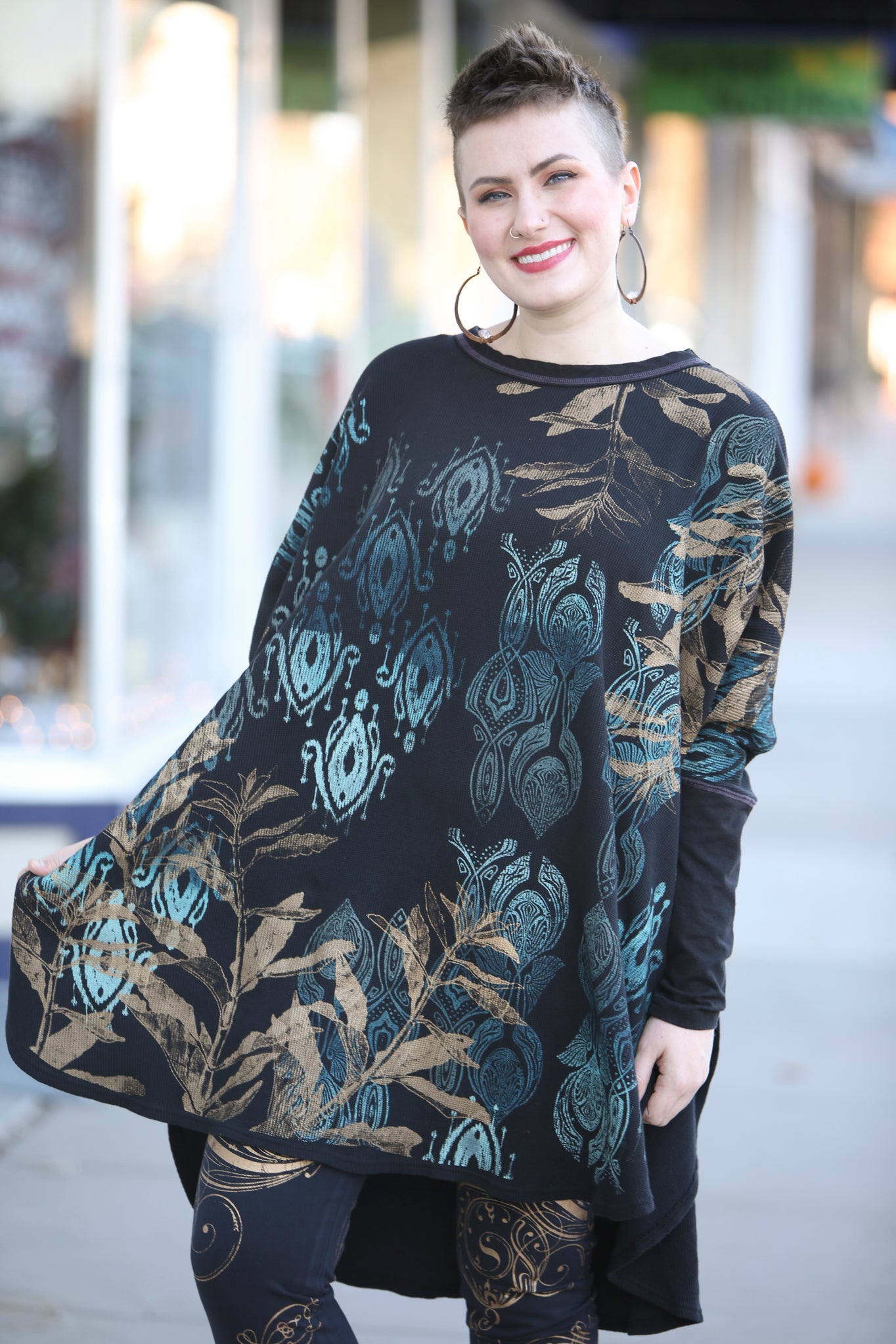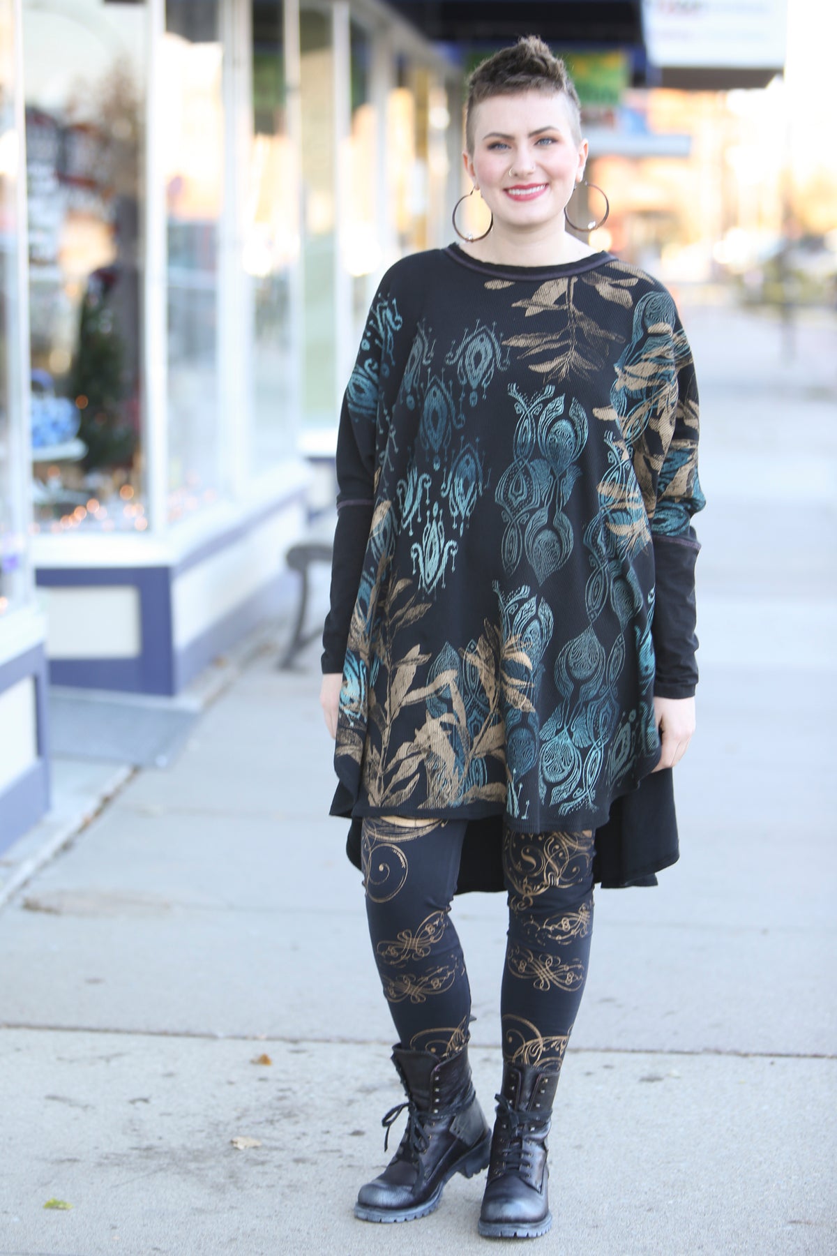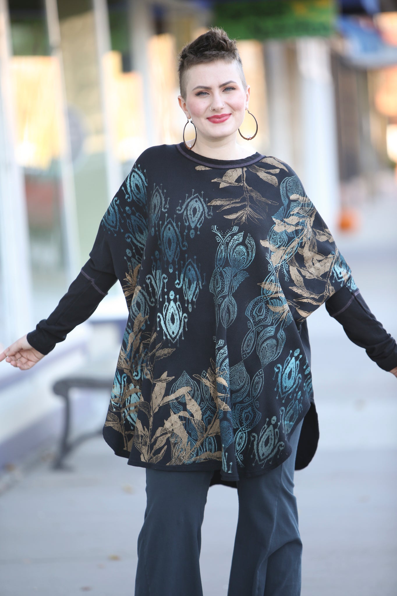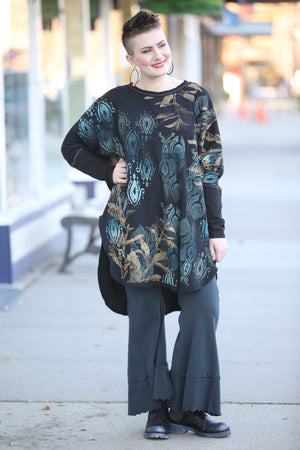 Vienna + Sage brings together the opulence of soft metallic bronze with the earthiness of sage leaves in this dramatically printed tunic. In black, with patinated tones of gradated soft turquoise and metals. It has black color block trim at the neck and sleeves with a thick cotton/hemp blend and features subtle contrasting stitching.