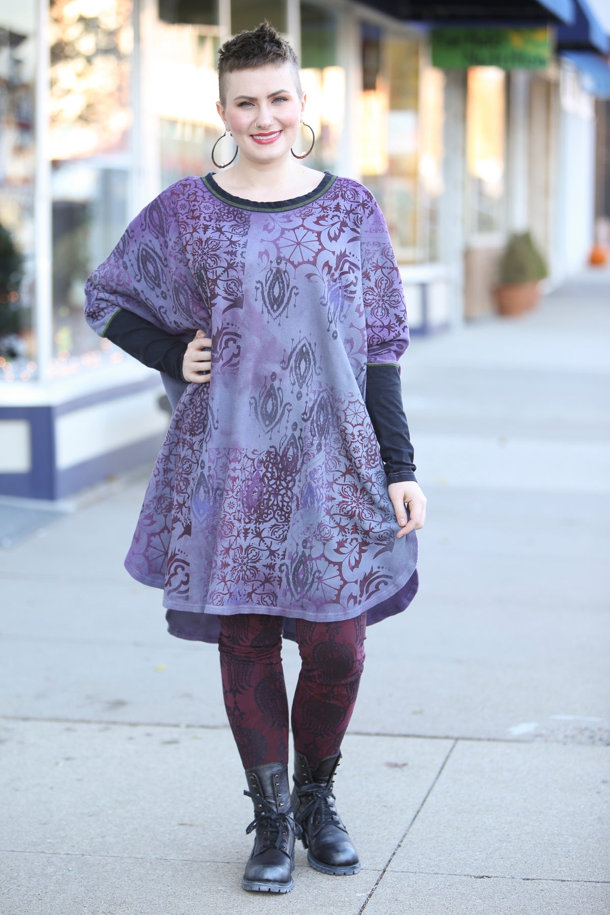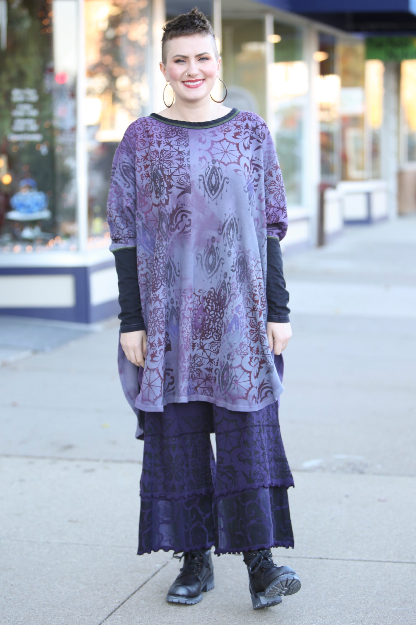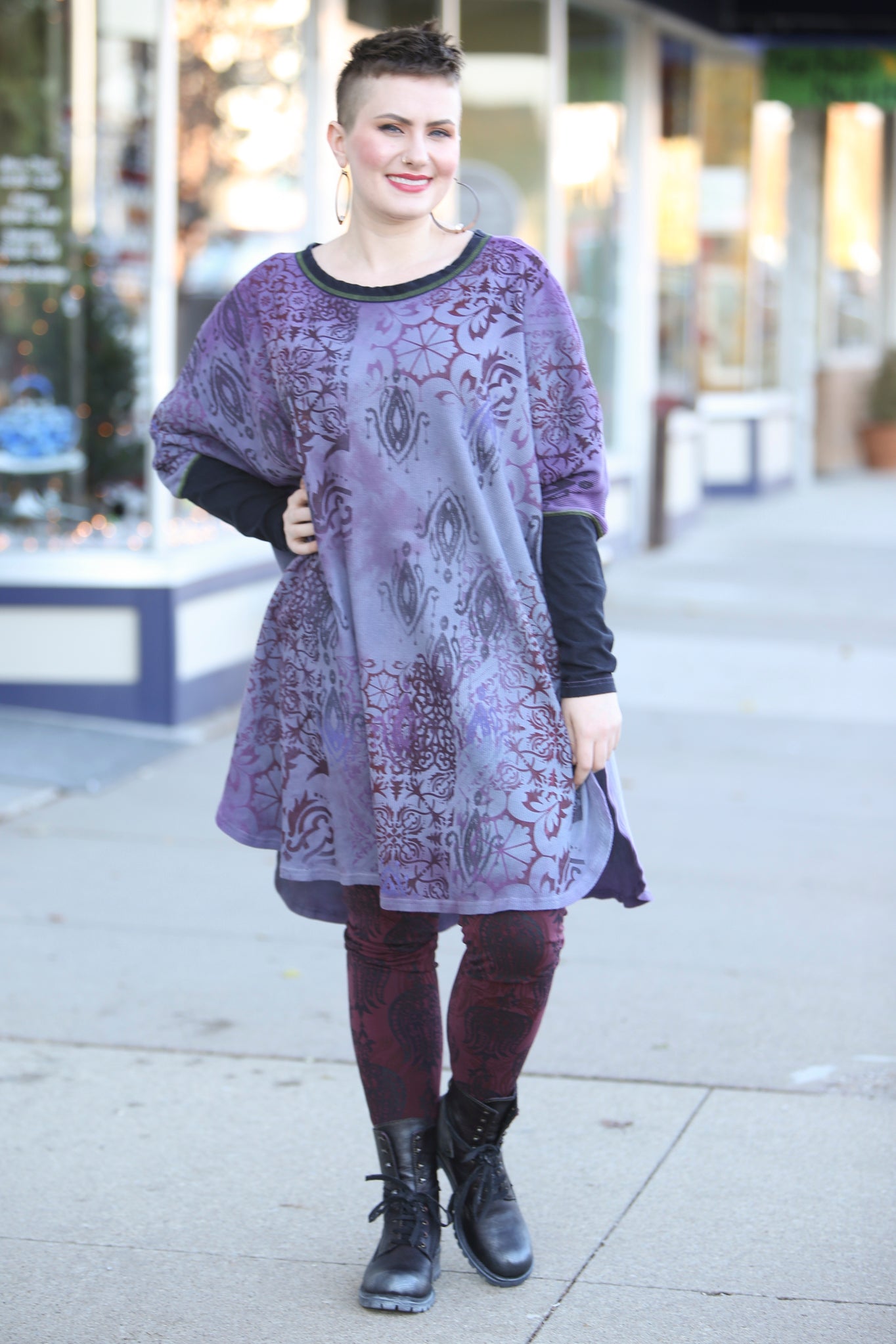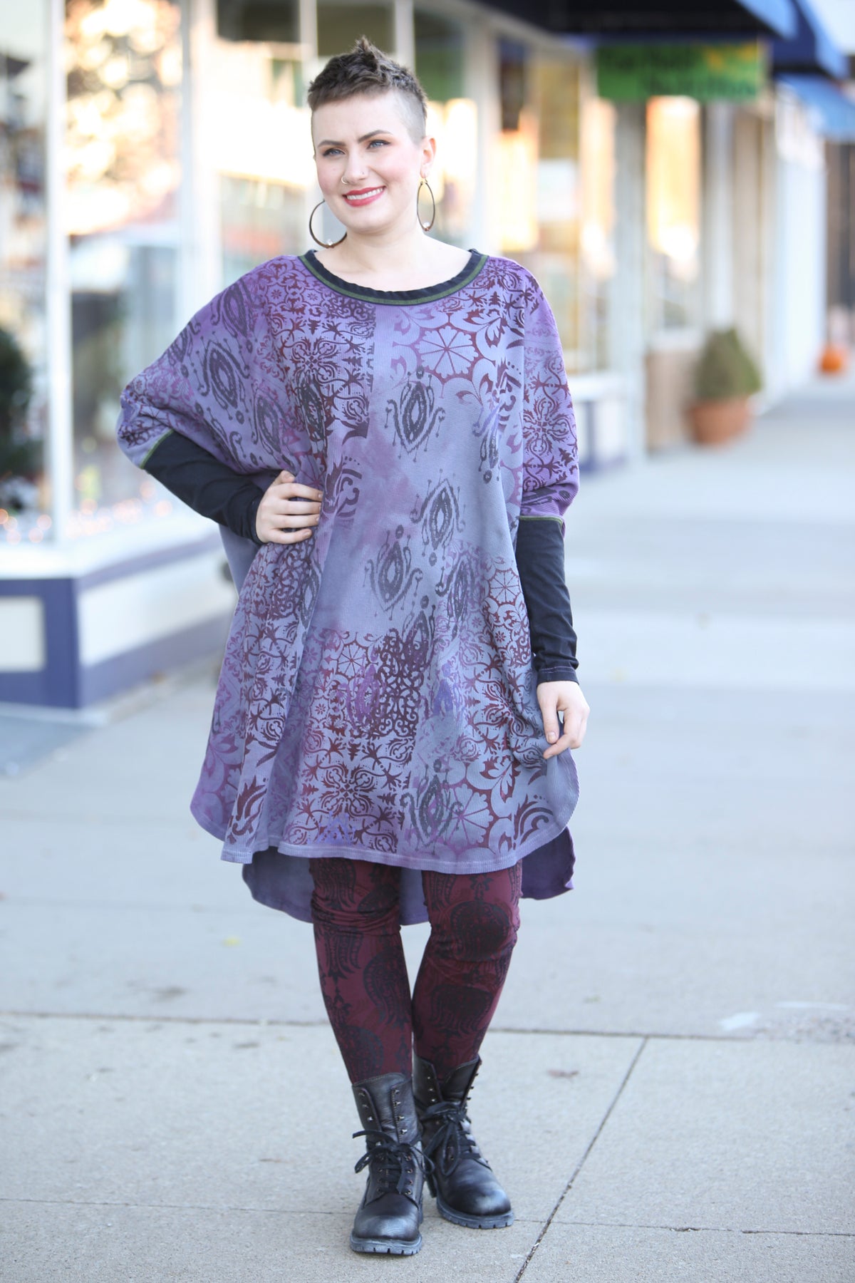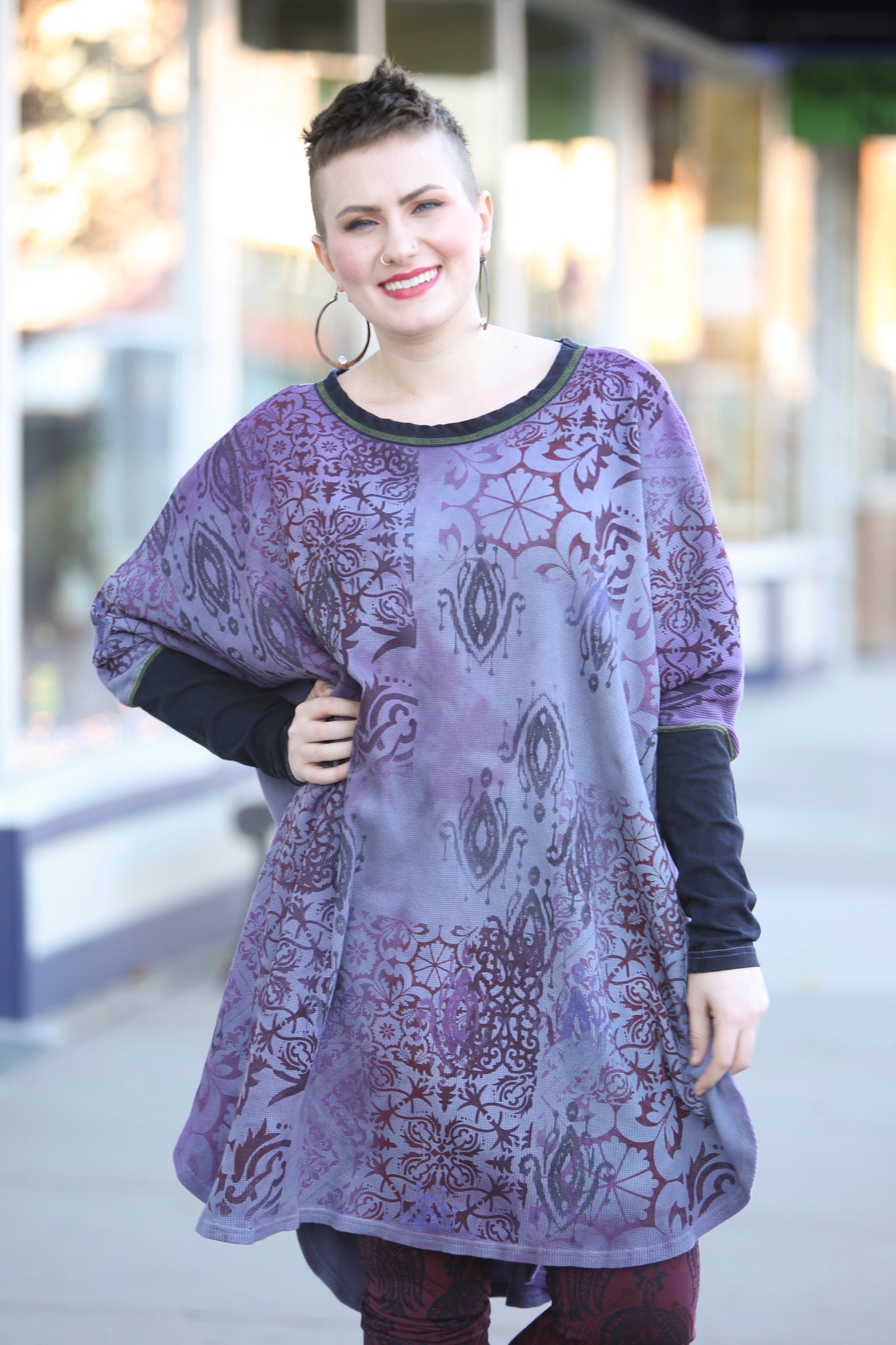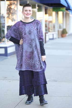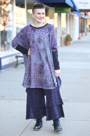This oversized hand dyed tunic has varied lights to medium tones of violets and purples. It is then hand printed with a mosaic of patterns in color harmonies. It looks great mixed with the Antique Burgundy Leggings, or the Royal Purple Petaloons. It has contrasting army green stitching, and color block neck and sleeve in black.
