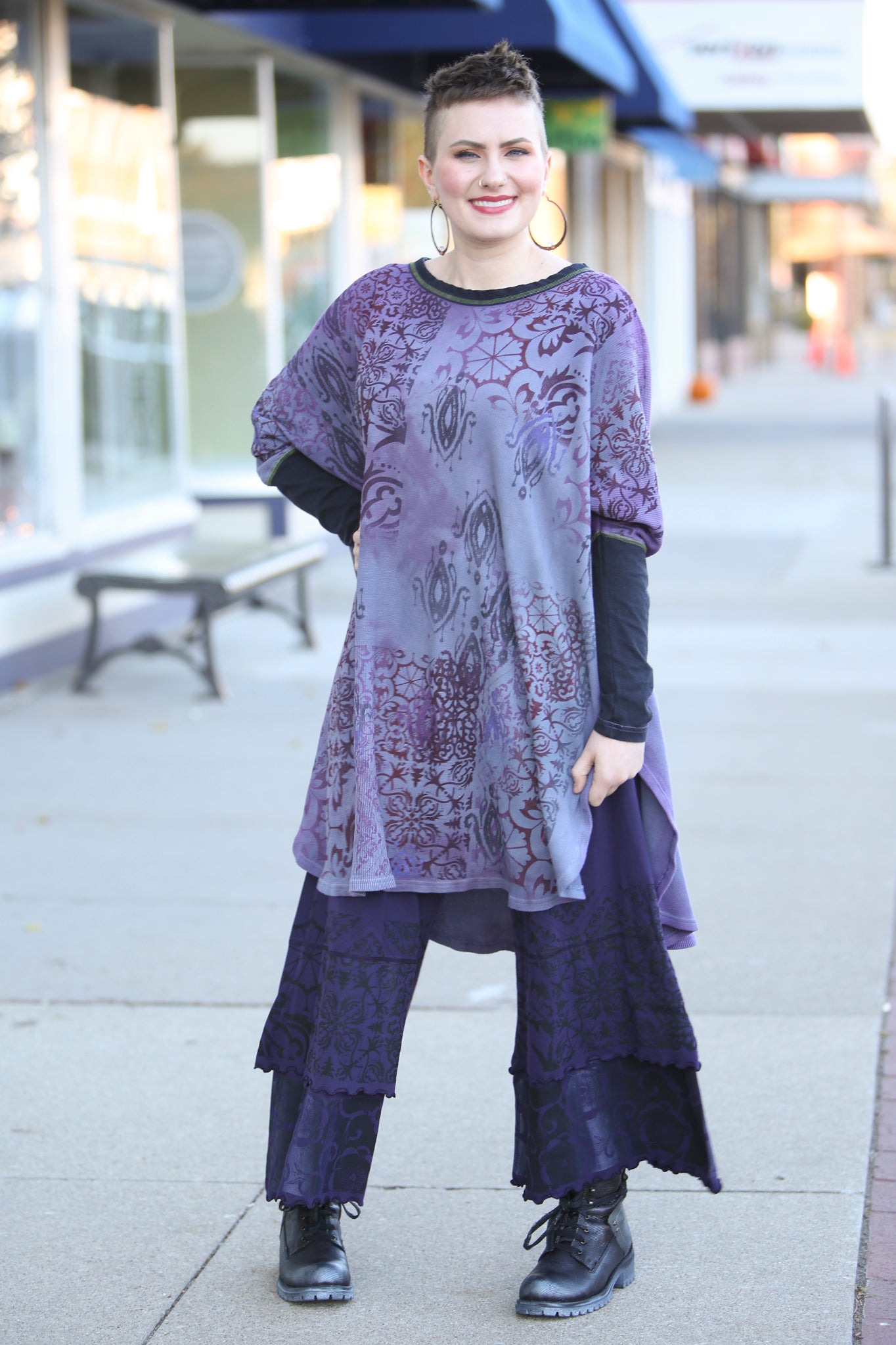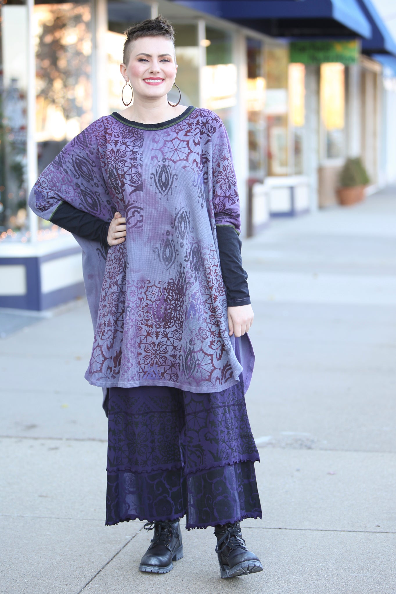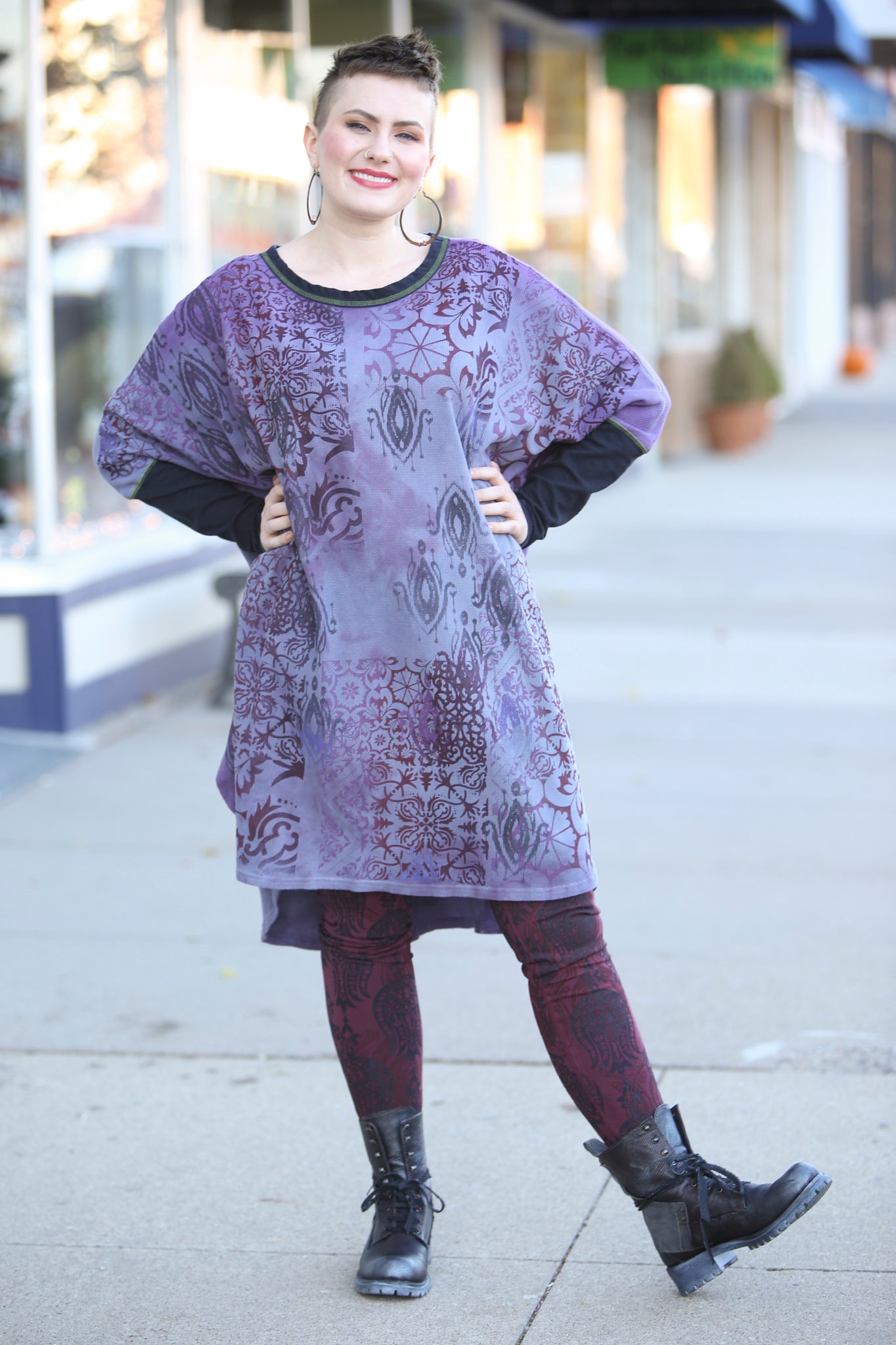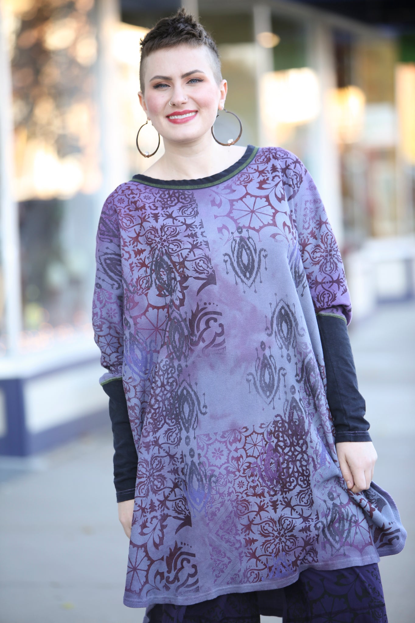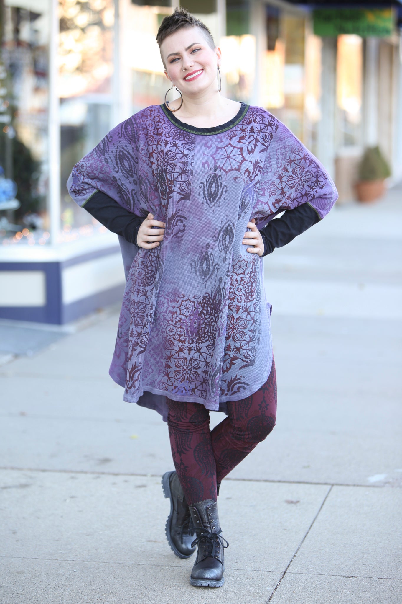 This oversized hand dyed tunic has varied lights to medium tones of violets and purples. It is then hand printed with a mosaic of patterns in color harmonies. It looks great mixed with the Antique Burgundy Leggings, or the Royal Purple Petaloons. It has contrasting army green stitching, and color block neck and sleeve in black.
