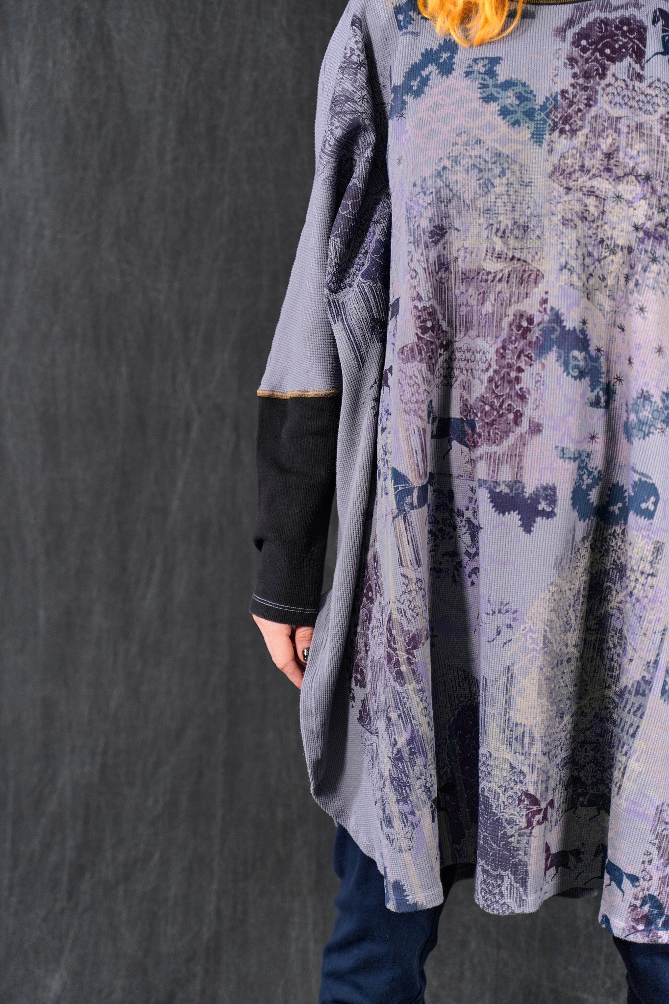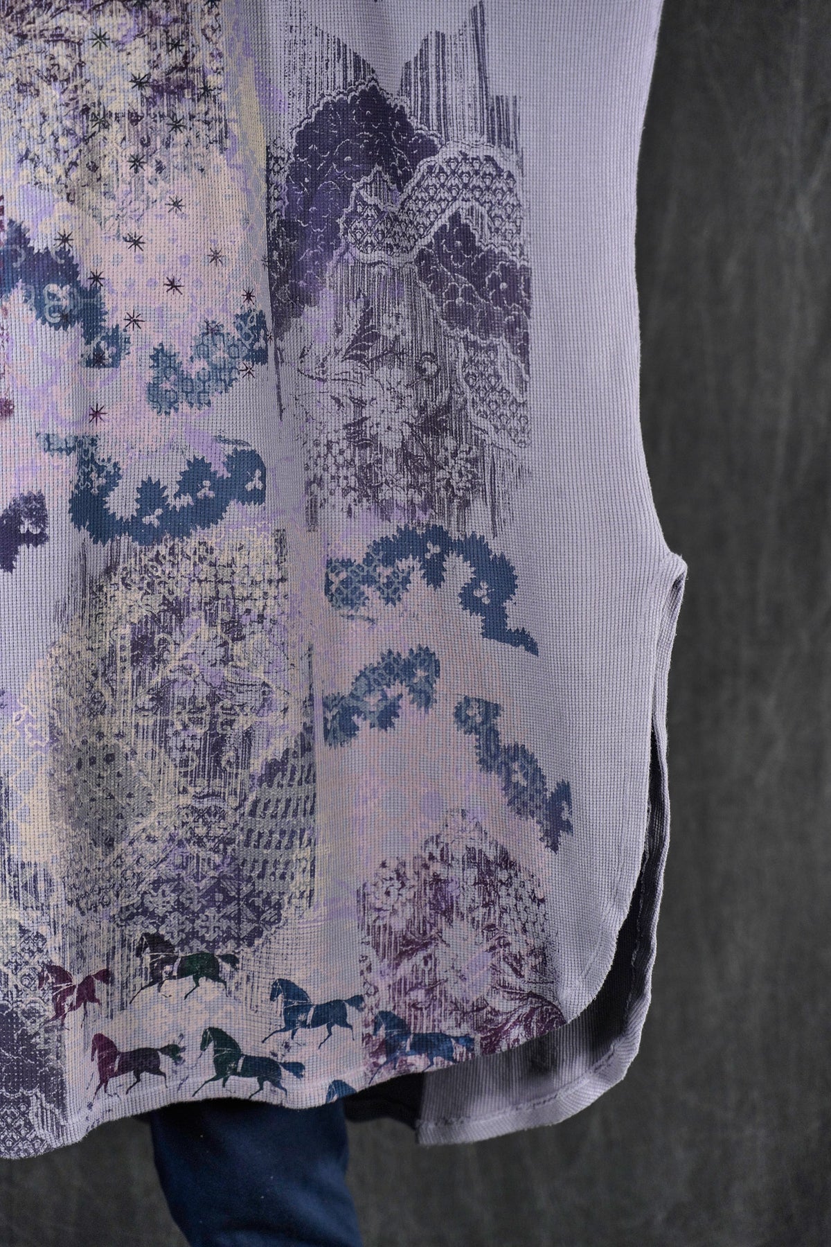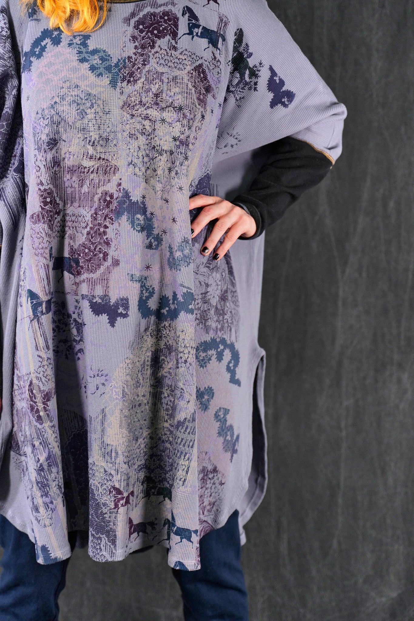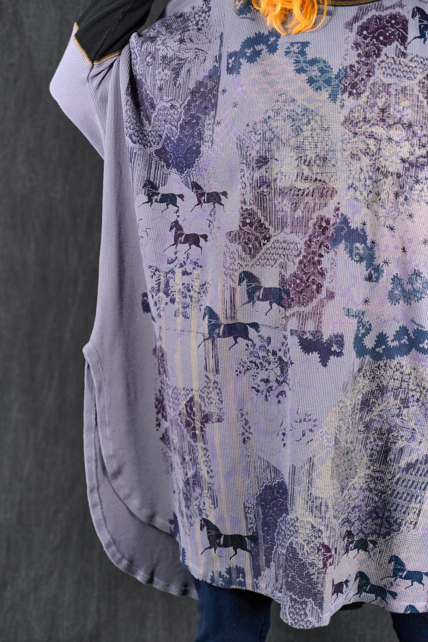 This organic, hand dyed ,stylish, one-size, thermal tunic is an instant classic. Color block trimmed at the neck and sleeves of a thick cotton lycra and contrasting thread stitching. Printed with a plethora of layered artful designs from our studio artists... a true work of art!
